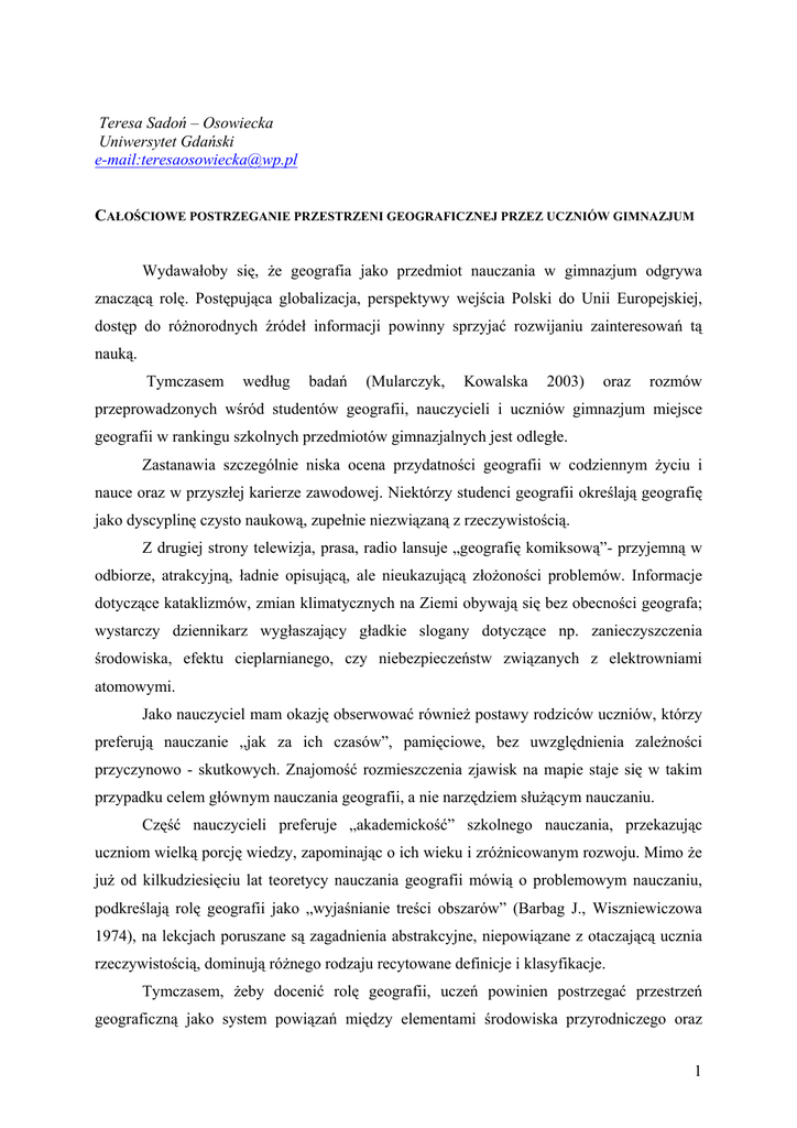 Teresa Sadoń – Osowiecka Uniwersytet Gdański e-mail:[email protected] CAŁOŚCIOWE POSTRZEGANIE PRZESTRZENI GEOGRAFICZNEJ PRZEZ UCZNIÓW GIMNAZJUM Wydawałoby się, że geografia jako przedmiot nauczania w gimnazjum odgrywa znaczącą rolę. Postępująca globalizacja, perspektywy wejścia Polski do Unii Europejskiej, dostęp do różnorodnych źródeł informacji powinny sprzyjać rozwijaniu zainteresowań tą nauką. Tymczasem według badań (Mularczyk, Kowalska 2003) oraz rozmów przeprowadzonych wśród studentów geografii, nauczycieli i uczniów gimnazjum miejsce geografii w rankingu szkolnych przedmiotów gimnazjalnych jest odległe. Zastanawia szczególnie niska ocena przydatności geografii w codziennym życiu i nauce oraz w przyszłej karierze zawodowej. Niektórzy studenci geografii określają geografię jako dyscyplinę czysto naukową, zupełnie niezwiązaną z rzeczywistością. Z drugiej strony telewizja, prasa, radio lansuje „geografię komiksową”- przyjemną w odbiorze, atrakcyjną, ładnie opisującą, ale nieukazującą złożoności problemów. Informacje dotyczące kataklizmów, zmian klimatycznych na Ziemi obywają się bez obecności geografa; wystarczy dziennikarz wygłaszający gładkie slogany dotyczące np. zanieczyszczenia środowiska, efektu cieplarnianego, czy niebezpieczeństw związanych z elektrowniami atomowymi. Jako nauczyciel mam okazję obserwować również postawy rodziców uczniów, którzy preferują nauczanie „jak za ich czasów”, pamięciowe, bez uwzględnienia zależności przyczynowo - skutkowych. Znajomość rozmieszczenia zjawisk na mapie staje się w takim przypadku celem głównym nauczania geografii, a nie narzędziem służącym nauczaniu. Część nauczycieli preferuje „akademickość” szkolnego nauczania, przekazując uczniom wielką porcję wiedzy, zapominając o ich wieku i zróżnicowanym rozwoju. Mimo że już od kilkudziesięciu lat teoretycy nauczania geografii mówią o problemowym nauczaniu, podkreślają rolę geografii jako „wyjaśnianie treści obszarów” (Barbag J., Wiszniewiczowa 1974), na lekcjach poruszane są zagadnienia abstrakcyjne, niepowiązane z otaczającą ucznia rzeczywistością, dominują różnego rodzaju recytowane definicje i klasyfikacje. Tymczasem, żeby docenić rolę geografii, uczeń powinien postrzegać przestrzeń geograficzną jako system powiązań między elementami środowiska przyrodniczego oraz 1 życiem i działalnością człowieka. Istota geografii zawiera się w jej interdyscyplinarnej jakości badań środowiska (przyrodniczego i kulturowego) i polega na przewidywaniu, wyjaśnianiu i kształtowaniu różnorodnych potrzeb człowieka wynikających z jego zamieszkiwania na Ziemi. Edukacja geograficzna powinna zmierzać ku kształceniu syntetycznej i spójnej wizji świata (Orłowska E. 1999). Układ treści Podstawy programowej kształcenia ogólnego (od miejsca Ziemi we Wszechświecie poprzez środowisko życia, gospodarowanie zasobami naturalnymi po przemiany społeczne i polityczne) oraz struktura większości podręczników gimnazjalnych sugeruje takie ujęcie nauczania geografii, ale postrzeganie tego przedmiotu przez otoczenie społeczne, jak wynika z wcześniejszych rozważań, jest odmienne. Nauczyciel, żeby osiągnąć całościowe postrzeganie przestrzeni geograficznej przez uczniów, musi przeciwstawić się presji otoczenia; delikatnie umiejscawiać nowe wiadomości i sytuacje w strukturze wiedzy ucznia, odwołując się do znanych mu z różnych źródeł informacji, pozwalając porządkować zebrane doświadczenia i osiągnąć stan równowagi poznawczej ucznia (Mietzel G. 2001). Ważnym aspektem może być odpowiednia motywacja i wyjaśnienie użyteczności pewnych problemów poruszanych na lekcjach w życiu. Wśród pytań zadawanych przez uczniów gimnazjum zdarzały się takie: „Po co uczyć się obliczania czasu słonecznego, kiedy na co dzień posługujemy się czasem urzędowym?”. Jeśli na lekcji ćwiczymy tylko mechaniczne obliczanie zadań, myślącemu uczniowi ta umiejętność wyda się w codziennym życiu nieprzydatna. Ale jeśli pokażemy powiązania między czasem słonecznym a czasem urzędowym (zadania typu: o której godzinie czasu urzędowego góruje Słońce w miejscowości X), umiejętność obliczania czasu słonecznego stanie się użyteczna, choćby dla doświadczalnego sprawdzenia własnych obliczeń. Inne stwierdzenie ucznia: „Po co mam uczyć się o typach rolnictwa? Nauczę się, jak będę rolnikiem.” świadczy o traktowaniu tego tematu w oderwaniu od ekonomicznych, społecznych i politycznych realiów codziennego życia. Uświadomieniu uczniowi znaczenia problemu może pomóc odwołanie się do aktualnych wiadomości, przeprowadzenie lekcji metodami aktywizującymi (np. dyskusja panelowa, „drzewko decyzyjne”, itp.). Zwrócić należy przy tym uwagę na użyteczność danych statystycznych nie tylko przy omawianiu tego zagadnienia. Wśród uczniów ciągle pokutuje przekonanie, że dane statystyczne są po to, by nauczyć się ich na pamięć, a nie są one dla nich źródłem pozwalającym na porównania, wyciąganie wniosków, analizowanie. 2 Uczniów czterech klas trzecich gdyńskich gimnazjów poproszono o przedstawienie w dowolnej formie (np. rysunek, schemat, opis, mapa mentalna), jak rozumieją pojęcie przestrzeni geograficznej. Ich prace można podzielić na cztery grupy: a) ujęcie holistyczne, wieloaspektowe (Ziemia we wszechświecie i z tego miejsca odniesienia do życia we wszystkich aspektach, włączając zagadnienia społecznopolityczne) – 30%; b) przestrzeń geograficzna jako powierzchnia Ziemi (rysunki mapy świata, bez ukazywania powiązań i zależności przyczynowo – skutkowych; stwierdzenia typu: „Przestrzenią geograficzną możemy nazwać całą Ziemię, ponieważ to właśnie ona jest przedmiotem badań i rozważań geograficznych”) – 30%; c) przestrzeń geograficzna jako środowis