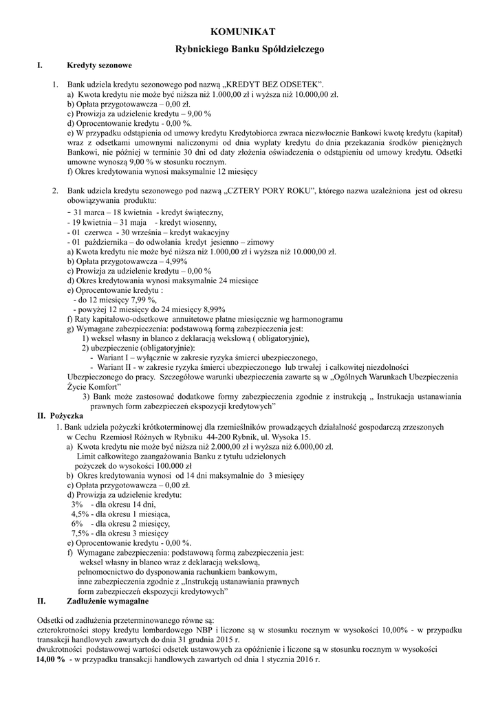 KOMUNIKAT Rybnickiego Banku Spółdzielczego I. Kredyty sezonowe 1. Bank udziela kredytu sezonowego pod nazwą „KREDYT BEZ ODSETEK”. a) Kwota kredytu nie może być niższa niż 1.000,00 zł i wyższa niż 10.000,00 zł. b) Opłata przygotowawcza – 0,00 zł. c) Prowizja za udzielenie kredytu – 9,00 % d) Oprocentowanie kredytu - 0,00 %. e) W przypadku odstąpienia od umowy kredytu Kredytobiorca zwraca niezwłocznie Bankowi kwotę kredytu (kapitał) wraz z odsetkami umownymi naliczonymi od dnia wypłaty kredytu do dnia przekazania środków pieniężnych Bankowi, nie później w terminie 30 dni od daty złożenia oświadczenia o odstąpieniu od umowy kredytu. Odsetki umowne wynoszą 9,00 % w stosunku rocznym. f) Okres kredytowania wynosi maksymalnie 12 miesięcy 2. Bank udziela kredytu sezonowego pod nazwą „CZTERY PORY ROKU”, którego nazwa uzależniona jest od okresu obowiązywania produktu: - 31 marca – 18 kwietnia - kredyt świąteczny, - 19 kwietnia – 31 maja - kredyt wiosenny, - 01 czerwca - 30 września – kredyt wakacyjny - 01 października – do odwołania kredyt jesienno – zimowy a) Kwota kredytu nie może być niższa niż 1.000,00 zł i wyższa niż 10.000,00 zł. b) Opłata przygotowawcza – 4,99% c) Prowizja za udzielenie kredytu – 0,00 % d) Okres kredytowania wynosi maksymalnie 24 miesiące e) Oprocentowanie kredytu : - do 12 miesięcy 7,99 %, - powyżej 12 miesięcy do 24 miesięcy 8,99% f) Raty kapitałowo-odsetkowe annuitetowe płatne miesięcznie wg harmonogramu g) Wymagane zabezpieczenia: podstawową formą zabezpieczenia jest: 1) weksel własny in blanco z deklaracją wekslową ( obligatoryjnie), 2) ubezpieczenie (obligatoryjnie): - Wariant I – wyłącznie w zakresie ryzyka śmierci ubezpieczonego, - Wariant II - w zakresie ryzyka śmierci ubezpieczonego lub trwałej i całkowitej niezdolności Ubezpieczonego do pracy. Szczegółowe warunki ubezpieczenia zawarte są w „Ogólnych Warunkach Ubezpieczenia Życie Komfort” 3) Bank może zastosować dodatkowe formy zabezpieczenia zgodnie z instrukcją „ Instrukacja ustanawiania prawnych form zabezpieczeń ekspozycji kredytowych” II. Pożyczka 1. Bank udziela pożyczki krótkoterminowej dla rzemieślników prowadzących działalność gospodarczą zrzeszonych w Cechu Rzemiosł Różnych w Rybniku 44-200 Rybnik, ul. Wysoka 15. a) Kwota kredytu nie może być niższa niż 2.000,00 zł i wyższa niż 6.000,00 zł. Limit całkowitego zaangażowania Banku z tytułu udzielonych pożyczek do wysokości 100.000 zł b) Okres kredytowania wynosi od 14 dni maksymalnie do 3 miesięcy c) Opłata przygotowawcza – 0,00 zł. d) Prowizja za udzielenie kredytu: 3% - dla okresu 14 dni, 4,5% - dla okresu 1 miesiąca, 6% - dla okresu 2 miesięcy, 7,5% - dla okresu 3 miesięcy e) Oprocentowanie kredytu - 0,00 %. f) Wymagane zabezpieczenia: podstawową formą zabezpieczenia jest: weksel własny in blanco wraz z deklaracją wekslową, pełnomocnictwo do dysponowania rachunkiem bankowym, inne zabezpieczenia zgodnie z „Instrukcją ustanawiania prawnych form zabezpieczeń ekspozycji kredytowych” II. Zadłużenie wymagalne Odsetki od zadłużenia przeterminowanego równe są: czterokrotności stopy kredytu lombardowego NBP i liczone są w stosunku rocznym w wysokości 10,00% - w przypadku transakcji handlowych zawartych do dnia 31 grudnia 2015 r. dwukrotności podstawowej wartości odsetek ustawowych za opóźnienie i liczone są w stosunku rocznym w wysokości 14,00 % - w przypadku transakcji handlowych zawartych od dnia 1 stycznia 2016 r.