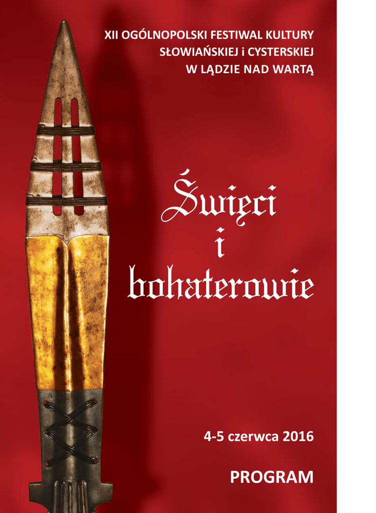 XII OGÓLNOPOLSKI FESTIWAL KULTURY SŁOWIAŃSKIEJ i CYSTERSKIEJ w Lądzie nad Wartą 4-5 czerwca 2016 PROGRAM XII OGÓLNOPOLSKI FESTIWAL KULTURY SŁOWIAŃSKIEJ i CYSTERSKIEJ w Lądzie nad Wartą ny, a także na podgrodzie, tętniące gwarem mieszkańców, nawoływaniem przekupniów, dźwiękami pracujących warsztatów i muzyką minstreli. Zasiądźmy przy ogniskach, by powspominać bohaterów i ich wielkie czyny, wstąpmy też do kościoła, by pomodlić się do Boga i naszych świętych patronów. Zapraszamy do Lądu nad Wartą, na XII Festiwal Kultury Słowiańskiej i Cysterskiej. Zabierzcie ze sobą rodziny i przyjaciół, zostawcie za sobą zgiełk codziennego życia, po- Każda epoka ma swoich bohaterów. Ludzie o nich mówią, piszą i pamiętają, opiewają ich czyny, wznoszą pomniki, poświęcają im dzieła artystyczne, szukajcie dobrej zabawy, nauki i natchnienia płynącego z przeszłości. Przyjedźcie! Czekamy! podziwiają i próbują naśladować, otaczają czcią i uznają za autorytety. Swoich bohaterów miało również średniowiecze. Wzorem władcy w zachodniej Europie był Karol Wielki, w Polsce natomiast – Bolesław Chrobry. Wiele podziwianych postaci wywodziło się z lokalnych opowieści i powszechnie znanych eposów rycerskich, część z nich, jak na przykład król Artur czy hrabia Roland, miała nawet swoje historyczne pierwowzory. Ówczesną galerię znakomitości wzbogacali święci – odważni misjonarze, męczennicy, niestrudzeni propagatorzy wiary chrześcijańskiej, czy też uciekający od zgiełku świata eremici. Dzięki swoim dokonaniom stali się nowymi herosami epoki, a ich kult, rozwijający się już po śmierci, pozwalał kształtować postawy religijne i etyczne. Nie ulega wątpliwości, że na miano bohatera trzeba sobie zasłużyć, ale prawdą jest też, iż trafny wybór bohatera, owego autorytetu i wzoru do naśladowania, pozwala być człowiekowi lepszym. Ich obecność w szerszej pamięci społecznej ma też ogromne znaczenie w kształtowaniu kultury oraz tożsamości wspólnoty – nas, Polaków i nas, Europejczyków. Spotkajmy się zatem i porozmawiajmy o naszych ulubionych postaciach. Posłuchajmy opowieści o wielkich królach, dzielnych wojach i rycerzach, o świętych, którzy uczyli godnego życia w trudnych czasach. Przenieśmy się na chwilę do wieków średnich, do rozmodlonego klasztoru, do grodu, gdzie wojowie sposobią się do nowej woj- Michał Brzostowicz k l a s ztor 9.30 Rozpoczęcie Festiwalu 9.30-19.00 W grodzie i na podgrodziu: warsztaty rzemieślników, potyczki wojów, kramy kupieckie, codzienna krzątanina oraz rozmaite sceny z życia dawnych Słowian 9.30-14.00 Konkursy i zajęcia edukacyjne dla dzieci z zakresu przyrody (punkt informacyjny Zespołu Parków Krajobrazowych Województwa Wielkopolskiego w Poznaniu) 9.30-14.00 „Leśny koncert” – zajęcia edukacyjne z zakresu przyrody (tablica edukacyjna w Ośrodku Edukacji Przyrodniczej) 10.00-19.00 „Bohaterzy Festiwalu” – wystawa fotografii Jerzego Sznajdera (Ośrodek Edukacji Przyrodniczej) 10.00-14.00 „Kreatywnie i przyrodniczo” – warsztaty plastyczne z wyklejania (punkt informacyjny Zespołu Parków Krajobrazowych Województwa Wielkopolskiego w Poznaniu) 11.30 Koncert zespołu „Góra Trolla” 12.00-13.00 „W trosce o lokalną ochronę przyrody. 10 lat działalności Ośrodka Edukacji Przyrodniczej w Lądzie” – wykład Katarzyny Jasińskiej (sala konferencyjna w Ośrodku Edukacji Przyrodniczej) 12.00-14.00 „Bohater w kapturze. Zostań dziecięcym Robinem Hoodem” – zabawy edukacyjne dla dzieci przygotowane przez Muzeum Archeologiczne w Poznaniu 13.00 Warsztaty tańców średniowiecznych (grupa „LA DAME”) 14.00-15.00 Projekcje filmów o parkach krajobrazowych (sala konferencyjna w Ośrodku Edukacji Przyrodniczej) 15.00 Powitanie Gości 15.30 Koncert zespołu „Góra Trolla” 16.00-16.30 Warsztaty tańców średniowiecznych (grupa „LA DAME”) 16.45 „Legenda o Pięciu Braciach Męczennikach” – inscenizacja historyczna 17.15 „Bitwa bohaterów” – inscenizacja walk wczesnośredniowiecznych 18.00 Koncert zespołu „Góra Trolla” 9.30-18.00 Wokół klasztoru średniowiecznego: iluminowanie ksiąg, prasa Gutenberga, warsztat witrażysty (krużganki i sień) 9.30-18.00 „Uchylając rąbka tajemnicy. Czasy świętych i bohaterów” – piknik naukowy (krużganki klasztoru) 9.30-18.00 „Broń dawnych bohaterów” – wystawa archeologiczna (Galeria) 9.30-18.00 „Wizerunki świętych” – prezentacja multimedialna (Galeria) 9.30-18.00 „Tajemnice relikwiarza” – prezentacja tkaniny herbowej oraz zespołu tkanin dekorujących relikwie Undecim Millum Virginum w ołtarzu św. Urszuli w Lądzie (Sala Opacka) 10.00-18.00 Zwiedzanie klasztoru z przewodnikiem 10.00-18.00 W obozie średniowiecznych rycerzy: strzelanie z łuku, rzut oszczepem i toporem, warsztaty walki mieczem długim, walki z rycerzem, pokazy średniowiecznej broni palnej, gry i zabawy dla dzieci (park przy kościele p.w. Najświętszej Marii Panny i Św. Mikołaja) 12.30 Przedstawienie Teatru Jarmarcznego Grupy Cives Glogoviae 1253 13.00-15.00 „Święci i bohaterowie w kulturze średniowiecza” – wykłady popularnonaukowe, cz. I (Sala Opacka): • „Jeden ideał – różne drogi: św. Wojciech Sławnikowic i św. Otton z Bambergu na apostolskim szlaku” (prof. Stanisław Rosik) • „Jak święci budowali w średniowieczu poczucie wspólnoty” (prof. Leszek Wetesko) • „Na równi z mężczyznami – wyjątkowe kobiety średniowiecza” (prof. Dorota Strzelczyk) 14.30-16.30 „Aureola dla każdego czyli jak zapracować na miano świętego” – warsztaty edukacyjne dla dzieci przygotowane przez Muzeum Archeologiczne w Poznaniu (Galeria) 14.00 Przedstawienie Teatru Jarmarcznego Grupy Cives Glogoviae 1253 (obóz rycerski) 14.30 Pokazy walk średniowiecznych rycerzy (park przy kościele p.w. Najświętszej Marii Panny i Św. Mikołaja) 15.