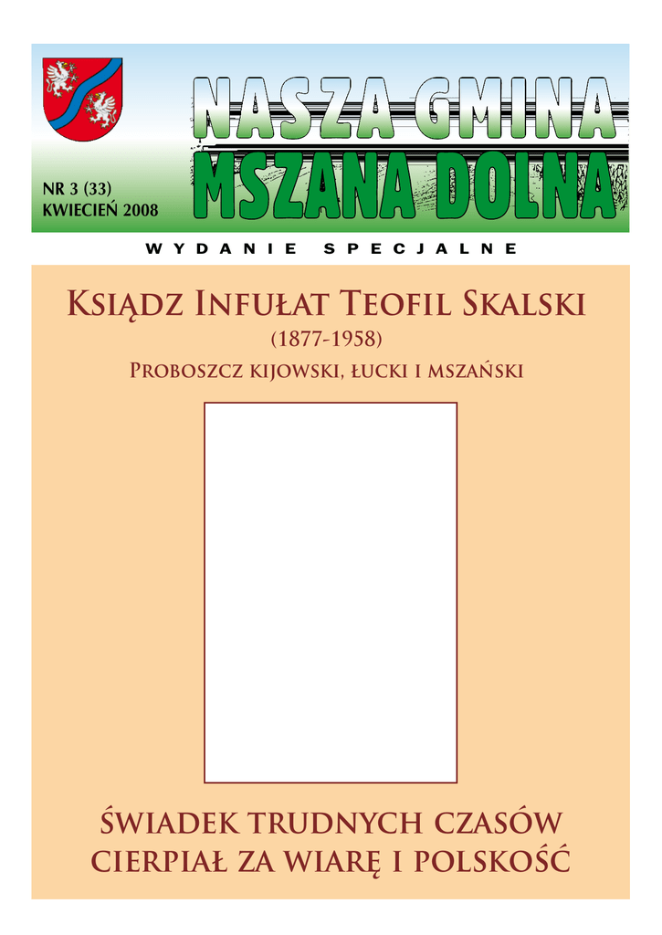 NR 3 (33) KWIECIEŃ 2008 W Y D A N I E S P E C J A L N E Ksiądz Infułat Teofil Skalski (1877-1958) Proboszcz kijowski, łucki i mszański świadek trudnych czasów cierpiał za wiarę i polskość Rok obchodów 50-tej rocznicy śmierci Księdza Infułata Teofila Skalskiego Księga odnalezionej pamięci Po latach prześladowań odradza się Kościół katolicki na Wschodzie: w Rosji, na Ukrainie i Białorusi. Wydaje owoc praca kapłanów-męczenników takich jak Ks. Infułat Teofil Skalski, administrator apostolski diecezji Łucko-Żytomierskiej po rewolucji 1917 r., więziony przez 6 lat w Rosji sowieckiej, wyrwany z rąk komunistycznych siepaczy przez władze II RP w 1932 r. w drodze wymiany więźniów politycznych. Ostatni okres swojego burzliwego i pracowitego życia Ks. Skalski spędził w Mszanie Dolnej, gdzie przez 16 lat pełnił funkcję proboszcza parafii św. Michała Archanioła. Dobrze się zapisał w pamięci parafian. Zmarł w Mszanie Dolnej 12 kwietnia 1958 r. i tu został pochowany. W sobotę, 12 kwietnia br., rozpocznie się „Rok obchodów 50-tej rocznicy śmierci Księdza Infułata Teofila Skalskiego”. Organizatorzy - Gmina Mszana Dolna i Parafia św. Michała Archanioła - ułożyli dokładny harmonogram różnych działań, mających na celu uczczenie tego niezwykłego kapłana, prawdziwego Księcia Kościoła, który żył wśród nas. Obchody zainauguruje Msza św. w intencji śp. Ks. Infułata Teofila Skalskiego. W tym samym dniu, młodzież przedstawi program słowno-muzyczny pt. „Życie Księdza Infułata”, po czym nastąpi otwarcie „Księgi odnalezionej pamięci o Infułacie Skalskim” . - Zapraszamy wszystkich mieszkańców, którzy zetknęli się z Księdzem Infułatem Skalskim oraz rodziny, w których żyją jeszcze wspomnienia o Księdzem Skalskim, by opowiedzieli o nich – zachęcają organizatorzy. Przez cały rok, w każdą sobotę, w parafii będą dyżurować młodzi, przeszkoleni redaktorzy, którzy zarejestrują wspomnienia i relacje. Uczniowie z dyktafonem i aparatem fotograficznym odwiedzą także w domach tych, co będą chcieli coś opowiedzieć. W maju zostanie ogłoszony konkurs na pomnik Ks. Infułata i zagospodarowanie placu, na którym stanie monument. Otwarta też zostanie debata publiczna na temat: „Jaki to powinien być pomnik?”. Każdy będzie się mógł wypowiedzieć. Przez 12 miesięcy prowadzone też będą działania charytatywne nawiązujące do pracy filantropijnej i dzieł miłosierdzie Ks. Infułata na Wschodzie i w Mszanie Dolnej. Raz na kwartał będą urządzane wieczornice – spotkania z młodzieżą. Ich tematem będą wypowiedzi Ks. Infułata Skalskiego na temat patriotyzmu, zawarte w Jego książce „Terror i cierpienie”, w której opisał swoją gehennę w Rosji sowieckiej. Kapłani z parafii św. Michała Archanioła przez cały rok jedną niedzielę w miesiącu poświęcą na głoszenie kazań, poświęconych życiu i dziełu Ks. Infułata T. Skalskiego. Delegacje Gminy i Parafii odbędą także podróż „Śladami ks. infułata Teofila Skalskiego” do miejsc, stanowiących etapy Jego życiowej wedrówki: Żytomierz – Kijów – Łuck. Uroczystość odsłonięcia pomnika Ks. Skalskiego i otwarcia placu nazwanego Jego imieniem zaplanowano na 12 kwietnia 2009 r. Wtedy też odbędzie się promocja wydawnictwa „Księga odnalezionej pamięci Ks. Infułata Teofila Skalskiego”. Ks. Jerzy Raźny, proboszcz parafii św. Michała Archanioła w Mszanie Dolnej Tadeusz Patalita, wójt gminy Mszana Dolna Postać Księdza Infułata Teofila Skalskiego, który przez 16 lat proboszczował w Mszanie Dolnej, została zapomniana. Kto to był Ksiądz Skalski i jakie zasługi oddał Kościołowi na Wschodzie dowiedziałem się przypadkowo. Podczas jednej ze swoich podróży na Ukrainę, w katedrze we Lwowie, natknąłem się na polską gazetę, gdzie opisano heroiczną posługę kapłańską Infułata Skalskiego w Rosji bolszewickiej i cierpienia, jakich doznał od komunistów. Dopiero wtedy uświadomiłem sobie jakiego człowieka mieliśmy u siebie. Jeszcze we Lwowie zrodziła się we mnie myśl, że musimy jakoś uczcić tego wybitnego kapłana i wielkiego polskiego patriotę, dla mnie - kandydata na ołtarze. Podzieliłem się swoimi myślami z księdzem Zdzisławem Balonem, proboszczem parafii świętego Michała Archanioła w Mszanie Dolnej, który gorąco mnie poparł. W następcy ksiedza Balona znalazłem sprzymierzeńca. Ksiądz proboszcz Jerzy Raźny zwrócił uwagę na zbliżająca się 50. rocznicę śmierci Księdza Infułata Skalskiego, jako dogodny moment uczczenia tego niezwykłego kapłana. W lipcu 2007 roku objąłem urząd Proboszcza w Mszanie Dolnej, w parafii świętego Michała. Przyjechałem na miejsce początkiem czerwca i wtedy po raz pierwszy obejrzałem „galerię” moich poprzedników, umieszczoną w stylizowanym podziemiu służącym dziś jako salon i jadalnia. Uświadomiłem sobie wyjątkowość i wielkość moich poprzedników. Wśród nich szczególnie wyróżniała się podobizna Ks. Infułata, pełna majestatu i wyjątkowej godności, autorstwa nieżyjącego już miejscowego malarza Stanisława Ciężadlika. Dziś, gdy przychodzi nam przeżywać 50-tą rocznicę Jego śmierci, żywię wielką nadzieję, że ta wyjątkowa postać kapłana i patrioty zostanie na nowo ukazana zwłaszcza młodym, w świecie gdzie tak brakuje autorytetów i prawdziwych wartości. Ten bohater obrony wiary i niepodległości, ze wszech miar na to zasługuje. Jego imię na stałe zostaje wpisane do panteonu tych, dla których Bóg, Honor i Ojczyzna znaczyło wiele więcej, niż tylko słowa umieszczane na sztandarach. 2 Życiorys Ks. Infułata Teofila Skalskiego Z Podola na ziemię zagórzańską sce odrodzonej otrzymał odznaczenie „Za walkę o szkołę polską”, które – spośród innych – wyjątkowo sobie cenił. W 1907 r. odbył podróż w Poznańskie, gdzie spotkał się m.in. z ks. Piotr