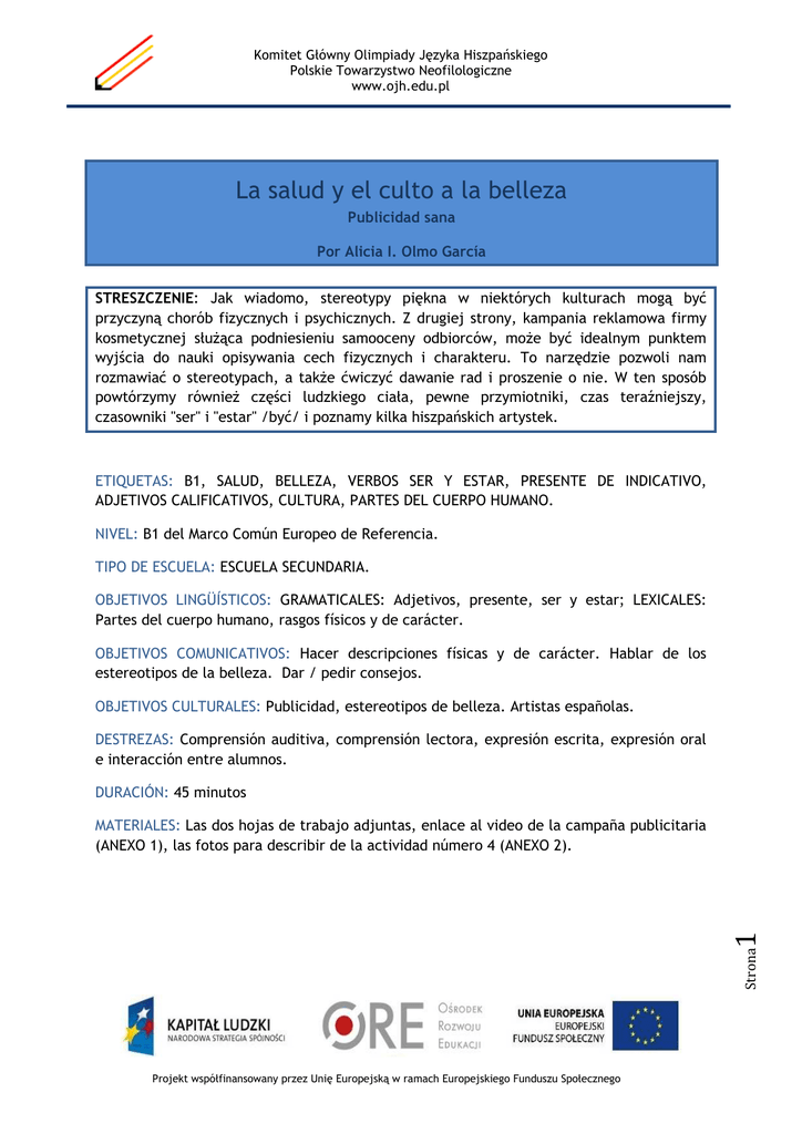 Komitet Główny Olimpiady Języka Hiszpańskiego Polskie Towarzystwo Neofilologiczne www.ojh.edu.pl La salud y el culto a la belleza Publicidad sana Por Alicia I. Olmo García STRESZCZENIE: Jak wiadomo, stereotypy piękna w niektórych kulturach mogą być przyczyną chorób fizycznych i psychicznych. Z drugiej strony, kampania reklamowa firmy kosmetycznej służąca podniesieniu samooceny odbiorców, może być idealnym punktem wyjścia do nauki opisywania cech fizycznych i charakteru. To narzędzie pozwoli nam rozmawiać o stereotypach, a także ćwiczyć dawanie rad i proszenie o nie. W ten sposób powtórzymy również części ludzkiego ciała, pewne przymiotniki, czas teraźniejszy, czasowniki "ser" i "estar" /być/ i poznamy kilka hiszpańskich artystek. ETIQUETAS: B1, SALUD, BELLEZA, VERBOS SER Y ESTAR, PRESENTE DE INDICATIVO, ADJETIVOS CALIFICATIVOS, CULTURA, PARTES DEL CUERPO HUMANO. NIVEL: B1 del Marco Común Europeo de Referencia. TIPO DE ESCUELA: ESCUELA SECUNDARIA. OBJETIVOS LINGÜÍSTICOS: GRAMATICALES: Adjetivos, presente, ser y estar; LEXICALES: Partes del cuerpo humano, rasgos físicos y de carácter. OBJETIVOS COMUNICATIVOS: Hacer descripciones físicas y de carácter. Hablar de los estereotipos de la belleza. Dar / pedir consejos. OBJETIVOS CULTURALES: Publicidad, estereotipos de belleza. Artistas españolas. DESTREZAS: Comprensión auditiva, comprensión lectora, expresión escrita, expresión oral e interacción entre alumnos. DURACIÓN: 45 minutos Strona 1 MATERIALES: Las dos hojas de trabajo adjuntas, enlace al video de la campaña publicitaria (ANEXO 1), las fotos para describir de la actividad número 4 (ANEXO 2). Projekt współfinansowany przez Unię Europejską w ramach Europejskiego Funduszu Społecznego Komitet Główny Olimpiady Języka Hiszpańskiego Polskie Towarzystwo Neofilologiczne www.ojh.edu.pl PROCEDIMIENTO: 1. Con la presentación de la imagen de una campaña publicitaria como fondo, empezamos hablando un poco sobre como nos vemos físicamente y como creemos que nos ven los demás. Discutimos sobre que son los estereotipos y si son iguales en todas las culturas. Preguntamos como se ven fisicamente y si cambiarían algo de su cuerpo. Trabajamos un poco el vocabulario que aparecerá en la campaña o que tendrán que utilizar para hacer las siguientes actividades. 2. Les pedimos que discutan con sus compañeros, por parejas, sobre las cuestiones de la actividad 1. de la hoja de trabajo 1. Tras un intervalo de unos 5 minutos, hacemos una breve puesta en común de las respuestas dadas por sus compañeros. 3. Les decimos que vamos a ver una campaña publicitaria realizada por una empresa de cosméticos y les pedimos que observen las imágenes que aparecen y que apunten algunas características conforme a lo expuesto en el actividad 2. de la hoja de trabajo 1, que leerán previamente. 4. Después de ver el video, por parejas contestan a las preguntas de la actividad número 3. de la hoja de trabajo 2; y se hace una puesta en común de las respuestas aportadas. Strona 2 5. Finalmente, les presentamos algunas imágenes de artistas españolas que no forman parte de la campaña publicitaria, contenidas en el Anexo 2, para que las describan individualmente. Corregimos la actividad anotando las aportaciones del alumnado en la pizarra y ofrecemos información adicional sobre estas personas, haciendo especial mención a los rasgos de carácter, en el caso de que no las conozcan. Projekt współfinansowany przez Unię Europejską w ramach Europejskiego Funduszu Społecznego Komitet Główny Olimpiady Języka Hiszpańskiego Polskie Towarzystwo Neofilologiczne www.ojh.edu.pl HOJA DE TRABAJO 1 ACTIVIDAD 1 Ahora, vamos a discutir con el compañero de al lado sobre las cuestiones de la actividad número 1. Antes de ver el video 1. Discute con tus compañeros. a) ¿Es muy importante para ti tu aspecto físico? b) ¿Qué cambiarías en tu físico? c) ¿Cuáles son los estereotipos de belleza? ¿Crees en ellos? d) ¿Cómo puede ser el pelo de una persona? e) ¿En qué partes del cuerpo podemos tener pelos? ACTIVIDAD 2 Ahora, vamos a ver una campaña publicitaria realizada por una empresa de cosméticos. Antes de verla vamos a leer las preguntas que aparecen en la actividad número 2. ¿Hay algún problema? ¿alguna duda?. Durante el video, intentamos apuntar algunas características. Durante el video 2. Observa a cada una de las chicas y apunta: a) ¿Qué odia la primera chica? ¿Por qué crees que piensa eso? _______________________________________________________________________ _______________________________________________________________________ b) ¿Cómo es la chica que cree que es fea? _______________________________________________________________________ c) ¿Cómo es la chica que quería ser rubia? _______________________________________________________________________ Projekt współfinansowany przez Unię Europejską w ramach Europejskiego Funduszu Społecznego Strona e) ¿Qué consejos dan al final para todas las chicas? _______________________________________________________________________ _______________________________________________________________________ _______________________________________________________________________ 3 d) Utiliza por lo menos tres características para describir a la chica que piensa que es gorda. _______________________________________________________________________ Komitet Główny Olimpiady Języka Hiszpańskiego Polskie Towarzystwo Neofilologiczne www.ojh.edu.pl HOJA DE TRABAJO 2 ACTIVIDAD 3 Ahora, por parejas, vamos a contestar a las siguientes preguntas. Después del visionado 3. Contesta. a) ¿Te gustó esta propaganda? ¿Por qué? ____________________________________________________________________ ____________________________________________________________________ b) ¿Crees que tienen razón cuando dicen que tienen que ser valientes y autenticas? ¿Por qué? _____________________________________________________