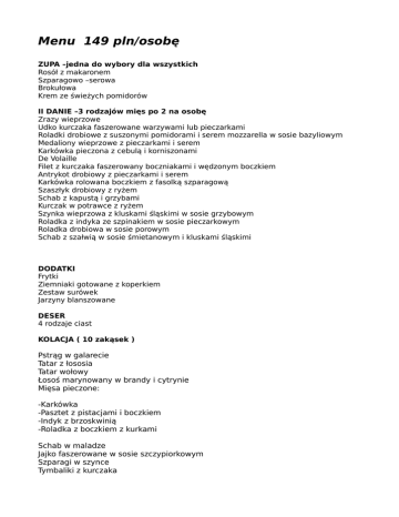Menu 149 pln/osobę ZUPA –jedna do wybory dla wszystkich Rosół z makaronem Szparagowo –serowa Brokułowa Krem ze świeżych pomidorów II DANIE –3 rodzajów mięs po 2 na osobę Zrazy wieprzowe Udko kurczaka faszerowane warzywami lub pieczarkami Roladki drobiowe z suszonymi pomidorami i serem mozzarella w sosie bazyliowym Medaliony wieprzowe z pieczarkami i serem Karkówka pieczona z cebulą i korniszonami De Volaille Filet z kurczaka faszerowany boczniakami i wędzonym boczkiem Antrykot drobiowy z pieczarkami i serem Karkówka rolowana boczkiem z fasolką szparagową Szaszłyk drobiowy z ryżem Schab z kapustą i grzybami Kurczak w potrawce z ryżem Szynka wieprzowa z kluskami śląskimi w sosie grzybowym Roladka z indyka ze szpinakiem w sosie pieczarkowym Roladka drobiowa w sosie porowym Schab z szałwią w sosie śmietanowym i kluskami śląskimi DODATKI Frytki Ziemniaki gotowane z koperkiem Zestaw surówek Jarzyny blanszowane DESER 4 rodzaje ciast KOLACJA ( 10 zakąsek ) Pstrąg w galarecie Tatar z łososia Tatar wołowy Łosoś marynowany w brandy i cytrynie Mięsa pieczone: -Karkówka -Pasztet z pistacjami i boczkiem -Indyk z brzoskwinią -Roladka z boczkiem z kurkami Schab w maladze Jajko faszerowane w sosie szczypiorkowym Szparagi w szynce Tymbaliki z kurczaka Śledź po kaszubsku Śledź w śmietanie Śledź w oleju Pomidory faszerowane Mozzarella z pomidorami Sałatka grecka Sałatka z fetą i gruszką marynowaną Sałatka szynkowa Sałatka jarzynowa Sałatka brzoskwiniowa z kukurydzą Sałatka z kurczaka z curry -Pieczywo -Masło CIEPŁE DANIE OK 22.00 ( dwa do wyboru ) Udka z kurczaka pieczone Kurczak po chińsku z ryżem Szaszłyk drobiowy z ryżem Mix szaszłyków z grubą frytką ZUPA ok. 1.00 ( jenda do wyboru ) Flaki Barszcz czysty Żurek NAPOJE Kawa Herbata Woda gazowana / niegazowana Impreza nocna do 3.00. Obsługa płatna poniżej 30 osób pełnopłatnych – 300 PLN powyżej 30 osób pełnopłatnych – 0 PLN. Alkohol i napoje we własnym zakresie, możliwość zamówienia przez restaurację bez narzutu.