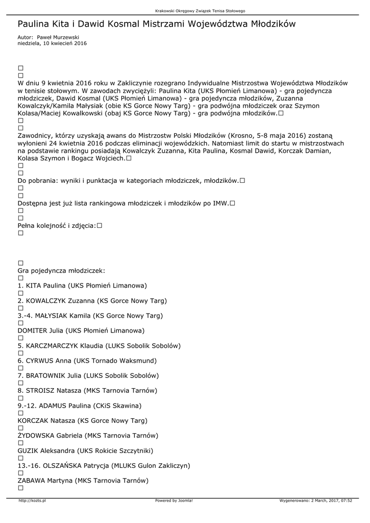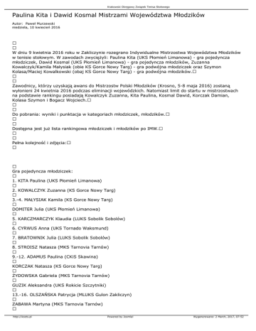 Krakowski Okręgowy Związek Tenisa Stołowego Paulina Kita i Dawid Kosmal Mistrzami Województwa Młodzików Autor: Paweł Murzewski niedziela, 10 kwiecień 2016 W dniu 9 kwietnia 2016 roku w Zakliczynie rozegrano Indywidualne Mistrzostwa Województwa Młodzików w tenisie stołowym. W zawodach zwyciężyli: Paulina Kita (UKS Płomień Limanowa) - gra pojedyncza młodziczek, Dawid Kosmal (UKS Płomień Limanowa) - gra pojedyncza młodzików, Zuzanna Kowalczyk/Kamila Małysiak (obie KS Gorce Nowy Targ) - gra podwójna młodziczek oraz Szymon Kolasa/Maciej Kowalkowski (obaj KS Gorce Nowy Targ) - gra podwójna młodzików. Zawodnicy, którzy uzyskają awans do Mistrzostw Polski Młodzików (Krosno, 5-8 maja 2016) zostaną wyłonieni 24 kwietnia 2016 podczas eliminacji wojewódzkich. Natomiast limit do startu w mistrzostwach na podstawie rankingu posiadają Kowalczyk Zuzanna, Kita Paulina, Kosmal Dawid, Korczak Damian, Kolasa Szymon i Bogacz Wojciech. Do pobrania: wyniki i punktacja w kategoriach młodziczek, młodzików. Dostępna jest już lista rankingowa młodziczek i młodzików po IMW. Pełna kolejność i zdjęcia: Gra pojedyncza młodziczek: 1. KITA Paulina (UKS Płomień Limanowa) 2. KOWALCZYK Zuzanna (KS Gorce Nowy Targ) 3.-4. MAŁYSIAK Kamila (KS Gorce Nowy Targ) DOMITER Julia (UKS Płomień Limanowa) 5. KARCZMARCZYK Klaudia (LUKS Sobolik Sobolów) 6. CYRWUS Anna (UKS Tornado Waksmund) 7. BRATOWNIK Julia (LUKS Sobolik Sobolów) 8. STROISZ Natasza (MKS Tarnovia Tarnów) 9.-12. ADAMUS Paulina (CKiS Skawina) KORCZAK Natasza (KS Gorce Nowy Targ) ŻYDOWSKA Gabriela (MKS Tarnovia Tarnów) GUZIK Aleksandra (UKS Rokicie Szczytniki) 13.-16. OLSZAŃSKA Patrycja (MLUKS Gulon Zakliczyn) ZABAWA Martyna (MKS Tarnovia Tarnów) http://kozts.pl Powered by Joomla! Wygenerowano: 2 March, 2017, 07:52 Krakowski Okręgowy Związek Tenisa Stołowego SYRDA Zuzanna (KS Bronowianka Kraków) ŚCIESZKA Karolina (KS Gorce Nowy Targ) 17.-20. KOPACKA Anna (KS Bronowianka Kraków) KOLASA Iwona (UKS Tornado Waksmund) BEZAK Zuzanna (CKiS Skawina) KOCZAŁKO Oliwia (KS Gorce Nowy Targ) Gra pojedyncza młodzików: 1. KOSMAL Dawid (UKS Płomień Limanowa) 2. KOLASA Szymon (KS Gorce Nowy Targ) 3.-4. BOGACZ Wojciech (MKS KSOS Kraków) KORCZAK Damian (UKS Rokicie Szczytniki) 5. PIS Konrad (LUKS Skrzyszów Skrzyszów) 6. PIEKARCZYK Michał (LKS Piotrowice) 7. KOWALKOWSKI Maciej (KS Gorce Nowy Targ) 8. KNAGA Łukasz (KS Bronowianka Kraków) 9.-12. TROJANOWSKI Dawid (KS Start Nowy Sącz) SUŁKOWSKI Karol (UKS Płomień Limanowa) DŁUGOPOLSKI Grzegorz (KS Gorce Nowy Targ) TURECKI Kacper (UKS Rokicie Szczytniki) 13.-16. KOPACKI Paweł (KS Bronowianka Kraków) ANTECKI Patryk (LKS Piotrowice) WOJAS Bartłomiej (AS Progres Kraków) GNIADEK Adrian (MLUKS Gulon Zakliczyn) 17.-24. RAJZER Krzysztof (LUKS Sobolik Sobolów) RÓŻAŃSKI Damian (KS Gorce Nowy Targ) WODNIAK Kamil (LKS Piotrowice) WCISŁO Konrad (UKS Rokicie Szczytniki) KLAG Wiktor (KS Gorce Nowy Targ) GALA Bartłomiej (UKS Kontra Rączna) KORNAŚ Bartłomiej (MLUKS Gulon Zakliczyn) http://kozts.pl Powered by Joomla! Wygenerowano: 2 March, 2017, 07:52 Krakowski Okręgowy Związek Tenisa Stołowego KUCHARSKI Mateusz (UKS Rokicie Szczytniki) 25.-32. KUĆ Grzegorz (UKS Kontra Rączna) BARTNICKI Jakub (CKiS Skawina) ŻYDEK Robert (LKS Piotrowice) OLESIAK Marcin (UKS Płomień Limanowa) KWIATKOWSKI Kacper (UKS Lepietnica Klikuszowa) MRÓZ Jakub (MLUKS Gulon Zakliczyn) BODNAR Michał (LKS Piotrowice) GOLONKA Filip (UKS Płomień Limanowa) 33.-40. OLSZAŃSKI Kacper (MLUKS Gulon Zakliczyn) ULANECKI Mateusz (MLUKS Gulon Zakliczyn) GALA Dawid (UKS Kontra Rączna) KWAPNIEWSKI Hubert (UKS Sokół Żabno) SKROBOT Marcin (MKS Radość Gorlice) MARCHEWKA Kamil (MKS KSOS Kraków) JASNOS Filip (MLUKS Gulon Zakliczyn) PASEK Kamil (KS Start Nowy Sącz) 41.-48. JUSZYŃSKI Rafał (MKS Radość Gorlice) MAJDAK Rafał (MKS KSOS Kraków) FRĄCZEK-WARIAS Kacper (CKiS Skawina) BARSZCZ Dominik (UKS Sokół Żabno) MARTYKA Bartłomiej (MLUKS Gulon Zakliczyn) MIGDAŁ Piotr (MLUKS Gulon Zakliczyn) SIEDLECZKA Szymon (MKS KSOS Kraków) RYPEL Mariusz (UKS Lepietnica Klikuszowa) Gra podwójna młodziczek: 1. KOWALCZYK Zuzanna (KS Gorce Nowy Targ)/MAŁYSIAK Kamila (KS Gorce Nowy Targ) 2. KITA Paulina (UKS Płomień Limanowa)/DOMITER Julia (UKS Płomień Limanowa) 3.-4. ADAMUS Paulina (CKiS Skawina)/STROISZ Natasza (MKS Tarnovia Tarnów) http://kozts.pl Powered by Joomla! Wygenerowano: 2 March, 2017, 07:52 Krakowski Okręgowy Związek Tenisa Stołowego BRATOWNIK Julia (LUKS Sobolik Sobolów)/KARCZMARCZYK Klaudia (LUKS Sobolik Sobolów) 5.-8. GUZIK Aleksandra (UKS Rokicie Szczytniki)/SYRDA Zuzanna (KS Bronowianka Kraków) ZABAWA Martyna (MKS Tarnovia Tarnów)/ŚCIESZKA Karolina (KS Gorce Nowy Targ) ŻYDOWSKA Gabriela (MKS Tarnovia Tarnów)/OLSZAŃSKA Patrycja (MLUKS Gulon Zakliczyn) CYRWUS Anna (UKS Tornado Waksmund)/KOLASA Iwona (UKS Tornado Waksmund) 9.-16. KORCZAK Natasza (KS Gorce Nowy Targ)/KOCZAŁKO Oliwia (KS Gorce Nowy Targ) BEZAK Zuzanna (CKiS Skawina)/KOPACKA Anna (KS Bronowianka Kraków) Gra podwójna młodzików: 1. KOLASA Szymon (KS Gorce Nowy Targ)/KOWALKOWSKI Maciej (KS Gorce Nowy Targ) 2. KOSMAL Dawid (UKS Płomień Limanowa)/KORCZAK Damian (UKS Rokicie Szczytniki) 3.-4. KNAGA Łukasz (KS Bronowianka Kraków)/KOPACKI Paweł (KS Bronowianka Kraków) BOGACZ Wojciech (MKS KSOS Kraków)/SUŁKOWSKI Karol (UKS Płomień Limanowa) 5.-8. BARTNICKI Jakub (CKiS Skawina)/WOJAS Bartłomiej (AS Progres Kraków) TURECKI Kacper (UKS Rokicie Szczytniki)/PIS Konrad (LUKS Skrzyszów Skrzyszów) PIEKARCZYK Michał (LKS Piotrowice)/BODNAR Michał (LKS Piotrowice) KUCHARSKI Mateusz (UKS Rokicie Szczytniki)/WCISŁO Konrad (UKS Rokicie Szczytniki) 9.-16. GOLONKA Filip (UKS Płomień Limanowa)/OLESIAK Marcin (UKS Płomień Limanowa) DŁUGOPOLSKI Grzegorz (KS Gorce Nowy Targ)/KLAG Wiktor (KS Gorce Nowy Targ) ANTECKI Patryk (LKS Piotrowice)/WODNIAK Kamil (LKS Piotrowice) GNIADEK Adrian (MLUKS Gulon Zakliczyn)/OLSZAŃ