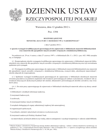 DZIENNIK USTAW RZECZYPOSPOLITEJ POLSKIEJ Warszawa, dnia 12 grudnia 2012 r. Poz. 1394 ROZPORZĄDZENIE MINISTRA KULTURY I DZIEDZICTWA NARODOWEGO 1) z dnia 5 grudnia 2012 r. w sprawie wymagań kwalifikacyjnych uprawniających do zajmowania w bibliotekach stanowisk bibliotekarskich oraz stanowisk dla specjalistów innych zawodów związanych z działalnością biblioteczną Na podstawie art. 29 ust. 4 ustawy z dnia 27 czerwca 1997 r. o bibliotekach (Dz. U. z 2012 r. poz. 642 i 908) zarządza się, co następuje: § 1. Rozporządzenie określa wymagania kwalifikacyjne uprawniające do zajmowania w bibliotekach stanowisk bibliotekarskich oraz stanowisk dla specjalistów innych zawodów związanych z działalnością biblioteczną oraz tryb stwierdzania spełnienia tych wymagań. § 2. Wymagania kwalifikacyjne uprawniające do zajmowania w bibliotekach stanowisk bibliotekarskich oraz stanowisk dla specjalistów innych zawodów związanych z działalnością biblioteczną, zwanych dalej „określonymi stanowiskami”, określa załącznik do rozporządzenia. § 3. Spełnienie wymagań kwalifikacyjnych uprawniających do zajmowania w bibliotekach określonych stanowisk stwierdza pracodawca na podstawie dyplomów lub świadectw potwierdzających zdobyte wykształcenie, świadectw lub zaświadczeń dotyczących ukończonych praktyk lub szkoleń, dokumentów potwierdzających dorobek zawodowy oraz świadectw pracy. § 4. 1. Do stażu pracy uprawniającego do zajmowania w bibliotekach określonych stanowisk zalicza się okresy zatrudnienia w: 1) bibliotekach i ośrodkach informacji naukowej, 2) instytutach badawczych, 3) archiwach, 4) instytucjach kultury innych niż biblioteki, 5) urzędach obsługujących organy administracji rządowej lub samorządowej, 6) organizacjach społecznych, 7) uczelniach, szkołach i placówkach oświatowo-wychowawczych, 8) instytutach naukowych Polskiej Akademii Nauk – na stanowiskach, na których zdobywa się wiedzę, nabywa umiejętności i uzyskuje kompetencje w zakresie zadań bibliotek. 1) inister Kultury i Dziedzictwa Narodowego kieruje działem administracji rządowej – kultura i ochrona dziedzictwa narodowego, na M podstawie § 1 ust. 2 rozporządzenia Prezesa Rady Ministrów z dnia 18 listopada 2011 r. w sprawie szczegółowego zakresu działania Ministra Kultury i Dziedzictwa Narodowego (Dz. U. Nr 248, poz. 1482). Dziennik Ustaw –2– Poz. 1394 2. W uzasadnionych przypadkach pracodawca zalicza pracownikowi do stażu pracy okresy zatrudnienia w jednostkach organizacyjnych innych niż wymienione w ust. 1, na stanowiskach, na których zdobył on wiedzę, nabył umiejętności i uzyskał kompetencje w zakresie zadań bibliotek. § 5. Do dorobku zawodowego uprawniającego do zajmowania w bibliotekach określonych stanowisk zalicza się: 1) uzyskanie stopnia doktora, doktora habilitowanego lub tytułu profesora w zakresie odpowiadającym profilowi biblioteki; 2) autorstwo lub współautorstwo publikacji naukowych, popularnonaukowych lub informacyjnych w dziedzinach związanych z profilem biblioteki; 3) prowadzenie badań naukowych lub prac dokumentacyjnych z zakresu bibliologii i informatologii lub dziedzin związanych z profilem biblioteki; 4) osiągnięcia w upowszechnianiu kultury, a także w upowszechnianiu wiedzy z zakresu bibliologii i informatologii; 5) autorstwo programów nauczania z zakresu edukacji bibliotecznej i informacyjnej oraz programów wspierających rozwój kultury informacyjnej w społecznościach lokalnych; 6) uczestnictwo w krajowych lub międzynarodowych programach, projektach badawczych i dokumentacyjnych w dziedzinach związanych z profilem biblioteki; 7) autorstwo referatów lub komunikatów wygłoszonych na krajowych lub międzynarodowych konferencjach naukowych dotyczących bibliologii i informatologii lub udział w komitetach organizacyjnych takich konferencji; 8) prace w komitecie redakcyjnym lub w radzie czasopisma naukowego, zawodowego lub popularnonaukowego z zakresu bibliologii i informatologii; 9) działalność na rzecz środowiska zawodowego bibliotekarzy i pracowników dokumentacji i informacji naukowej, udział i funkcje sprawowane w krajowych lub międzynarodowych organizacjach naukowych lub zawodowych; 10) udział w stażach z zakresu bibliologii i informatologii w instytucjach krajowych lub zagranicznych lub kierowanie takimi stażami. § 6. Pracownicy zatrudnieni na stanowiskach starszego bibliotekarza, kustosza i starszego kustosza, którzy w dniu wejścia w życie rozporządzenia nie spełniają wymagań kwalifikacyjnych uprawniających do ich zajmowania, mogą je zajmować, jednak nie dłużej niż przez dziewięć lat od dnia wejścia w życie rozporządzenia, chyba że uzyskają kwalifikacje do ich zajmowania. § 7. Rozporządzenie wchodzi w życie po upływie 14 dni od dnia ogłoszenia.2) Minister Kultury i Dziedzictwa Narodowego: B. Zdrojewski 2) Niniejsze rozporządzenie było poprzedzone rozporządzeniem Ministra Kultury i Sztuki z dnia 9 marca 1999 r. w sprawie wymagań kwalifikacyjnych uprawniających do zajmowania określonych stanowisk w bibliotekach oraz trybu stwierdzania tych kwalifikacji (Dz. U. Nr 41, poz. 419), które na podstawie art. 13 pkt 3 ustawy z dnia 31 sierpnia 2011 r. o zmianie ustawy o organizowaniu i prowadzeniu działalności kulturalnej oraz niektórych innych ustaw (Dz. U. Nr 207, poz. 1230) utraciło moc z dniem 2 lipca 2012 r. wyższe na poziomie studiów drugiego stopnia lub jednolitych studiów magisterskich, na kierunku odpowiadającym profilowi biblioteki lub którego efekty kształcenia odnoszą się do bibliologii i informatologii wyższe na poziomie studiów drugiego stopnia lub jednolitych studiów magisterskich, na kierunku odpowiadającym profilowi biblioteki lub którego efekty kształcenia odnoszą się do bibliologii i informatologii Bibliotekarz Starszy bibliotekarz Kustosz Starszy kustosz 3 4 5 3 lata wyższe na poziomie studiów pierwszego stopnia – – 2 lata 2 