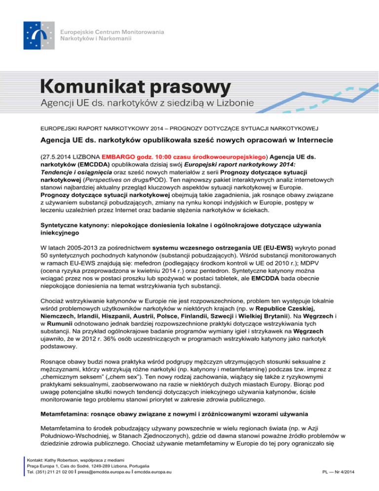 EUROPEJSKI RAPORT NARKOTYKOWY 2014 – PROGNOZY DOTYCZĄCE SYTUACJI NARKOTYKOWEJ Agencja UE ds. narkotyków opublikowała sześć nowych opracowań w Internecie (27.5.2014 LIZBONA EMBARGO godz. 10:00 czasu środkowoeuropejskiego) Agencja UE ds. narkotyków (EMCDDA) opublikowała dzisiaj swój Europejski raport narkotykowy 2014: Tendencje i osiągnięcia oraz sześć nowych materiałów z serii Prognozy dotyczące sytuacji narkotykowej (Perspectives on drugs/POD). Ten najnowszy pakiet interaktywnych analiz internetowych stanowi najbardziej aktualny przegląd kluczowych aspektów sytuacji narkotykowej w Europie. Prognozy dotyczące sytuacji narkotykowej obejmują takie zagadnienia, jak rosnące obawy związane z używaniem substancji pobudzających, zmiany na rynku konopi indyjskich w Europie, postępy w leczeniu uzależnień przez Internet oraz badanie stężenia narkotyków w ściekach. Syntetyczne katynony: niepokojące doniesienia lokalne i ogólnokrajowe dotyczące używania iniekcyjnego W latach 2005-2013 za pośrednictwem systemu wczesnego ostrzegania UE (EU-EWS) wykryto ponad 50 syntetycznych pochodnych katynonów (substancji pobudzających). Wśród substancji monitorowanych w ramach EU-EWS znajdują się: mefedron (podlegający środkom kontroli w UE od 2010 r.); MDPV (ocena ryzyka przeprowadzona w kwietniu 2014 r.) oraz pentedron. Syntetyczne katynony można wciągać przez nos w postaci proszku lub spożywać w postaci tabletek, ale EMCDDA bada obecnie niepokojące doniesienia na temat wstrzykiwania tych substancji. Chociaż wstrzykiwanie katynonów w Europie nie jest rozpowszechnione, problem ten występuje lokalnie wśród problemowych użytkowników narkotyków w niektórych krajach (np. w Republice Czeskiej, Niemczech, Irlandii, Hiszpanii, Austrii, Polsce, Finlandii, Szwecji i Wielkiej Brytanii). Na Węgrzech i w Rumunii odnotowano jednak bardziej rozpowszechnione praktyki dotyczące wstrzykiwania tych substancji. Na przykład ogólnokrajowe badanie programów wymiany igieł i strzykawek na Węgrzech ujawniło, że w 2012 r. 36% osób uczestniczących w programach wstrzykiwało katynony jako narkotyk podstawowy. Rosnące obawy budzi nowa praktyka wśród podgrupy mężczyzn utrzymujących stosunki seksualne z mężczyznami, którzy wstrzykują różne narkotyki (np. katynony i metamfetaminę) podczas tzw. imprez z „chemicznym seksem” („chem sex”). Ten nowy rodzaj zachowania, wiążący się także z ryzykownymi praktykami seksualnymi, zaobserwowano na razie w niektórych dużych miastach Europy. Biorąc pod uwagę potencjalne skutki nowych tendencji dotyczących iniekcyjnego używania katynonów, ścisłe monitorowanie tego problemu stanowi priorytet w zakresie zdrowia publicznego. Metamfetamina: rosnące obawy związane z nowymi i zróżnicowanymi wzorami używania Metamfetamina to środek pobudzający używany powszechnie w wielu regionach świata (np. w Azji Południowo-Wschodniej, w Stanach Zjednoczonych), gdzie od dawna stanowi poważne źródło problemów w dziedzinie zdrowia publicznego. Chociaż używanie metamfetaminy w Europie do tej pory ograniczało się Kontakt: Kathy Robertson, współpraca z mediami Praça Europa 1, Cais do Sodré, 1249-289 Lizbona, Portugalia Tel. (351) 211 21 02 00 I [email protected] I emcdda.europa.eu PL — Nr 4/2014 Prognozy dotyczące sytuacji narkotykowej I EMBARGO godz. 10:00 czasu środkowoeuropejskiego 27.5.2014 przede wszystkim do Republiki Czeskiej i Słowacji, obecnie pojawiają się nowe ogniska i wzory używania tej substancji w innych krajach i w zróżnicowanych populacjach. Odnotowano na przykład wciąganie przez nos metamfetaminy w proszku wśród osób rekreacyjnie używających narkotyków w Niemczech; palenie metamfetaminy krystalicznej wśród osób iniekcyjnie używających opioidów w Grecji, na Cyprze i w Turcji; oraz wstrzykiwanie tego narkotyku łącznie z innymi substancjami przez mężczyzn utrzymujących stosunki seksualne z mężczyznami (zob. powyżej). W swojej nowej analizie EMCDDA przedstawia aktualne wyzwania związane z reagowaniem na używanie tego narkotyku w dziedzinie zdrowia i w wymiarze społecznym. Nie ma jeszcze zarejestrowanych środków farmakologicznych służących do leczenia uzależnienia od metamfetaminy, ale skuteczność wykazują interwencje psychospołeczne. Agencja informuje: „Aktualny problem dotyczący metamfetaminy w Europie ma wiele twarzy i wymaga dostosowania oraz rozwinięcia reakcji odpowiednich do lokalnych wzorów używania i zaobserwowanych problemów”. Przegląd postępów w farmakologicznym leczeniu uzależnienia od kokainy Kokaina pozostaje najczęściej stosowanym nielegalnym środkiem pobudzającym w Europie, a leczenie uzależnienia od kokainy wciąż stanowi wyzwanie. W 2012 r. w Europie 14% osób rozpoczynających specjalistyczne leczenie uzależnienia od narkotyków zgłaszało kokainę jako narkotyk podstawowy. EMCDDA przedstawia metaanalizę sześciu opracowań dotyczących skuteczności środków farmakologicznych w leczeniu uzależnienia od kokainy oraz ich akceptacji przez osoby uzależnione. Oryginalne opracowania autorstwa Grupy Cochrane’a ds. narkotyków i alkoholu obejmują 92 badania (85 ze Stanów Zjednoczonych) i ponad 7000 uczestników. Badania te pokazują, że niektóre leki mogą zredukować głód narkotykowy, ale nie ma jednego środka, który leczyłby uzależnienie od kokainy. Trwają dalsze badania w tym obszarze, a tymczasem interwencje psychospołeczne pozostają podstawowym elementem leczenia uzależnienia od kokainy (zob. wideo). Krajowa produkcja marihuany jako podstawowe źródło podaży tego narkotyku oraz rosnący import haszyszu Europa od dawna pozostaje jednym z największych rynków konsumenckich konopi indyjskich, w szczególności haszyszu importowanego głównie z Maroka. Każdego roku w Europie spożywa się ok. 2050 ton haszyszu i marihuany. EMCDDA donosi, że rynek konsumencki konopi indyjskich w Europie zdomin