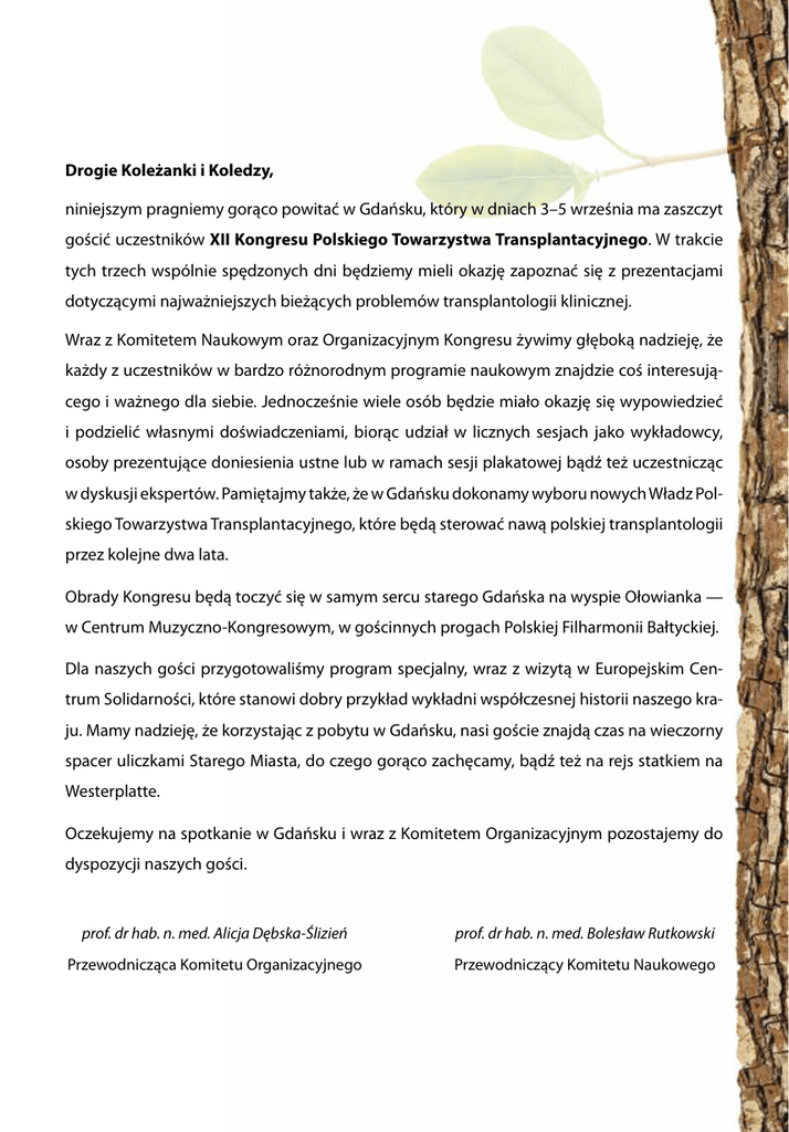 Drogie Koleżanki i Koledzy, niniejszym pragniemy gorąco powitać w Gdańsku, który w dniach 3–5 września ma zaszczyt gościć uczestników XII Kongresu Polskiego Towarzystwa Transplantacyjnego. W trakcie tych trzech wspólnie spędzonych dni będziemy mieli okazję zapoznać się z prezentacjami dotyczącymi najważniejszych bieżących problemów transplantologii klinicznej. Wraz z Komitetem Naukowym oraz Organizacyjnym Kongresu żywimy głęboką nadzieję, że każdy z uczestników w bardzo różnorodnym programie naukowym znajdzie coś interesującego i ważnego dla siebie. Jednocześnie wiele osób będzie miało okazję się wypowiedzieć i podzielić własnymi doświadczeniami, biorąc udział w licznych sesjach jako wykładowcy, osoby prezentujące doniesienia ustne lub w ramach sesji plakatowej bądź też uczestnicząc w dyskusji ekspertów. Pamiętajmy także, że w Gdańsku dokonamy wyboru nowych Władz Polskiego Towarzystwa Transplantacyjnego, które będą sterować nawą polskiej transplantologii przez kolejne dwa lata. Obrady Kongresu będą toczyć się w samym sercu starego Gdańska na wyspie Ołowianka — w Centrum Muzyczno-Kongresowym, w gościnnych progach Polskiej Filharmonii Bałtyckiej. Dla naszych gości przygotowaliśmy program specjalny, wraz z wizytą w Europejskim Centrum Solidarności, które stanowi dobry przykład wykładni współczesnej historii naszego kraju. Mamy nadzieję, że korzystając z pobytu w Gdańsku, nasi goście znajdą czas na wieczorny spacer uliczkami Starego Miasta, do czego gorąco zachęcamy, bądź też na rejs statkiem na Westerplatte. Oczekujemy na spotkanie w Gdańsku i wraz z Komitetem Organizacyjnym pozostajemy do dyspozycji naszych gości. prof. dr hab. n. med. Alicja Dębska-Ślizień prof. dr hab. n. med. Bolesław Rutkowski Przewodnicząca Komitetu Organizacyjnego Przewodniczący Komitetu Naukowego 2 3–5 września 2015 roku Gdańsk Spis treści 3 PATRONATY XII KONGRES POLSKIEGO TOWARZYSTWA TRANSPLANTACYJNEGO odbywa się pod honorowym patronatem następujących Osób i Instytucji: Patronat Honorowy REKTOR prof. dr hab. n. med. Janusz Moryś 4 3–5 września 2015 roku Gdańsk Sponsorzy Główny sponsor Złoty sponsor SrebrnI sponsorzy Sponsor Partner 5 Wystawcy PARTNERZY PATRONAT MEDIALNY ORGANIZATOR 6 3–5 września 2015 roku Gdańsk Komitet Naukowy prof. dr hab. n. med. Bolesław Rutkowski prof. dr hab. n. med. Andrzej Chmura prof. dr hab. n. med. Lech Cierpka prof. dr hab. n. med. Kazimierz Ciechanowski dr hab. n. med. Jarosław Czerwiński prof. dr hab. n. med. Roman Danielewicz prof. dr hab. n. med. Magdalena Durlik prof. dr hab. n. med. Marek Durlik prof. dr hab. n. med. Alicja Dębska-Ślizień prof. dr hab. n. med. Edward Franek prof. dr hab. n. med. Ryszard Grenda dr hab. n. med. Tadeusz Grochowiecki dr hab. n. med. Maciej Głyda prof. dr hab. n. med. Andrzej Hellmann prof. dr hab. n. med. Wiesław Jędrzejczak prof. dr hab. n. med. Piotr Kaliciński prof. dr hab. n. med. Marian Klinger dr hab. n. med. Bartosz Kubisa dr n. med. Dorota Lewandowska prof. dr hab. n. med. Piotr Małkowski prof. dr hab. n. med. Jolanta Małyszko prof. dr hab. n. med. Sławomir Nazarewski prof. dr hab. n. med. Michał Nowicki prof. dr hab. n. med. Andrzej Oko prof. dr hab. n. med. Marek Ostrowski prof. dr hab. n. med. Dariusz Patrzałek dr hab. n. med. Piotr Przybyłowski prof. dr hab. n. med. Leszek Pączek prof. dr hab. n. med. Zbigniew Śledziński prof. dr hab. n. med. Piotr Trzonkowski prof. dr hab. n. med. Andrzej Więcek prof. dr hab. n. med. Zbigniew Włodarczyk prof. dr hab. n. med. Tadeusz Wróblewski prof. dr hab. n. med. Krzysztof Zieniewicz 7 Komitet Honorowy prof. dr hab. n. med. Stanisław Czekalski prof. dr hab. n. med. Jerzy Dybicki prof. dr hab. n. med. Stanisław Głowiński prof. dr hab. n. med. Liliana Gradowska prof. dr hab. n. med. Marek Krawczyk prof. dr hab. n. med. Mieczysław Lao prof. dr hab. n. med. Michał Myśliwiec prof. dr hab. n. med. Jacek Szmidt prof. dr hab. n. med. Janusz Wałaszewski prof. dr hab. n. med. Marian Zembala Komitet organizacyjny prof. dr hab. n. med. Alicja Dębska-Ślizień dr hab. n. med. Bogdan Biedunkiewicz dr hab. n. med. Barbara Bułło-Piontecka dr n. med. Beata Bzoma dr hab. n. med. Andrzej Chamienia lek. med. Kamila Czarnacka dr n. med. Justyna Gołębiewska dr n. med. Zbigniew Heleniak dr n. med. Piotr Jagodziński dr n. med. Magdalena Jankowska lek. med. Michał Komorniczak dr n. med. Justyna Kostro dr hab. n. med. Ewa Król dr hab. n. med. Sławomir Lizakowski mgr Anna Milecka dr hab. n. med. Przemysław Rutkowski dr hab. n. med. Leszek Tylicki dr n. med. Agnieszka Tarasewicz dr hab. n. med. Dariusz Zadrożny lek. med. Łukasz Zdrojewski 8 3–5 września 2015 roku Gdańsk PLAN SYTUACYJNY — POZIOM 0 9 PLAN SYTUACYJNY — POZIOM 1 Apotex 10 Astellas 2 Biochefa Chiesi 10 5 3, 12 Fressenius 6 H.S. Pharma 15 Hydrex 14 Infusion 13 Novartis 8 Roche 1 Sanofi 4 Teva 9 Valeant 7 Via Medica 11 3–5 września 2015 roku Gdańsk NA TERENIE OBRAD OBOWIĄZUJE CAŁKOWITY ZAKAZ PALENIA TYTONIU PROSIMY O WYŁĄCZENIE TELEFONÓW KOMÓRKOWYCH W SALACH OBRAD 11 IDENTYFIKATORY wykładowcy uczestnicy uczestnictwo jednodniowe GOŚCIE Firmy Organizatorzy Osoby towarzyszące przedstawiciele prasy 12 3–5 września 2015 roku Gdańsk WSTĘP NA OBRADY JEDYNIE ZA OKAZANIEM IDENTYFIKATORA 13 INFORMACJE OGÓLNE Termin obrad 3–5 WRZEŚNIA 2015 roku Miejsce obrad Gdańsk, Polska Filharmonia Bałtycka im. Fryderyka Chopina, ul. Ołowianka 1 Punkty edukacyjne Informujemy, że za udział w Kongesie zostanie przyznanych 17 punktów edukacyjnych. Certyfikaty Certyfikaty uczestnictwa będą wydawane po zakończeniu wykładów w recepcji kongresowej za okazaniem identyfikatora. Istnieje możliwość samodzielnego wydruku certyfikatu po Kongresie za pośrednictwem elektronicznego systemu rejestracji — szczegóły poniżej: 1. W celu wydrukowania certyfikatu należy zalogować się na swój profil, wy
