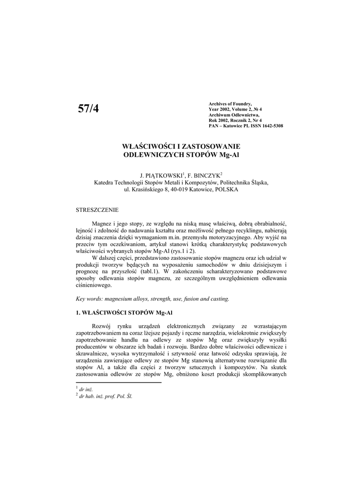 Archives of Foundry, Year 2002, Volume 2, № 4 Archiwum Odlewnictwa, Rok 2002, Rocznik 2, Nr 4 PAN – Katowice PL ISSN 1642-5308 57/4 WŁAŚCIWOŚCI I ZASTOSOWANIE ODLEWNICZYCH STOPÓW Mg-Al J. PIĄTKOWSKI1, F. BINCZYK2 Katedra Technologii Stopów Metali i Kompozytów, Politechnika Śląska, ul. Krasińskiego 8, 40-019 Katowice, POLSKA STRESZCZENIE Magnez i jego stopy, ze względu na niską masę właściwą, dobrą obrabialność, lejność i zdolność do nadawania kształtu oraz możliwość pełnego recyklingu, nabierają dzisiaj znaczenia dzięki wymaganiom m.in. przemysłu motoryzacyjnego. Aby wyjść na przeciw tym oczekiwaniom, artykuł stanowi krótką charakterystykę podstawowych właściwości wybranych stopów Mg-Al (rys.1 i 2). W dalszej części, przedstawiono zastosowanie stopów magnezu oraz ich udział w produkcji tworzyw będących na wyposażeniu samochodów w dniu dzisiejszym i prognozę na przyszłość (tabl.1). W zakończeniu scharakteryzowano podstawowe sposoby odlewania stopów magnezu, ze szczególnym uwzględnieniem odlewania ciśnieniowego. Key words: magnesium alloys, strength, use, fusion and casting. 1. WŁAŚCIWOŚCI STOPÓW Mg-Al Rozwój rynku urządzeń elektronicznych związany ze wzrastającym zapotrzebowaniem na coraz lżejsze pojazdy i ręczne narzędzia, wielokrotnie zwiększyły zapotrzebowanie handlu na odlewy ze stopów Mg oraz zwiększyły wysiłki producentów w obszarze ich badań i rozwoju. Bardzo dobre właściwości odlewnicze i skrawalnicze, wysoka wytrzymałość i sztywność oraz łatwość odzysku sprawiają, że urządzenia zawierające odlewy ze stopów Mg stanowią alternatywne rozwiązanie dla stopów Al, a także dla części z tworzyw sztucznych i kompozytów. Na skutek zastosowania odlewów ze stopów Mg, obniżono koszt produkcji skomplikowanych 1 2 dr inż. dr hab. inż. prof. Pol. Śl. 427 części o powtarzalnych wymiarach oraz cienkich ściankach (często poniżej 1,0 cm grubości) bez kosztownych, drugorzędnych operacji. Dzięki temu, stopy na osnowie magnezu od wielu lat znajdują się w centrum zainteresowania wielu ośrodków naukowo-badawczych [1]. Odlewnicze stopy magnezu charakteryzują się małą gęstością (~1,74g/cm3) (magnez jest lżejszy prawie 5 razy od miedzi, 4,5 razy od żelaza i 1,5 razy lżejszy od aluminium), oraz dobrą lejnością i niskim skurczem. Ponadto, magnez nie jest agresywny w stosunku do form ze stali chromowej, dlatego żywotność form i komór do wtryskiwania jest wyraźnie wydłużona. Ze względu na małą przewodność cieplną magnezu w stosunku do Al, można uzyskiwać odlewy o znacznie cieńszych ściankach. Na uwagę zasługuje również korzystna relacja wytrzymałości do gęstości, odporność na korozję, dobra obrabialność, zdolność do nadawania kształtu, duże zasoby magnezu w wodzie morskiej i wreszcie możliwość pełnego recyklingu. Ze względu na to, że czysty magnez charakteryzuje się stosunkowo niskimi właściwościami mechanicznymi, stopy magnezu wzbogaca się najczęściej aluminium, cynkiem i manganem. Dodatek aluminium dochodzi do ~11%, natomiast w przypadku stopów przeznaczonych do przeróbki plastycznej, dodatek ten wynosi ~9%. Aluminium wpływa korzystnie na właściwości mechaniczne i antykorozyjne stopów magnezu, znacznie poprawia ich plastyczność i moduł sprężystości. Najwyższą wytrzymałość Rm uzyskuje się po wprowadzeniu do stopu ~5% Al, a maksymalne wydłużenie uzyskuje stop po wprowadzeniu ~6% dodatku aluminium. Wpływ aluminium na właściwości wytrzymałościowe stopów Mg-Al przedstawiono na rysunku 1 [2]. 21 Wydłużenie A10, [%] Rm 15 150 12 120 9 90 A10 6 60 3 Wytrzymałość, Rm, [MPa] 180 18 0 0 2 4 6 8 10 12 Zawartość Al, [%] Rys.1. Wpływ dodatku aluminium na wytrzymałość na rozciąganie oraz plastyczność odlewniczych stopów Mg-Al [2] Fig.1. The influence aluminium alloy on the strength and plasticity of casting Mg-Al alloys [2] 428 Drugim, co do ilości dodatkiem stopów Mg-Al jest cynk. Powoduje on podwyższenie twardości, wytrzymałości na rozciąganie oraz wydłużenia. Wpływa również na poprawę właściwości odlewniczych, a zwłaszcza lejności. W stopach technicznych, zawartość cynku nie przekracza na ogół ~6%, jednak maksymalny zespół właściwości wytrzymałościowych uzyskuje się po wprowadzeniu ~5% Zn. Mangan w stopach Mg-Al stosuje się najczęściej w ilościach ~2%. Wpływa on korzystnie na podwyższenie odporności na korozję oraz poprawę właściwości mechanicznych w typowych dla tych stopów warunkach eksploatacji. O wiele większe zastosowanie znalazł mangan w stopach potrójnych Mg-Al-Zn, w których zawartość cynku wynosi do ~0,5%. Stopy te odporne są na pękanie na gorąco, wykazują dobrą skrawalność i spawalność oraz wytrzymałość na zmienne obciążenia. Z tego względu, stopy tej grupy mogą być stosowane na odlewy o dużej masie, pracujące w ciężkich warunkach oraz w bezpośrednim kontakcie z morską wodą do temperatury ~120oC. Rzadziej, w stopach magnezu stosuje się dodatek krzemu (tylko w stopach odlewniczych) i cyrkonu. Stopy Mg-Al z cyrkonem charakteryzują się wysoką wytrzymałością i plastycznością (wydłużenie może dochodzić nawet do ~20%) [2]. Wieloskładnikowe stopy magnezu z cyrkonem i innymi metalami cechują się dobrą wytrzymałością na zmęczenie w temperaturze otoczenia i w temperaturze podwyższonej (do ~150oC). Cechą znamionową stopów magnezu z cyrkonem jest to, że nie wykazują skłonności do tworzenia mikroporowatości, a właściwości mechaniczne nie ulegają zmianie nawet przy dużych różnicach w grubości ścianek odlewów pracujących w temperaturze do ~150oC [2]. Zmianę właściwości wytrzymałościowych stopów Mg w podwyższonej temperaturze przedstawiono na rysunku 2 [2]. Wytrzymałość Rm, [MPa] 300 250 GA 200 GA 150 100 GRE 3 50 0 0 100 200 300 400 Tem peratura, [ oC] Rys.2. Wpływ temperatury na w