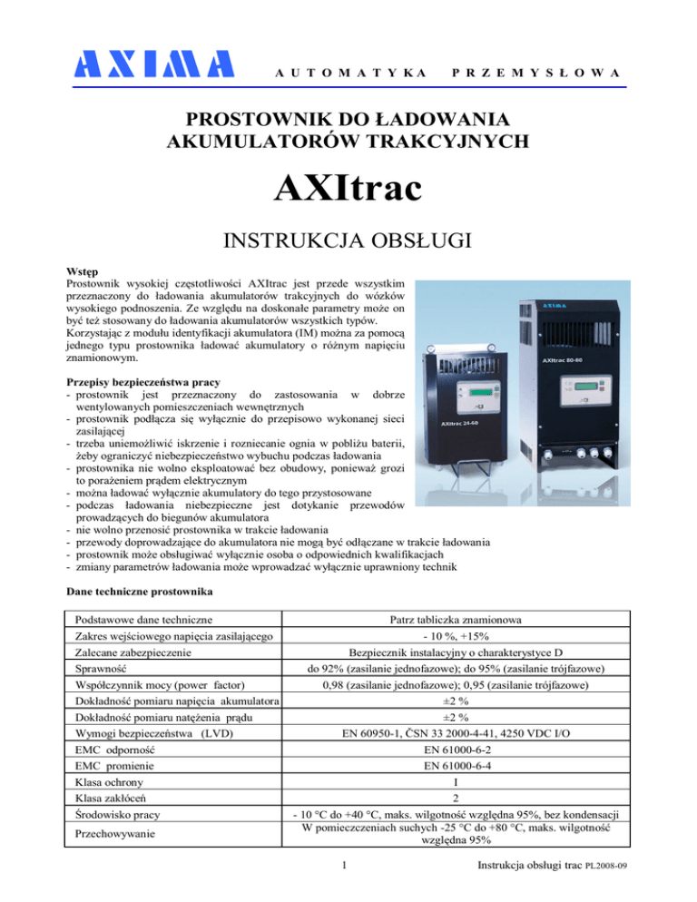 A U T O M A T Y KA P R Z E M Y S Ł O W A PROSTOWNIK DO ŁADOWANIA AKUMULATORÓW TRAKCYJNYCH AXItrac INSTRUKCJA OBSŁUGI Wstęp Prostownik wysokiej częstotliwości AXItrac jest przede wszystkim przeznaczony do ładowania akumulatorów trakcyjnych do wózków wysokiego podnoszenia. Ze względu na doskonałe parametry może on być też stosowany do ładowania akumulatorów wszystkich typów. Korzystając z modułu identyfikacji akumulatora (IM) można za pomocą jednego typu prostownika ładować akumulatory o różnym napięciu znamionowym. Przepisy bezpieczeństwa pracy - prostownik jest przeznaczony do zastosowania w dobrze wentylowanych pomieszczeniach wewnętrznych - prostownik podłącza się wyłącznie do przepisowo wykonanej sieci zasilającej - trzeba uniemożliwić iskrzenie i rozniecanie ognia w pobliżu baterii, żeby ograniczyć niebezpieczeństwo wybuchu podczas ładowania - prostownika nie wolno eksploatować bez obudowy, ponieważ grozi to porażeniem prądem elektrycznym - można ładować wyłącznie akumulatory do tego przystosowane - podczas ładowania niebezpieczne jest dotykanie przewodów prowadzących do biegunów akumulatora - nie wolno przenosić prostownika w trakcie ładowania - przewody doprowadzające do akumulatora nie mogą być odłączane w trakcie ładowania - prostownik może obsługiwać wyłącznie osoba o odpowiednich kwalifikacjach - zmiany parametrów ładowania może wprowadzać wyłącznie uprawniony technik Dane techniczne prostownika Podstawowe dane techniczne Patrz tabliczka znamionowa Zakres wejściowego napięcia zasilającego - 10 %, +15% Zalecane zabezpieczenie Sprawność Współczynnik mocy (power factor) Bezpiecznik instalacyjny o charakterystyce D do 92% (zasilanie jednofazowe); do 95% (zasilanie trójfazowe) 0,98 (zasilanie jednofazowe); 0,95 (zasilanie trójfazowe) Dokładność pomiaru napięcia akumulatora ±2 % Dokładność pomiaru natężenia prądu ±2 % Wymogi bezpieczeństwa (LVD) EN 60950-1, ČSN 33 2000-4-41, 4250 VDC I/O EMC odporność EN 61000-6-2 EMC promienie EN 61000-6-4 Klasa ochrony I Klasa zakłóceń Środowisko pracy Przechowywanie 2 - 10 °C do +40 °C, maks. wilgotność względna 95%, bez kondensacji W pomieczczeniach suchych -25 °C do +80 °C, maks. wilgotność względna 95% 1 Instrukcja obsługi trac PL2008-09 Instalacja prostownika Prostownik może być ustawiony na ziemi lub zawieszony na ścianie. Prostowniki 24-60, 24-100, 48-30, 48-50, 80-27,96-25 można eksploatować również w położeniu poziomym. W celu zapewnienia poprawnego działania prostownika należy zapewnić wolną przestrzeń w odległości co najmniej 100mm z boków i od strony czołowej ze względu na konieczną wentylację. Otwory przeznaczone do zasysania powietrza nie mogą być zasłonięte. W przypadku zapylonego pomieszczenia korzystniejsze jest zawieszenie prostownika na ścianie. Prostownika nie wolno używać w ekstremalnie zapylonym pomieszczeniu. Grozi to bowiem pogorszeniem chłodzenia wewnętrznych części urządzenia. Prostownik podłącza się do sieci zasilającej za pomocą wtyczki sieciowej. Zastosowane gniadko sieciowe musi być zabezpieczone odpowiednim bezpiecznikiem. Obudowę prostownika należy połączyć za pośrednictwem wtyczki z przewodem ochronnym PE. Z wyjścia prostownika są wyprowadzone przewody do podłączenia akumulatora, biegun dodatni jest oznaczony kolorem czerwonym a ujemny niebieskim. Podczas ładowania należy liczyć się ze spadkiem napięcia na tych przewodach. Po zmianie długości przewodów należy wprowadzić nową wartość ich rezystancji. Wyposażenie dodatkowe pompa powietrzna do napowietrzania elektrolitu; służy do przyspieszenia ładowania moduł identyfikacyjny; umożliwia nadanie numeru akumulatora, który umożliwia ewidencję jego ładowań i odróżnianie różnych akumulatorów (napięcie, pojemność, krzywa ładowania), prostownikiem można ładować akumulatory aż do napięcia znamionowego prostownika czujnik temperatury; podłącza się do modułu identyfikacyjnego i służy do ochrony akumulatora przed przegrzaniem przy ładowaniu czujnik poziomu elektrolitu; sprawdza poziom elektrolitu przy ładowaniu, w odpowiedniej chwili dolewana jest woda do celki poprzez załączenie elektrozaworu Funkcje prostownika Prostownik oprócz ładowania podstawowego umożliwia też w trybach specjalnych pracy konserwację akumulatora (patrz niżej). Przy ładowaniu (tryby standardowe i szczególne) trzeba przestrzegać następującej kolejności operacji: - Podłączyć prostownik do sieci zasilające, - Do prostownika podłączyć akumulator, - Ładowanie standardowe zaczyna się, przebiega i kończy automatycznie, z zasady bez korzystania z przycisków, - Tryb odsiarczania w razie potrzeby włączamy przyciskiem REGEN, - Po zakończeniu ładowania (zielona lampka sygnalizacyjna świeci ciągle) odłączamy akumulator, - Jeżeli trzeba odłączyć akumulator w trakcie ładowania (zielona lampka sygnalizacyjna miga), kończymy ładowanie przyciskiem STOP a potem odłączamy akumulator, - Prostownika nie wolno odłączyć od sieci, aż na wyświetlaczu nie pojawi się komunikat BATERIA NIE PODŁĄCZONA (jest to wygodne przy dłuższej przerwie w pracy, przy użytkowaniu okresowym nie jest to konieczne). Ładowanie podstawowe Start ładowania podstawowego zaczyna się po czasie 15s od podłączenia akumulatora, bez naciskania przycisku. Ładowanie przebiega zgodnie z charakterystyką odpowiednią dla danego typu akumulatora. Miga zielona lampka kontrolna - zachodzi ładowanie. Na wyświetlaczu są przy tym przedstawiane następujące dane: ilość wprowadzonych Ah, faza ładowania, czas ładowania w aktualnym cyklu, napięcie w V/ogniwo, prąd wpływający do akumulatora, kod usterki. Kolejne fazy ładowania: TST-test akumulatora, PRE-ładowanie wstępne, CHA-ładowanie, PST-ładowanie końcowe. Stale świeci się zielona lampka kontrolna – zakończenie ładowania. Po zakończeniu 