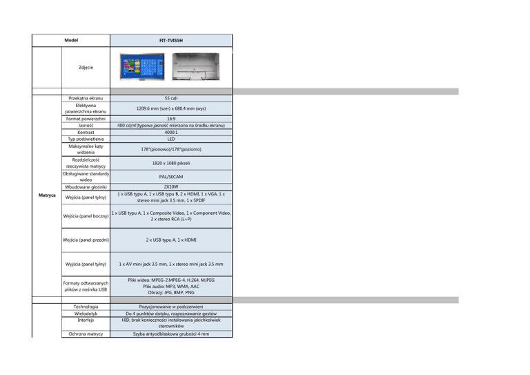 Model FIT-TVI55H Zdjęcie Matryca Ekran dotykowy Przekątna ekranu 55 cali Efektywna powierzchnia ekranu 1209.6 mm (szer) x 680.4 mm (wys) Format powierzchni 16:9 Jasność 400 cd/㎡(typowa jasność mierzona na środku ekranu) Kontrast 4000:1 Typ podświetlenia LED Maksymalne kąty widzenia 178°(pionowo)/178°(poziomo) Rozdzielczość rzeczywista matrycy 1920 x 1080 pikseli Obsługiwane standardy wideo PAL/SECAM Wbudowane głośniki 2X10W Wejścia (panel tylny) 1 x USB typu A, 1 x USB typu B, 2 x HDMI, 1 x VGA, 1 x stereo mini jack 3.5 mm, 1 x SPDIF Wejścia (panel boczny) 1 x USB typu A, 1 x Composite Video, 1 x Component Video, 2 x stereo RCA (L+P) Wejścia (panel przedni) 2 x USB typu A, 1 x HDMI Wyjścia (panel tylny) 1 x AV mini jack 3.5 mm, 1 x stereo mini jack 3.5 mm Formaty odtwarzanych plików z nośnika USB Pliki wideo: MPEG-2.MPEG-4, H.264, MJPEG Pliki audio: MP3, WMA, AAC Obrazy: JPG, BMP, PNG Technologia Pozycjonowanie w podczerwieni Wielodotyk Do 4 punktów dotyku, rozpoznawanie gestów Interfejs HID, brak konieczności instalowania jakichkolwiek sterowników Ochrona matrycy Szyba antyodblaskowa grubości 4 mm Sposób obsługi Dowolnym przedmiotem: pisakiem, wskaźnikiem lub palcem Ekran Rozdzielczość 4096X4096 dotykowy Komunikacja z komputerem USB 2.0 Czas reakcji pojedynczy dotyk: 8ms, ciągły dotyk: 3ms Dokładność ≤±2mm Żywotność > 60.000.000 dotknięć Zasilanie 5.0V za pośrednictwem portu USB Obsługiwane systemy operacyjne Windows, Linux, Android, MAC Moduł OPS Płyta główna H61 Procesor G2010, i3, i5, i7 Pamięć RAM 2 GB/4 GB Wbudowany Dysk twardy 500 GB komputer PC System operacyjny Windows 7 Karta graficzna Zintegrowana Karta dźwiękowa Zintegrowana (opcja) Bezprzewodowa klawiatura/mysz Opcjonalnie Złącza HDMI, USB, VGA, mini jack stereo, RJ-45 Całkowity pobór mocy ≤160W Pozostałe Czuwanie ≤0.5W Żywotność podświetlenia 50000 godzin Zasilanie 100-240V, 50/60Hz Uchwyt ścienny Tak Statyw mobilny Opcjonalnie Wymiary zewnętrzne 1296X730X81mm Waga 55Kg Wymiary opakowania 1425x210x950mm Waga opakowania 70Kg
