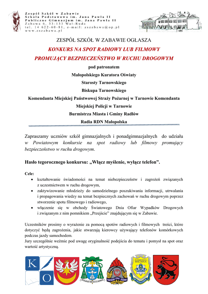 ZESPÓŁ SZKÓŁ W ZABAWIE OGŁASZA KONKURS NA SPOT RADIOWY LUB FILMOWY PROMUJĄCY BEZPIECZEŃSTWO W RUCHU DROGOWYM pod patronatem Małopolskiego Kuratora Oświaty Starosty Tarnowskiego Biskupa Tarnowskiego Komendanta Miejskiej Państwowej Straży Pożarnej w Tarnowie Komendanta Miejskiej Policji w Tarnowie Burmistrza Miasta i Gminy Radłów Radia RDN Małopolska Zapraszamy uczniów szkół gimnazjalnych i ponadgimnazjalnych do udziału w Powiatowym konkursie na spot radiowy lub filmowy promujący bezpieczeństwo w ruchu drogowym. Hasło tegorocznego konkursu: „Włącz myślenie, wyłącz telefon”. Cele: kształtowanie świadomości na temat niebezpieczeństw i zagrożeń związanych z uczestnictwem w ruchu drogowym, zaktywizowanie młodzieży do samodzielnego poszukiwania informacji, utrwalania i propagowania wiedzy na temat bezpiecznych zachowań w ruchu drogowym poprzez stworzenie spotu filmowego i radiowego, włączenie się w obchody Światowego Dnia Ofiar Wypadków Drogowych i związanym z nim pomnikiem „Przejście” znajdującym się w Zabawie. Uczestników prosimy o wyrażenie za pomocą spotów radiowych i filmowych treści, które dotyczyć będą zagrożenia, jakie stwarzają kierowcy używający telefonów komórkowych podczas jazdy samochodem. Jury szczególnie weźmie pod uwagę oryginalność podejścia do tematu i pomysł na spot oraz wartość artystyczną. Nagrody 1. Jury przyznaje nagrody: a) za zajęcie I miejsca – nagroda finansowa (500 zł), b) za zajęcie II i III miejsca nagroda rzeczowa. 2. Na oficjalnym profilu ZS Zabawa na portalu Facebook zamieszczonych zostanie 10 prac konkursowych, które w ocenie Jury uzyskały największą ilość punktów. 3. Zostanie także przyznana nagroda internautów (rzeczowa bądź finansowa) w głosowaniu na profilu ZS Zabawa na portalu Facebook. 4. Laureatom nagrody internautów zostanie uczestnik, którego spot uzyska największą liczbę kliknięć „Lubię to”. Forma konkursu: 1. Uczestnikami konkursu są uczniowie gimnazjum i uczniowie szkół ponadgimnazjalnych. 2. Szkoła może zgłosić do konkursu dowolna liczbę uczestników. 3. Każdy uczestnik może przygotować 1 spot konkursowy. 4. Prace będą ocenianie w kategoriach wiekowych: gimnazjum (spot radiowy lub filmowy), szkoły ponadgimnazjalne (spot radiowy lub filmowy). 5. Spot może być realizowany i zgłaszany zespołowo lub indywidualnie. 6. Spot nie powinien przekraczać 40 sekund i być nagrany na płycie DVD lub CD w formacie umożliwiającym jej odczytanie i dalsze odtwarzanie. Regulamin konkursu: 1. Prace konkursowe z prawidłowo wypełnioną kartą i oświadczeniem należy składać osobiście w sekretariacie Zespołu Szkół w Zabawie lub przesłać pocztą na adres Zespół Szkół w Zabawie, Zabawa 6, 33-133 Wał-Ruda do dnia 26 października 2016r. 2. Organizator nie ponosi odpowiedzialności za ewentualne uszkodzenia lub zniszczenia źle zapakowanych spotów zgłoszonych na konkurs. 3. Prace przechodzą na własność organizatorów konkursu i nie będą zwracane autorom. 4. Laureaci zostaną powiadomieni pisemnie lub telefonicznie o wynikach konkursu nie później niż do 11 listopada 2016 r. 5. Uroczyste ogłoszenie wyników i wręczenie nagród nastąpi podczas gali finałowej II konkursu na spot radiowy lub filmowy promujący bezpieczeństwo w ruchu drogowym w ramach obchodów „Światowego Dnia Pamięci Ofiar Wypadków Drogowych w dniu 18 listopada 2016r. (o dokładnym terminie i miejscu laureaci zostaną powiadomieni telefonicznie). 6. Decyzje jury są ostateczne. Karta zgłoszeniowa Powiatowy konkurs na spot radiowy lub filmowy promujący bezpieczeństwo w ruchu drogowym Imię i nazwisko autora: Szkoła: Adres szkoły: Telefon szkoły: Szkolny opiekun konkursu: Miejscowość i data: Oświadczenie Wyrażam zgodę na przetwarzanie moich danych osobowych zgodnie z ustawą z dnia 29.08.1997 r. o ochronie danych osobowych (tekst jedn. Dz.U. z 2002 r., Nr 101,poz. 926 z poźn.zm.) przez Organizatora Konkursu dla celów związanych z przeprowadzeniem i rozstrzygnięciem Konkursu zgodnie z regulaminem Konkursu. Oświadczam, że jestem autorem zdjęcia nadesłanego na Konkurs oraz, że nie narusza ono jakichkolwiek praw autorskich osób trzecich, ani obowiązujących przepisów prawa. Oświadczam, że zapoznałem/am się z treścią i przyjmuję warunki określone w Regulaminie Konkursu. ………………………………………… Podpis autora ………….…………………… Podpis szkolnego opiekuna konkursu .………………………………………… Pieczęć szkoły