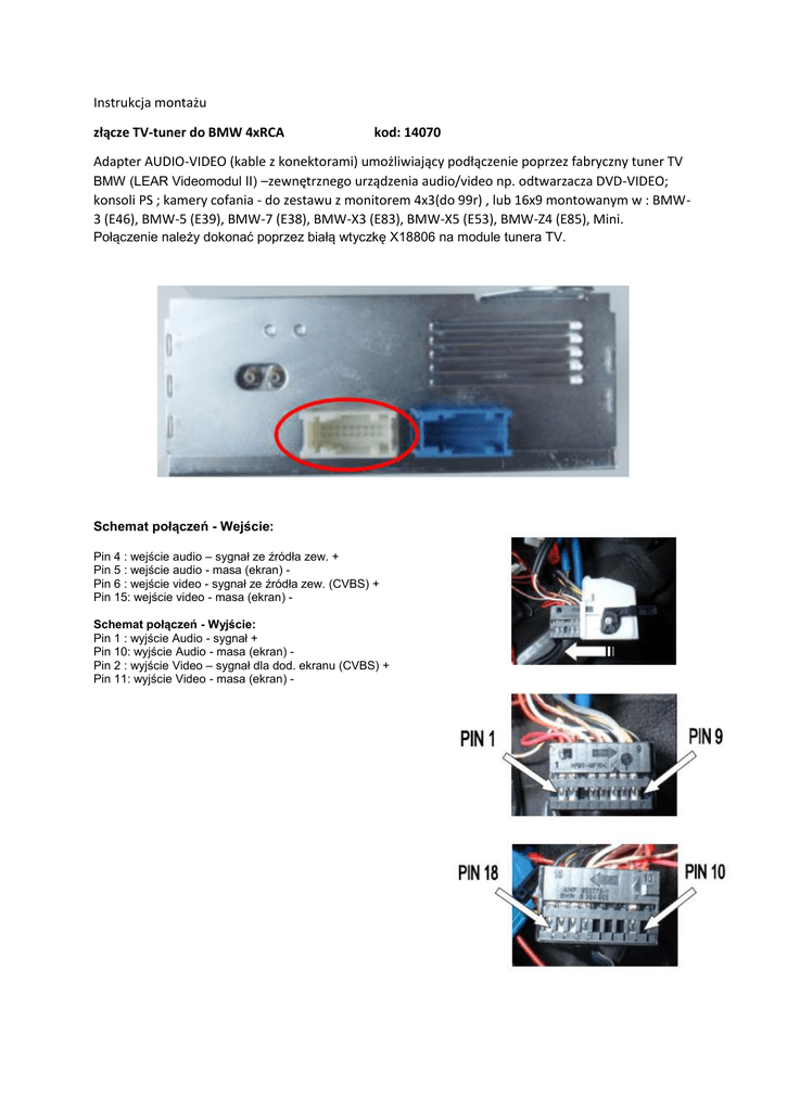 Instrukcja montażu złącze TV-tuner do BMW 4xRCA kod: 14070 Adapter AUDIO-VIDEO (kable z konektorami) umożliwiający podłączenie poprzez fabryczny tuner TV BMW (LEAR Videomodul II) –zewnętrznego urządzenia audio/video np. odtwarzacza DVD-VIDEO; konsoli PS ; kamery cofania - do zestawu z monitorem 4x3(do 99r) , lub 16x9 montowanym w : BMW3 (E46), BMW-5 (E39), BMW-7 (E38), BMW-X3 (E83), BMW-X5 (E53), BMW-Z4 (E85), Mini. Połączenie należy dokonać poprzez białą wtyczkę X18806 na module tunera TV. Schemat połączeń - Wejście: Pin 4 : wejście audio – sygnał ze źródła zew. + Pin 5 : wejście audio - masa (ekran) Pin 6 : wejście video - sygnał ze źródła zew. (CVBS) + Pin 15: wejście video - masa (ekran) Schemat połączeń - Wyjście: Pin 1 : wyjście Audio - sygnał + Pin 10: wyjście Audio - masa (ekran) Pin 2 : wyjście Video – sygnał dla dod. ekranu (CVBS) + Pin 11: wyjście Video - masa (ekran) -