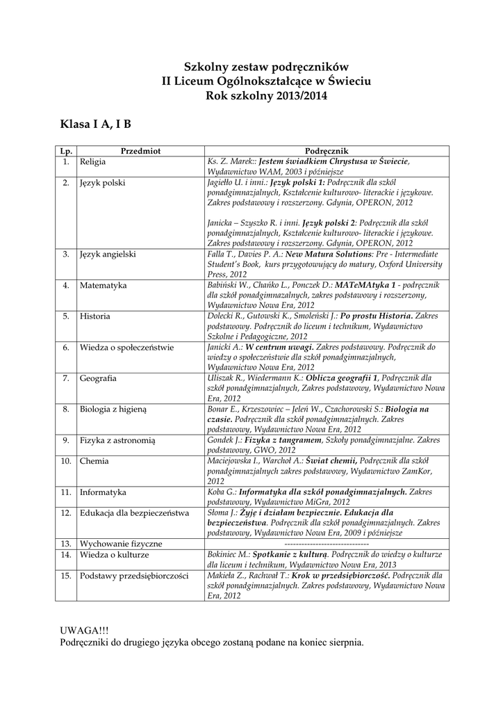 Szkolny zestaw podręczników II Liceum Ogólnokształcące w Świeciu Rok szkolny 2013/2014 Klasa I A, I B Lp. 1. Religia 2. Przedmiot Język polski 3. Język angielski 4. Matematyka 5. Historia 6. Wiedza o społeczeństwie 7. Geografia 8. Biologia z higieną 9. Fizyka z astronomią 10. Chemia 11. Informatyka 12. Edukacja dla bezpieczeństwa 13. 14. Wychowanie fizyczne Wiedza o kulturze 15. Podstawy przedsiębiorczości Podręcznik Ks. Z. Marek:: Jestem świadkiem Chrystusa w Świecie, Wydawnictwo WAM, 2003 i późniejsze Jagiełło U. i inni.: Język polski 1: Podręcznik dla szkól ponadgimnazjalnych, Kształcenie kulturowo- literackie i językowe. Zakres podstawowy i rozszerzony. Gdynia, OPERON, 2012 Janicka – Szyszko R. i inni. Język polski 2: Podręcznik dla szkól ponadgimnazjalnych, Kształcenie kulturowo- literackie i językowe. Zakres podstawowy i rozszerzony. Gdynia, OPERON, 2012 Falla T., Davies P. A.: New Matura Solutions: Pre - Intermediate Student’s Book, kurs przygotowujący do matury, Oxford University Press, 2012 Babiński W., Chańko L., Ponczek D.: MATeMAtyka 1 - podręcznik dla szkół ponadgimnazalnych, zakres podstawowy i rozszerzony, Wydawnictwo Nowa Era, 2012 Dolecki R., Gutowski K., Smoleński J.: Po prostu Historia. Zakres podstawowy. Podręcznik do liceum i technikum, Wydawnictwo Szkolne i Pedagogiczne, 2012 Janicki A.: W centrum uwagi. Zakres podstawowy. Podręcznik do wiedzy o społeczeństwie dla szkół ponadgimnazjalnych, Wydawnictwo Nowa Era, 2012 Uliszak R., Wiedermann K.: Oblicza geografii 1, Podręcznik dla szkół ponadgimnazjalnych, Zakres podstawowy, Wydawnictwo Nowa Era, 2012 Bonar E., Krzeszowiec – Jeleń W., Czachorowski S.: Biologia na czasie. Podręcznik dla szkół ponadgimnazjalnych. Zakres podstawowy, Wydawnictwo Nowa Era, 2012 Gondek J.: Fizyka z tangramem, Szkoły ponadgimnazjalne. Zakres podstawowy, GWO, 2012 Maciejowska I., Warchoł A.: Świat chemii, Podręcznik dla szkół ponadgimnazjalnych zakres podstawowy, Wydawnictwo ZamKor, 2012 Koba G.: Informatyka dla szkół ponadgimnazjalnych. Zakres podstawowy, Wydawnictwo MiGra, 2012 Słoma J.: Żyję i działam bezpiecznie. Edukacja dla bezpieczeństwa. Podręcznik dla szkół ponadgimnazjalnych. Zakres podstawowy, Wydawnictwo Nowa Era, 2009 i późniejsze -----------------------------Bokiniec M.: Spotkanie z kulturą. Podręcznik do wiedzy o kulturze dla liceum i technikum, Wydawnictwo Nowa Era, 2013 Makieła Z., Rachwał T.: Krok w przedsiębiorczość. Podręcznik dla szkół ponadgimnazjalnych. Zakres podstawowy, Wydawnictwo Nowa Era, 2012 UWAGA!!! Podręczniki do drugiego języka obcego zostaną podane na koniec sierpnia. Szkolny zestaw podręczników II Liceum Ogólnokształcące w Świeciu Rok szkolny 2013/2014 Klasa II A Lp. 1. Religia 2. Przedmiot Język polski 3. Język angielski 4. Język niemiecki 5. Język włoski 6. Matematyka 7. Historia 8. Historia i społeczeństwo 9. Geografia 10. Biologia z higieną 11. 12. Przyroda Chemia 13. Wychowanie fizyczne Podręcznik Ks. Z. Marek:: Jestem świadkiem Chrystusa w kościele, Wydawnictwo WAM, 2002 i późniejsze Język polski 3: Podręcznik dla szkól ponadgimnazjalnych, Kształcenie kulturowo - literackie i językowe. Zakres podstawowy i rozszerzony. Gdynia, OPERON, 2012 Język polski 4: Podręcznik dla szkól ponadgimnazjalnych, Kształcenie kulturowo - literackie i językowe. Zakres podstawowy i rozszerzony. Gdynia, OPERON, 2012 Falla T., Davies P. A.: New Matura Solutions: Intermediate Student’s Book, kurs przygotowujący do matury, Oxford University Press, 2012 Motta G., Ćwikowska B.; Direkt neu 2A i 2B, podręcznik do ćwiczeń z j. niemieckiego, Wydawnictwo LektorKlett, 2012 Colombo F., Faraci C., P. De Luca P.: Arrivederci! 2, Corso multimedialne di Italiano per stranieri, Libro dello student, Wydawnictwo Edilingua, 2012 Colombo F., Faraci C., P. De Luca P.: Arrivederci! 3, Corso multimedialne di Italiano per stranieri, Libro dello student, Wydawnictwo Edilingua, 2012 Babiński W., Chańko L., Ponczek D.: MATeMAtyka 2, podręcznik dla szkół ponadgimnazalnych, zakres podstawowy i rozszerzony, Wydawnictwo Nowa Era, 2012 Kulesza R., Kowalewski K.: Zrozumieć przeszłość część 1, Starożytność i średniowiecze. Podręcznik dla liceum ogólnokształcącego i technikum. Zakres rozszerzony, Wydawnictwo Nowa Era, 2012 i późniejsze Markowicz M., Pytlińska O., Wyroda A.: Historia i społeczeństwo. Ojczysty Panteon i ojczyste spory, Podręcznik do liceum i Technikum, Wydawnictwo Szkolne i Pedagogiczne, 2012 i późniejsze Rachwał T.: Oblicza geografii 2. Podręcznik dla liceum ogólnokształcącego i technikum. Zakres rozszerzony, Wydawnictwo Nowa Era, 2013 Guzik M. i inni.: Biologia na czasie, Podręcznik dla liceum ogólnokształcącego i technikum. Zakres rozszerzony, Wydawnictwo Nowa Era, 2012 ----------------------------------------------Poźniczek M. M., Kluz Z.: Z chemią w przyszłość. Część 1 oraz 2, Wydawnictwo ZamKor. 2012 ------------------------------ Szkolny zestaw podręczników II Liceum Ogólnokształcące w Świeciu Rok szkolny 2013/2014 Klasa III A Lp. 1. Religia Przedmiot 2. Język polski 3. Język angielski 4. Język francuski 5. Język niemiecki 6. Język włoski 7. Matematyka 8. Historia 9. Wiedza o społeczeństwie 10. Geografia 11. Biologia z higieną 12. Chemia 13. Wychowanie fizyczne 14. Wiedza o kulturze 15. Podstawy przedsiębiorczości Podręcznik Ks. Z. Marek:: Jestem świadkiem Chrystusa w Rodzinie, Wydawnictwo WAM, 2003 i późniejsze Biedrzycki K. i inni.: Język polski 3, Opowieść o człowieku. liceum ogólnokształcące, liceum profilowane, technikum, Wydawnictwo ZNAK, 2003 i późniejsze (seria z Pegazem) Evans V., Dooley J.: Matura Repetytorium, poziom podstawowy, podręcznik do języka angielskiego, Express Publishing, 2012 Poisson – Quinton S.: FESTIVAL 2, Méthode de Francis, Wydawnictwo CLE INTERNATIONAL, 2012 Wieczorek – Szymańska J.: Zdam maturę, Język fr