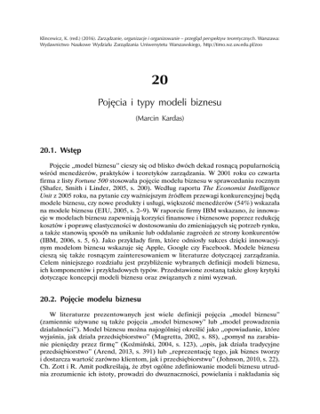 Klincewicz, K. (red.) (2016). Zarządzanie, organizacje i organizowanie – przegląd perspektyw teoretycznych. Warszawa: Wydawnictwo Naukowe Wydziału Zarządzania Uniwersytetu Warszawskiego, http://timo.wz.uw.edu.pl/zoo 20 Pojęcia i typy modeli biznesu (Marcin Kardas) 20.1. Wstęp Pojęcie „model biznesu” cieszy się od blisko dwóch dekad rosnącą popularnością wśród menedżerów, praktyków i teoretyków zarządzania. W 2001 roku co czwarta firma z listy Fortune 500 stosowała pojęcie modelu biznesu w sprawozdaniu rocznym (Shafer, Smith i Linder, 2005, s. 200). Według raportu The Economist Intelligence Unit z 2005 roku, na pytanie czy ważniejszym źródłem przewagi konkurencyjnej będą modele biznesu, czy nowe produkty i usługi, większość menedżerów (54%) wskazała na modele biznesu (EIU, 2005, s. 2–9). W raporcie firmy IBM wskazano, że innowacje w modelach biznesu zapewniają korzyści finansowe i biznesowe poprzez redukcję kosztów i poprawę elastyczności w dostosowaniu do zmieniających się potrzeb rynku, a także stanowią sposób na unikanie lub oddalanie zagrożeń ze strony konkurentów (IBM, 2006, s. 5, 6). Jako przykłady firm, które odniosły sukces dzięki innowacyjnym modelom biznesu wskazuje się Apple, Google czy Facebook. Modele biznesu cieszą się także rosnącym zainteresowaniem w literaturze dotyczącej zarządzania. Celem niniejszego rozdziału jest przybliżenie wybranych definicji modeli biznesu, ich komponentów i przykładowych typów. Przedstawione zostaną także głosy krytyki dotyczące koncepcji modeli biznesu oraz związanych z nimi wyzwań. 20.2. Pojęcie modelu biznesu W literaturze prezentowanych jest wiele definicji pojęcia „model biznesu” (zamiennie używane są także pojęcia „model biznesowy” lub „model prowadzenia działalności”). Model biznesu można najogólniej określić jako „opowiadanie, które wyjaśnia, jak działa przedsiębiorstwo” (Magretta, 2002, s. 88), „pomysł na zarabianie pieniędzy przez firmę” (Koźmiński, 2004, s. 123), „opis, jak działa tradycyjne przedsiębiorstwo” (Arend, 2013, s. 391) lub „reprezentację tego, jak biznes tworzy i dostarcza wartość zarówno klientom, jak i przedsiębiorstwu” (Johnson, 2010, s. 22). Ch. Zott i R. Amit podkreślają, że zbyt ogólne zdefiniowanie modeli biznesu utrudnia zrozumienie ich istoty, prowadzi do dwuznaczności, powielania i nakładania się Marcin Kardas – Pojęcia i typy modeli biznesu 299 koncepcji modeli biznesu na inne koncepcje zarządzania (Zott i Amit, 2013, s. 6). Model biznesu jest czymś więcej niż tylko dobrym i logicznym sposobem na robienie biznesu, gdyż musi przede wszystkim być ukierunkowany na potrzeby użytkowników, powinien być trudny do imitacji przez konkurentów i mocno oparty na realiach oraz uwarunkowaniach, w jakich działa przedsiębiorstwo (Teece, 2010, s. 192). W efekcie wielu autorów zajmujących się tematyką modeli biznesu proponuje bardziej szczegółowe i często rozbudowane definicje tego pojęcia. M. Morris, M. Schindehutte i J. Allen poddali analizie 30 definicji modeli biznesu, wyodrębniając trzy ujęcia i rodzaje definicji modeli biznesu: finansowe, operacyjne i strategiczne. Każdy z trzech rodzajów wiąże się z innym obszarem decyzji podejmowanych w firmach. Definicje finansowe określają model biznesu jako model finansowy, wskazujący, w jaki sposób firma generuje zyski. W definicjach operacyjnych kładzie się nacisk na wewnętrzne procesy umożliwiające firmie tworzenie wartości, zaś decyzje dotyczą architektury i konfiguracji tych procesów. Definicje strategiczne wskazują na aspekty związane z pozycjonowaniem firmy, współpracą z innymi podmiotami oraz możliwościami jej rozwoju, które wiążą się z decyzjami dotyczącymi identyfikacji interesariuszy, tworzenia wartości, zróżnicowania, wizji, wartości, sieci i aliansów (Morris, Schindehutte i Allen, 2005, s. 727). Zdaniem autorów model biznesu powinien prowadzić do tworzenia zrównoważonej przewagi konkurencyjnej firmy na danym rynku oraz uwzględniać zmienne decyzyjne odnoszące się do każdego z trzech wymienionych aspektów tj. strategicznego, operacyjnego i finansowego (Morris, Schindehutte i Allen, 2005, s. 727). Z kolei, Ch. Zott, R. Amit i L. Massa przeprowadzili analizę 103 publikacji dotyczących modeli biznesu i wskazali, że definicje modeli biznesu prezentują trzy główne perspektywy: • e-biznesu, systemów informacyjnych oraz zastosowania Internetu w organizacjach – odnoszące się do przedsiębiorstw internetowych, • zarządzania innowacjami i technologiami – odnoszące się do przedsiębiorstw technologicznych, • kwestii strategicznych związanych z tworzeniem wartości, przewagą konkurencyjną oraz wynikami przedsiębiorstw – odnoszące się do ogółu przedsiębiorstw (Zott, Amit i Massa, 2011, s. 2). Z perspektywy e-biznesu model biznesu jest określany „jako architektura produktu, usług lub przepływu informacji, zawierająca opis różnych aktorów biznesowych i ich ról, opis potencjalnych korzyści dla różnych aktorów biznesowych oraz opis źródeł przychodów” (Timmers, 1998, s. 2) bądź „przyjęta przez firmę metoda powiększania i wykorzystywania zasobów w celu przedstawienia klientom oferty produktów i usług, której wartość przewyższa ofertę konkurencji i która jednocześnie zapewnia firmie dochodowość” (Afuah i Tucci, 2003, s. 20). Ch. Zott, R. Amit i L. Massa wskazują, że definicje pozostające w nurcie e-biznesu skupiają się na prowadzeniu biznesu w Internecie oraz odwołują się do pojęcia wartości, aspektów finansowych, funkcjonowania sieci oraz współpracy z innymi podmiotami (Zott, Amit i Massa, 2011, s. 10). 300 III. EKONOMICZNE INSPIRACJE W ZARZĄDZANIU Spojrzenie na model biznesu z perspektywy zarządzania innowacjami przedstawili H. Chesbrough i R.S. Rosenbloom, według których model biznesu to heu