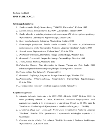 Dariusz Kosiński SPIS PUBLIKACJI Publikacje książkowe: 1. Sztuka aktorska Wandy Siemaszkowej, TAiWPN „Universitas”, Kraków 1997 2. Słownik postaci dramatycznych, TAiWPN „Universitas”, Kraków 1999 3. Sztuka aktorska w polskim piśmiennictwie teatralnym XIX wieku – główne problemy, Wydawnictwo Uniwersytetu Jagiellońskiego, Kraków 2003 4. Sceny z życia dramatu, Księgarnia Akademicka, Kraków 2004 5. Dramaturgia praktyczna. Polska sztuka aktorska XIX wieku w piśmiennictwie teatralnym swej epoki, Towarzystwo Naukowe „Societas Vistulana”, Kraków 2005 6. Słownik teatru, Wydawnictwo „Zielona Sowa”, Kraków 2006 7. Polski teatr przemiany, Instytut im. Jerzego Grotowskiego, Wrocław 2007 8. Grotowski. Przewodnik, Instytut im. Jerzego Grotowskiego, Wrocław 2009 9. Teatra polskie. Historie, Warszawa 2010 10. Polnisches Theatre. Eine Geschichte in Szenen, Theater der Zeit, Berlin 2011 (niemiecki przekład zmienionej wersji książki Teatra polskie. Historie) 11. Teatra polskie. Rok katastrofy, Warszawa 2013. 12. Grotowski. Profanacje, Instytut im. Jerzego Grotowskiego, Wrocław 2015 13. Performatyka. W(t)prowadzenia, Wydawnictwo Uniwersytetu Jagiellońskiego, Kraków 2016 14. „Teatra polskie. Historie” - przekład na język chiński, Pekin 2016 Książki redagowane 1. Misteria, inicjacje. Materiały z lat 1999–2000, „Kraków 2000”, Kraków 2001 (tu także przekłady tekstów A. Bélis, Kształcenie zawodowe kompozytorów, osób zapisujących muzykę i jej wykonawców w starożytnej Grecji, s. 97–106; oraz K. Vasudewana Nambudiripada Upanajanam – samskara edukacyjna, s. 173–181) 2. J. Osterwa, Przez teatr – poza teatr. Wybór pism, Towarzystwo Naukowe „Societas Vistulana”, Kraków 2004 (przedmowa i opracowanie redakcyjne wspólnie z I. Guszpitem) 3. Czechow sto lat później. Pod redakcją Wasilija Szczukina i Dariusza Kosińskiego, Wydawnictwo UJ, Kraków 2005. 4. Juliusz Osterwa, Antygona, Hamlet, Tobiasz dla Teatru Społecznego, opracowanie i wstęp wspólnie z I. Guszpitem, Wydawnictwo Uniwersytetu Wrocławskiego, Wrocław 2007. 5. Tradycja romantyczna w teatrze polskim, red. D. Kosiński, Towarzystwo Naukowe „Societas Vistulana”, Kraków 2007 6. W stronę praktyki – podręczniki sztuki aktorskiej, wspólnie z A. Marszałek, A. Wanicką i przy współpracy A. Narębskiej, Towarzystwo Naukowe „Societas Vistulana”, Kraków 2007; tu także: Wprowadzenie, s. 5-8; Wstęp [do:] W. Bogusławski, Dramaturgia…, s. 11-21; Wstęp, [do:] A. Trapszo, Podręcznik sztuki dramatycznej…, s. 351-362. 7. H. Meciszewski, Uwagi o teatrze krakowskim. Wybór pism teatralnych, wybór i opracowanie Dariusz Kosiński, Kraków 2008; tu także: Kilka uwag do Uwag…, s. 725. 8. Słowacki/Grotowski. Rekontekstualizacje. Pod redakcją Dariusza Kosińskiego i Wandy Świątkowskiej, Instytut im. Jerzego Grotowskiego, Wrocław 2010 (tu także wstęp: Przełamywanie, s. 7–10). 9. Nowe historie 1. Ustanawianie historii, pod redakcją Agaty Adamieckiej-Sitek, Doroty Buchwald i Dariusza Kosińskiego, Instytut Teatralny im. Z. Kraszewskiego, Warszawa 2010. 10. Józef Kotarbiński, Ze świata ułudy. Wybór pism teatralnych, Wybór i opracowanie Dariusz Kosiński, Wydawnictwo Towarzystwa Naukowego „Societas Vistulana”, Kraków 2012 11. Jerzy Grotowski, Teksty zebrane, Warszawa 2012 (członek międzynarodowego zespołu redakcyjnego; autor not do poszczególnych tekstów). 12. Między świętem a przesytem. Festiwale teatralne i ich miejsce we współczesnym życiu kulturalnym Polski pod redakcją Dariusza Kosińskiego, Teatr Lalek „Pleciuga”. Szczecin 2016 Artykuły naukowe 1. Teatr w piekle. Polskie życie teatralne w radzieckich więzieniach, obozach dla internowanych, miejscach zsyłek w latach II wojny światowej, w: Polacy w ZSRR, red. H. Kubiak, Kraków 1991, s. 307–319. 2. Wygnane z Krakowa (W. Siemaszkowa, I. Solska, S. Wysocka), w: Krakowskie rodowody teatralne, red. J. Michalik, Kraków 1994, s. 75–80. 3. Polskie życie teatralne w obozach dla internowanych na terenie ZSRR i Litwy w latach II wojny światowej, „Pamiętnik Teatralny” 1997, z. 1–4, s. 735–757. 4. Historia Miejskiego Nauczycielskiego Chóru "Gorce" do roku 1998 (współautor Olga Nosiewicz), „Almanach Nowotarski”, nr 3 (1998), s. 30–46. 5. Teatr polski poza krajem (współautor Emil Orzechowski), [w:] Encyklopedia kultury polskiej XX wieku. Teatr. Widowisko, red. M. Fik, Warszawa 2000, s. 595–624; wcześniej publikowane osobno jako broszura towarzysząca sesji naukowej „Polski dramat i teatr emigracyjny”, Poznań 1992. 6. Z, pomiędzy i ku. „Misteria, inicjacje” Kraków 2000. „Konteksty. Polska Sztuka Ludowa” 2001, nr 1–4, s. 132–141. 7. Róża i dziecię. O „Kordianie” Juliusza Słowackiego „Twórczość” 2001, nr 6, s. 56– 73. 8. Aktorstwo, jakim się wydaje, „Dialog” 2001, nr 8, s. 129–135. 9. Teatr, którego nie będzie, „Dialog” 2002 nr 1–2, s. 177–190 (także polemika związana z tym artykułem: Don Kichote w okopach, „Dialog” 2002, nr 5, s. 209–213). 10. Zgaszona lampa. O „Marii Stuart” Juliusza Słowackiego, „Dialog” 2003, nr 4, s. 122–131. 11. Praca aktora nad sobą w teatrze XIX-wiecznym, „Dialog” 2003, nr 6, s. 168–174. 12. Podróż to nie przelewki. Z Przemyśla do Przeszowy Aleksandra Fredry, „Dialog” 2004, nr 4, s. 168–177 (wersja zmieniona i skrócona: Program przedstawienia A. Fredro Eurocity – Z Przemyśla do Przeszowy, Teatr Polski w Warszawie, prem. 30 XI 2005) 13. Między wniebowzięciem a majaczeniem – kilka uwag o polskich prapremierach Hanusi Gerharta Hauptmanna, [w:] Dramat obcy w Polsce w XIX i XX wieku, red. W. Kaczmarek i J. Michalczuk, Lublin 2004, s. 331–346 14. A ja za nią nieboraczek boso…, „Dialog” 2004 nr 9, s. 5–11 15. W odpowiedzi, „Didaskalia” nr 63 z X 2004, s. 48–51. 16. Przedmiot, którego nie ma, „Notatnik Teatralny” 2004, nr 35, s. 1