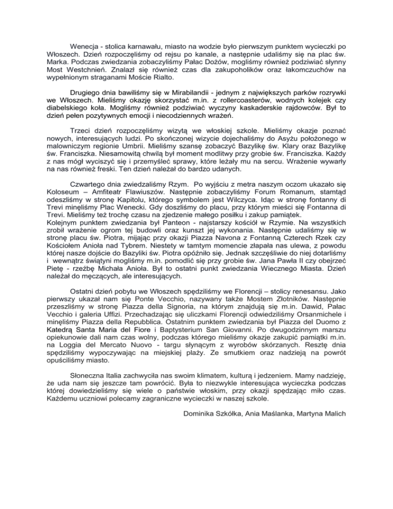 Wenecja - stolica karnawału, miasto na wodzie było pierwszym punktem wycieczki po Włoszech. Dzień rozpoczęliśmy od rejsu po kanale, a następnie udaliśmy się na plac św. Marka. Podczas zwiedzania zobaczyliśmy Pałac Dożów, mogliśmy również podziwiać słynny Most Westchnień. Znalazł się również czas dla zakupoholików oraz łakomczuchów na wypełnionym straganami Moście Rialto. Drugiego dnia bawiliśmy się w Mirabilandii - jednym z największych parków rozrywki we Włoszech. Mieliśmy okazję skorzystać m.in. z rollercoasterów, wodnych kolejek czy diabelskiego koła. Mogliśmy również podziwiać wyczyny kaskaderskie rajdowców. Był to dzień pełen pozytywnych emocji i niecodziennych wrażeń. Trzeci dzień rozpoczęliśmy wizytą we włoskiej szkole. Mieliśmy okazje poznać nowych, interesujących ludzi. Po skończonej wizycie dojechaliśmy do Asyżu położonego w malowniczym regionie Umbrii. Mieliśmy szansę zobaczyć Bazylikę św. Klary oraz Bazylikę św. Franciszka. Niesamowitą chwilą był moment modlitwy przy grobie św. Franciszka. Każdy z nas mógł wyciszyć się i przemyśleć sprawy, które leżały mu na sercu. Wrażenie wywarły na nas również freski. Ten dzień należał do bardzo udanych. Czwartego dnia zwiedzaliśmy Rzym. Po wyjściu z metra naszym oczom ukazało się Koloseum – Amfiteatr Flawiuszów. Następnie zobaczyliśmy Forum Romanum, stamtąd odeszliśmy w stronę Kapitolu, którego symbolem jest Wilczyca. Idąc w stronę fontanny di Trevi minęliśmy Plac Wenecki. Gdy doszliśmy do placu, przy którym mieści się Fontanna di Trevi. Mieliśmy też trochę czasu na zjedzenie małego posiłku i zakup pamiątek. Kolejnym punktem zwiedzania był Panteon - najstarszy kościół w Rzymie. Na wszystkich zrobił wrażenie ogrom tej budowli oraz kunszt jej wykonania. Następnie udaliśmy się w stronę placu św. Piotra, mijając przy okazji Piazza Navona z Fontanną Czterech Rzek czy Kościołem Anioła nad Tybrem. Niestety w tamtym momencie złapała nas ulewa, z powodu której nasze dojście do Bazyliki św. Piotra opóźniło się. Jednak szczęśliwie do niej dotarliśmy i wewnątrz świątyni mogliśmy m.in. pomodlić się przy grobie św. Jana Pawła II czy obejrzeć Pietę - rzeźbę Michała Anioła. Był to ostatni punkt zwiedzania Wiecznego Miasta. Dzień należał do męczących, ale interesujących. Ostatni dzień pobytu we Włoszech spędziliśmy we Florencji – stolicy renesansu. Jako pierwszy ukazał nam się Ponte Vecchio, nazywany także Mostem Złotników. Następnie przeszliśmy w stronę Piazza della Signoria, na którym znajdują się m.in. Dawid, Pałac Vecchio i galeria Uffizi. Przechadzając się uliczkami Florencji odwiedziliśmy Orsanmichele i minęliśmy Piazza della Repubblica. Ostatnim punktem zwiedzania był Piazza del Duomo z Katedrą Santa Maria del Fiore i Baptysterium San Giovanni. Po dwugodzinnym marszu opiekunowie dali nam czas wolny, podczas którego mieliśmy okazje zakupić pamiątki m.in. na Loggia del Mercato Nuovo - targu słynącym z wyrobów skórzanych. Resztę dnia spędziliśmy wypoczywając na miejskiej plaży. Ze smutkiem oraz nadzieją na powrót opuściliśmy miasto. Słoneczna Italia zachwyciła nas swoim klimatem, kulturą i jedzeniem. Mamy nadzieję, że uda nam się jeszcze tam powrócić. Była to niezwykle interesująca wycieczka podczas której dowiedzieliśmy się wiele o państwie włoskim, przy okazji spędzając miło czas. Każdemu uczniowi polecamy zagraniczne wycieczki w naszej szkole. Dominika Szkółka, Ania Maślanka, Martyna Malich