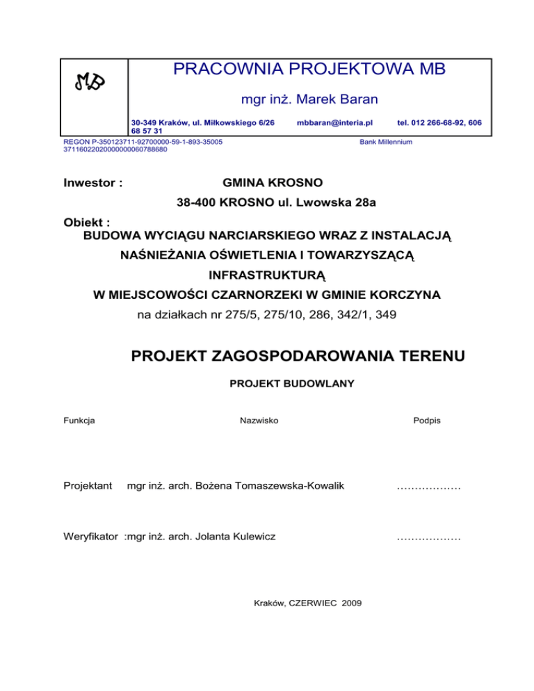PRACOWNIA PROJEKTOWA MB mgr inŜ. Marek Baran 30-349 Kraków, ul. Miłkowskiego 6/26 68 57 31 [email protected] REGON P-350123711-92700000-59-1-893-35005 37116022020000000060788680 Inwestor : tel. 012 266-68-92, 606 Bank Millennium GMINA KROSNO 38-400 KROSNO ul. Lwowska 28a Obiekt : BUDOWA WYCIĄGU NARCIARSKIEGO WRAZ Z INSTALACJĄ NAŚNIEśANIA OŚWIETLENIA I TOWARZYSZĄCĄ INFRASTRUKTURĄ W MIEJSCOWOŚCI CZARNORZEKI W GMINIE KORCZYNA na działkach nr 275/5, 275/10, 286, 342/1, 349 PROJEKT ZAGOSPODAROWANIA TERENU PROJEKT BUDOWLANY Funkcja Projektant Nazwisko mgr inŜ. arch. BoŜena Tomaszewska-Kowalik Weryfikator :mgr inŜ. arch. Jolanta Kulewicz Kraków, CZERWIEC 2009 Podpis ……………… ……………… SPIS ZAWARTOŚCI OPRACOWANIA 1. Część opisowa 1.1. Strona tytułowa 1.2. Spis zawartości opracowania 1.3. Opis techniczny 2. Cześć rysunkowa 2.1. Projekt zagospodarowania terenu - skala 1:500 P-1 2.2. Orientacja 1 : 5000 P-2 OPIS TECHNICZNY 1. Przedmiot i zakres opracowania Przedmiotem niniejszego opracowania jest projekt zagospodarowania terenu dla inwestycji: BUDOWA WYCIĄGU NARCIARSKIEGO WRAZ Z INSTALACJĄ NAŚNIEśANIA OŚWIETLENIA I TOWARZYSZĄCĄ INFRASTRUKTURĄ W MIEJSCOWOŚCI CZARNORZEKI W GMINIE KORCZYNA na działkach nr 275/5, 275/10, 286, 342/1, 349 Inwestorem jest GMINA KROSNO adres: 38-400 KROSNO ul. Lwowska 28a Inwestycja obejmuje: : - budowę wyciągu narciarskiego podporowego - budowę schodów zejściowych z parkingu - budynku pompowni naśnieŜania - ujęcia wody na potoku „bez nazwy”, zbiornika magazynowego, instalacji pompowni i instalacji naśnieŜania - oświetlenia terenu - zasilanie elektryczne – budowę przyłącza ze stacji transformatorowej Czarnorzeki 1 (65) odrębne opracowanie – zgłoszenie w myśl art. 29 i 30 Prawa budowlanego (Dz. U. z 2000 r. Nr 106 poz.1126 z późn. zm.). 2. Podstawa opracowania - umowa z nr IK.VIIII.165.342/28/07 zawarta między Gminą Krosno a Pracownią Projektową MB Kraków. - mapa sytuacyjno wysokościowa do celów projektowych w podz. 1 : 500 - projekt wyciągu narciarskiego - projekt budynku pompowni - projekt schodów zejściowych - projekt ujęcia wody i instalacji naśnieŜania - projekt instalacji elektrycznych - ustalenia i projektowania uzgodnienia z inwestorem dokonywane w trakcie - ustawa z dnia 7 lipca 1994 r. – Prawo budowlane (Dz. U. z 2000 r. Nr 106 poz.1126 z późn. zm.) 3. Stan istniejący Na terenie przeznaczonym dla inwestycji od około dwudziestu lat funkcjonuje ośrodek narciarski wyposaŜony w wyciąg narciarski z budynkiem sterowni, trasą zjazdową oraz parkingiem i budynkiem socjalnym. Teren ośrodka narciarskiego jest zadrzewiony od strony zachodniej i wschodniej, w części górnej na grzbiecie wzniesienia ma część prawie płaską a parking i budynek socjalny w pobliŜu potoku bez nazwy znajdującą się u podnóŜa wzniesienia . Celem inwestycji jest modernizacja ośrodka narciarskiego poprzez wymianę i wydłuŜenie wyciągu narciarskiego, budowę instalacji sztucznego zaśnieŜania i oświetlenia stoku. 4. Projekt zagospodarowania terenu Projekt opracowano zgodnie z warunkami określonymi w decyzji o ustaleniu lokalizacji celu publicznego, znak: GDP-7331/12/08 wydana 22.09.2008 r. przez Wójta Gminy Korczyna. . Na terenie wchodzącym w zakres opracowania, w jego zachodniej części, na działkach 275/5, 275/10, 286, 342/1, 349 budowany będzie wyciąg narciarski podporowy . Realizacja całości inwestycji nie będzie wymagać wycinki drzew. Jako sterownia wyciągu wykorzystany zostanie istniejący budynek sterowni istniejącego wyciągu Usytuowanie fundamentów dolnej stacji wyciągu i podpór trasowych na gruncie klasy PsV oraz stacji górnej na gruncie o klasie RVI nie wymaga wyłączenia z produkcji rolnej . Istniejąca trasa narciarska uŜytkowana będzie czasowo– w okresie zimowym . Trasa wyciągu i miejsca posadowienia podpór zostały zaprojektowane zgodnie z wytycznymi producenta wyciągów. Projekt budowlany wyciągu narciarskiego zawarty jest w następnych rozdziałach projektu. Na działce 275/5 zlokalizowane są schody zejściowe, ujęcie wody i spust wody, zbiornik magazynowy oraz pompownia. Instalacja naśnieŜania poprowadzona jest wzdłuŜ trasy wyciągu narciarskiego. Instalacja oświetlenia poprowadzona jest wzdłuŜ trasy wyciągu oraz drugą nitką po wschodniej stronie trasy zjazdowej. Dojazd do projektowanego terenu z drogi gminnej znajdującej się po północnej stronie zakresu opracowania bezpośrednio na istniejący parking. 5. Wpływ inwestycji na środowisko naturalne Planowana Inwestycja ma stosunkowo niewielki zasięg i skalę oddziaływań na środowisko , nie wykraczający (oprócz emisji hałasu) poza granice działek stanowiących własność lub dzierŜawionych przez Inwestora. Zachowane zostały warunki zawarte w decyzji o środowiskowych uwarunkowaniach zgody na realizację przedsięwzięcia, znak: OŚR/7624/1/08 wydana 31.marca.2009 r. przez Wójta Gminy Korczyna, w tym warunki dotyczące ochrony płazów poza sezonem zimowym. 6. Zasilanie w energię elektryczną Zasilanie w energię elektryczną – zgodnie z warunkami przyłączenia do sieci elektroenergetycznej znak RDEVI/ZP/10/682/2007/1265 z dnia 08.10.2007 r. wydanymi przez RZE Dystrybucja Sp. z o.o. Rejon Dystrybucji Energii Krosno w drugim etapie inwestycji. 7. Dane liczbowe: Zostały zachowane warunki zabudowy zawarte w decyzji o ustaleniu lokalizacji celu publicznego, znak: GDP-7331/12/08 wydanej 22.09.2008 r. przez Wójta Gminy Korczyna.. Całkowita powierzchnia objęta zakresem opracowania: 3,58 ha Powierzchnia objęta obiektami opracowania: Wyciąg narciarski podporowy 0,180 ha Powierzchnia fundamentów wyciągu 44,4 m2 Długość wyciągu (po stoku) -402 m Powierzchnia schodów zejściowych 41,6 m2 Powierzchnia budynku pompowni 17,6 m2 Powierzchnia stawu magazynowego 415,0 m2 Łączna powierzchnia projektowanej zabudowy: 919,2m2 Powierzchnia terenu biologicznie czynnego