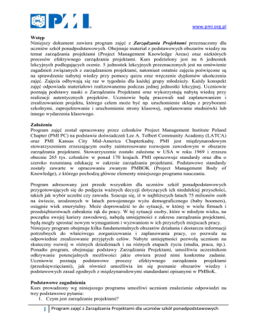 www.pmi.org.pl Wstęp Niniejszy dokument zawiera program zajęć z Zarządzania Projektami przeznaczony dla uczniów szkół ponadpodstawowych. Obejmuje materiał z podstawowych obszarów wiedzy na temat zarządzania projektami (Project Management Knowledge Areas) oraz niektórych procesów efektywnego zarządzania projektami. Kurs podzielony jest na 6 jednostek lekcyjnych podlegających ocenie. 5 jednostek lekcyjnych przeznaczonych jest na omówienie zagadnień związanych z zarządzaniem projektami, natomiast ostatnie zajęcia poświęcone są na sprawdzenie nabytej wiedzy przy pomocy quizu oraz wręczenie dyplomów ukończenia zajęć. Zajęcia odbywają się raz w tygodniu dla każdej grupy młodzieży. Każdy konspekt zajęć odpowiada materiałowi realizowanemu podczas jednej jednostki lekcyjnej. Uczniowie poznają podstawy nauki o Zarządzaniu Projektami oraz wykorzystują nabytą wiedzę przy realizacji autentycznych projektów. Uczniowie będą pracowali nad zaplanowaniem i zrealizowaniem projektu, którego celem może być np. uruchomienie sklepu z przyborami szkolnymi, zaprojektowanie i uruchomienie strony klasowej, zaplanowanie studniówki lub innego wydarzenia klasowego. Założenia Program zajęć został opracowany przez członków Project Management Institute Poland Chapter (PMI PC) na podstawie doświadczeń Lee A. Tolbert Community Academy (LATCA) oraz PMI Kansas City Mid-America Chapterkadrę. PMI jest międzynarodowym stowarzyszeniem zrzeszającym osoby zainteresowane rozwojem zawodowym w obszarze zarządzania projektami. Stowarzyszenie zostało założone w USA w roku 1969 i zrzesza obecnie 265 tys. członków w ponad 170 krajach. PMI opracowuje standardy oraz dba o szeroko rozumianą edukację w zakresie zarządzania projektami. Podstawowe standardy zostały zawarte w opracowaniu zwanym PMBOK (Project Management Body of Knowledge), z którego pochodzą główne elementy niniejszego programu nauczania. Program adresowany jest przede wszystkim dla uczniów szkół ponadpodstawowych przygotowujących się do podjęcia ważnych decyzji dotyczących ich niedalekiej przyszłości, takich jak wybór uczelni czy zawodu. Szacuje się, iż w najbliższych latach 75 milionów osób na świecie, urodzonych w latach powojennego wyżu demograficznego (baby boomers), osiągnie wiek emerytalny. Może doprowadzić to do sytuacji, w której w wielu firmach i przedsiębiorstwach zabraknie rąk do pracy. W tej sytuacji osoby, które w młodym wieku, na początku swojej kariery zawodowej, nabędą umiejętności z zakresu zarządzania projektami, będą mogły sprostać nowym wymaganiom i wyzwaniom w ich przyszłych miejscach pracy. Niniejszy program obejmuje kilka fundamentalnych obszarów działania i dostarcza informacji potrzebnych do właściwego zorganizowania i zaplanowania pracy, co pozwala na odpowiednie zrealizowanie przyjętych celów. Nabyte umiejętności pozwolą uczniom na skuteczny rozwój w różnych dziedzinach i na różnych etapach życia (studia, praca, itp.). Ponadto program, obejmując podstawy Zarządzania Projektami, umożliwia uczestnikom odkrywanie potencjalnych możliwości jakie otwiera przed nimi konkretne zadanie. Uczniowie poznają podstawowe procesy efektywnego zarządzania projektami (przedsięwzięciami), jak również umożliwia im się poznanie obszarów wiedzy i podstawowych zasad zgodnych z międzynarodowymi standardami opisanymi w PMBoK. Podstawowe zagadnienia Kurs prowadzony wg niniejszego programu umożliwi uczniom znalezienie odpowiedzi na trzy podstawowe pytania: 1. Czym jest zarządzanie projektami? 1 Program zajęć z Zarządzania Projektami dla uczniów szkół ponadpodstawowych www.pmi.org.pl 2. W jaki sposób planuje i realizuje się projekty? 3. Dlaczego należy posiąść umiejętność zarządzania projektami? Spodziewane Rezultaty Słuchacze kursu dowiedzą się jak powstają projekty oraz nauczą się jak szczegółowo zaplanować projekt. Ponadto wezmą udział w określaniu zakresu projektu oraz ustalaniu harmonogramu działań w projekcie szkolnym. Wiedza ta pomoże uczniom w podejmowaniu odpowiednich decyzji finansowych, np. we właściwym planowaniu kosztów (budżetu) projektu i komunikowaniu realizacji budżetu. Uczestnicy zajęć będą monitorować i kontrolować prace nad projektem poprzez opracowywanie specjalnego raportu oraz nauczą się umiejętności komunikacji przedstawiając w czasie zajęć ustne sprawozdanie z postępów w realizacji projektu. Nabyte w czasie zajęć umiejętności przydadzą im się w wielu sferach życia. Uczestnicy będą nabywać też doświadczenie, jakie będą mogli wykorzystać w dążeniu do objęcia w przyszłości stanowisk związanych z kierowaniem projektami. Uczestnicy zajęć będą przedstawiać plany swoich projektów całej grupie rozwijając w ten sposób umiejętność prezentacji i przemawiania w obecności większej grupy osób. W celu umożliwienia głębszej refleksji i ugruntowania nauczanych sprawności w czasie każdych zajęć omawiane będą prawdziwe projekty. Zwiększeniu efektywności zajęć służyć również będą różnorodne ćwiczenia, które uczestnicy będą musieli wykonać zarówno na zajęciach jak i w formie pracy domowej. Po każdej lekcji uczniowie będą zobowiązani do wykonania zadania domowego (raz w tygodniu), które zostanie ocenione i pozwoli określić stopień przyswojenia treści i postępy uczestnika. Test sprawdzający przeprowadzony w czasie ostatnich zajęć kursu, w celu wystawienia uczestnikom odpowiedniej/końcowej oceny, obejmie materiał z wszystkich poprzednich lekcji. Podczas zajęć uczniowie zapoznają się również z podstawowymi pojęciami z zakresu zarządzania projektami w języku angielskim. Organizacja zajęć Uczestnicy zostaną podzieleni na czteroosobowe zespoły. Każda grupa będzie miała za zadanie utworzyć swój plan projektu do jakiego zostanie przypisana, a który zostanie przedstawiony w siódmym i ósmym tyg