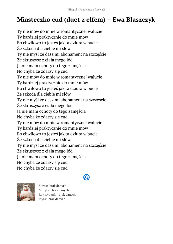 iSing.pl - Każdy może śpiewać! Miasteczko cud (duet z elfem) – Ewa Błaszczyk Ty nie mów do mnie w romantycznej walucie Ty bardziej praktycznie do mnie mów Bo chwilowo to jesteś jak ta dziura w bucie Że szkoda dla ciebie mi słów Ty nie myśl że dasz mi abonament na szczęście Że skruszysz z ciała mego lód Ja nie mam ochoty do tego zamęścia No chyba że zdarzy się cud Ty nie mów do mnie w romantycznej walucie Ty bardziej praktycznie do mnie mów Bo chwilowo to jesteś jak ta dziura w bucie Że szkoda dla ciebie mi słów Ty nie myśl że dasz mi abonament na szczęście Że skruszysz z ciała mego lód Ja nie mam ochoty do tego zamęścia No chyba że zdarzy się cud Ty nie mów do mnie w romantycznej walucie Ty bardziej praktycznie do mnie mów Bo chwilowo to jesteś jak ta dziura w bucie Że szkoda dla ciebie mi słów Ty nie myśl że dasz mi abonament na szczęście Że skruszysz z ciała mego lód Ja nie mam ochoty do tego zamęścia No chyba że zdarzy się cud No chyba że zdarzy się cud Słowa: brak danych Muzyka: brak danych Rok wydania: brak danych Płyta: brak danych