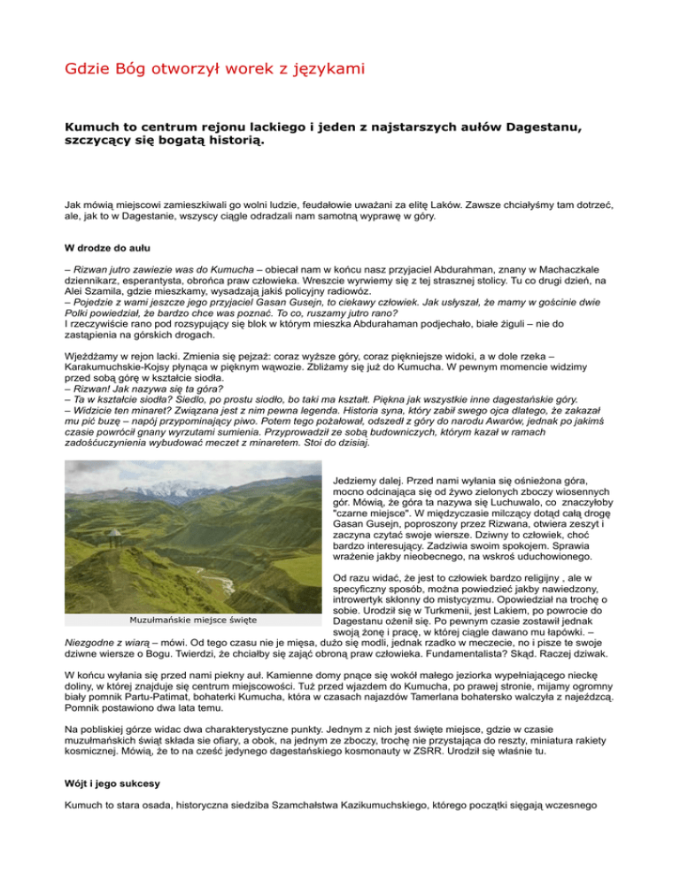 Gdzie Bóg otworzył worek z językami Kumuch to centrum rejonu lackiego i jeden z najstarszych aułów Dagestanu, szczycący się bogatą historią. Jak mówią miejscowi zamieszkiwali go wolni ludzie, feudałowie uważani za elitę Laków. Zawsze chciałyśmy tam dotrzeć, ale, jak to w Dagestanie, wszyscy ciągle odradzali nam samotną wyprawę w góry. W drodze do aułu – Rizwan jutro zawiezie was do Kumucha – obiecał nam w końcu nasz przyjaciel Abdurahman, znany w Machaczkale dziennikarz, esperantysta, obrońca praw człowieka. Wreszcie wyrwiemy się z tej strasznej stolicy. Tu co drugi dzień, na Alei Szamila, gdzie mieszkamy, wysadzają jakiś policyjny radiowóz. – Pojedzie z wami jeszcze jego przyjaciel Gasan Gusejn, to ciekawy człowiek. Jak usłyszał, że mamy w gościnie dwie Polki powiedział, że bardzo chce was poznać. To co, ruszamy jutro rano? I rzeczywiście rano pod rozsypujący się blok w którym mieszka Abdurahaman podjechało, białe żiguli – nie do zastąpienia na górskich drogach. Wjeżdżamy w rejon lacki. Zmienia się pejzaż: coraz wyższe góry, coraz piękniejsze widoki, a w dole rzeka – Karakumuchskie-Kojsy płynąca w pięknym wąwozie. Zbliżamy się już do Kumucha. W pewnym momencie widzimy przed sobą górę w kształcie siodła. – Rizwan! Jak nazywa się ta góra? – Ta w kształcie siodła? Siedlo, po prostu siodło, bo taki ma kształt. Piękna jak wszystkie inne dagestańskie góry. – Widzicie ten minaret? Związana jest z nim pewna legenda. Historia syna, który zabił swego ojca dlatego, że zakazał mu pić buzę – napój przypominający piwo. Potem tego pożałował, odszedł z góry do narodu Awarów, jednak po jakimś czasie powrócił gnany wyrzutami sumienia. Przyprowadził ze sobą budowniczych, którym kazał w ramach zadośćuczynienia wybudować meczet z minaretem. Stoi do dzisiaj. Jedziemy dalej. Przed nami wyłania się ośnieżona góra, mocno odcinająca się od żywo zielonych zboczy wiosennych gór. Mówią, że góra ta nazywa się Luchuwalo, co znaczyłoby "czarne miejsce". W międzyczasie milczący dotąd całą drogę Gasan Gusejn, poproszony przez Rizwana, otwiera zeszyt i zaczyna czytać swoje wiersze. Dziwny to człowiek, choć bardzo interesujący. Zadziwia swoim spokojem. Sprawia wrażenie jakby nieobecnego, na wskroś uduchowionego. Od razu widać, że jest to człowiek bardzo religijny , ale w specyficzny sposób, można powiedzieć jakby nawiedzony, introwertyk skłonny do mistycyzmu. Opowiedział na trochę o sobie. Urodził się w Turkmenii, jest Lakiem, po powrocie do Muzułmańskie miejsce święte Dagestanu ożenił się. Po pewnym czasie zostawił jednak swoją żonę i pracę, w której ciągle dawano mu łapówki. – Niezgodne z wiarą – mówi. Od tego czasu nie je mięsa, dużo się modli, jednak rzadko w meczecie, no i pisze te swoje dziwne wiersze o Bogu. Twierdzi, że chciałby się zająć obroną praw człowieka. Fundamentalista? Skąd. Raczej dziwak. W końcu wyłania się przed nami piekny auł. Kamienne domy pnące się wokół małego jeziorka wypełniającego nieckę doliny, w której znajduje się centrum miejscowości. Tuż przed wjazdem do Kumucha, po prawej stronie, mijamy ogromny biały pomnik Partu-Patimat, bohaterki Kumucha, która w czasach najazdów Tamerlana bohatersko walczyła z najeźdzcą. Pomnik postawiono dwa lata temu. Na pobliskiej górze widac dwa charakterystyczne punkty. Jednym z nich jest święte miejsce, gdzie w czasie muzułmańskich świąt składa sie ofiary, a obok, na jednym ze zboczy, trochę nie przystająca do reszty, miniatura rakiety kosmicznej. Mówią, że to na cześć jedynego dagestańskiego kosmonauty w ZSRR. Urodził się właśnie tu. Wójt i jego sukcesy Kumuch to stara osada, historyczna siedziba Szamchałstwa Kazikumuchskiego, którego początki sięgają wczesnego średniowiecza. Szamchałstwo powstało na ziemiach Laków i było w XV–XVII w. jednym z najsilniejszych dagestańskich organizmów państwowych. Organizacja społeczna Laków opierała się na podziale na wolne społeczności wiejskie – tzw. dżamaaty, rządzone przez radę starszych. Nowe porządki, które przyszły wraz z władzą radziecką doprowadziły do zniszczenia tych społeczności – jak się jednak okazuje nie całkowitego – wiele dawnych struktur, paradoksalnie, przetrwało pod osłoną kołchozu. Dawne obowiązki wobec dżamaatu pokryły się częściowo z tymi wobec kołchozu. Stopniowo zanikała jednak religijna funkcja wspólnoty. Dziś Lakowie to jedna z większych grup etnicznych w Dagestanie (140 tys.), zamieszkują głównie rejony lacki i kuliński oraz Machaczkałę. Mówią w języku lackim, mającym kilka dialektów. Są muzułmanami–sunnitami, jednak, na tle innych etnosów Dagestanu, niezbyt religijnymi. Zaraz po przyjeździe udajemy się do siedziby administracji rejonu Wójt Kumucha mentalnie jeszcze nie rozstał się z czasami radzieckimi. Wśród miejscowych władz to nie rzadkość. Na biurku gazeta Sowietski Dagiestan. Wójt, widząc nasze zaciekawienie, chowa ją. – A, takie mi tu bzdury przynoszą... Nad telewizorem w gabinecie wisi portret Putina. Będziemy musiały wypić morze koniaku i zagryzać cukierkami. Tego wymaga gościnność. – Nu, Kinsabinau! To po lacku toast 'Na zdrowie', pijcie dziewczyny. Cieszymy się, że odwiedziłyście nasz piekny Kumuch. Pijcie, pijcie do dna nasz dobry dagestański koniak to dostaniecie ten piękny róg a jak nie to będziecie za karę musiały cały taki róg wypić – żartują urzędnicy. Róg w końcu dostałyśmy. Wójt i jego zastępca rozgadali się. Rejon się rozwija, młodzi nie wyjeżdżają, mają tu perspektywy, ziemię można brać prawie za darmo, byle tylko ją uprawiać. Pełna demokracja, władze wybiera się w wyborach.... Ciekawe tylko dlaczego wciąż te same od czasów radzieckich. Obecny zastępca był wówczas szefem rajkomu, czym pochwaliła się jego żon