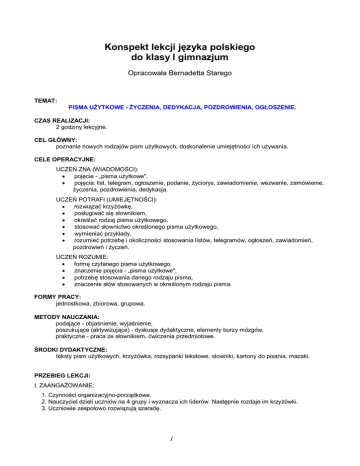 Konspekt lekcji języka polskiego do klasy l gimnazjum Opracowała Bernadetta Starego TEMAT: PISMA UŻYTKOWE - ŻYCZENIA, DEDYKACJA, POZDROWIENIA, OGŁOSZENIE. CZAS REALIZACJI: 2 godziny lekcyjne. CEL GŁÓWNY: poznanie nowych rodzajów pism użytkowych, doskonalenie umiejętności ich używania. CELE OPERACYJNE: UCZEŃ ZNA (WIADOMOŚCI): • pojęcie - „pisma użytkowe", • pojęcia: list, telegram, ogłoszenie, podanie, życiorys, zawiadomienie, wezwanie, zamówienie, życzenia, pozdrowienia, dedykacja. UCZEŃ POTRAFI (UMIEJĘTNOŚCI): • rozwiązać krzyżówkę, • posługiwać się słownikiem, • określać rodzaj pisma użytkowego, • stosować słownictwo określonego pisma użytkowego, • wymieniać przykłady, • rozumieć potrzebę i okoliczności stosowania listów, telegramów, ogłoszeń, zawiadomień, pozdrowień i życzeń. UCZEŃ ROZUMIE: • formę czytanego pisma użytkowego, • znaczenie pojęcia - „pisma użytkowe", • potrzebę stosowania danego rodzaju pisma, • znaczenie słów stosowanych w określonym rodzaju pisma. FORMY PRACY: jednostkowa, zbiorowa, grupowa. METODY NAUCZANIA: podające - objaśnienie, wyjaśnienie, poszukujące (aktywizujące) - dyskusje dydaktyczne, elementy burzy mózgów, praktyczne - praca ze słownikiem, ćwiczenia przedmiotowe. ŚRODKI DYDAKTYCZNE: teksty pism użytkowych, krzyżówka, rozsypanki tekstowe, słowniki, kartony do pisania, mazaki. PRZEBIEG LEKCJI: I. ZAANGAŻOWANIE: 1. Czynności organizacyjno-porządkowe. 2. Nauczyciel dzieli uczniów na 4 grupy i wyznacza ich liderów. Następnie rozdaje im krzyżówki. 3. Uczniowie zespołowo rozwiązują szaradę. 1 2. S I E N O W I E Ś K I E W I C Z 3. S A C H E M 4. M A R Y L A S J A A R O L A N D 6. S Z T U K A 7. Ż O N A D Y S K U 9. T E Z A T Y K U Ł 11. F O N E T Y K 12. W Y W I A D Z E M S T A A R 13. 1) 2) 3) 4) 5) 6) 7) 8) 9) 10) 11) 12) 13) P 5. 8. 10. 1. Ć Mówi w niej narrator. Otrzymał NAGRODĘ NOBLA w 1905 r. Wódz Czarnych Wężów. Ukochana Mickiewicza. Rycerz, który poległ w Pirenejach. Plastyka, muzyka to razem .... "... modna". Uczestniczy w niej kilka osób omawiając temat. Pierwsza część rozprawia. Przeczytany np. w gazecie. Nauka o głoskach i ich powstawaniu. Przeprowadza go dziennikarz. Tytuł utworu A. Fredry. 4. Nauczyciel obserwuje i koordynuje pracę w zespołach. 5. Lider wybranej grupy odczytuje rozwiązania i hasło: PISMA UŻYTKOWE. 6. Nauczyciel podaje temat lekcji i zapisuje go na tablicy. TEMAT: PISMA UŻYTKOWE - ŻYCZENIA, DEDYKACJA, POZDROWIENIA, OGŁOSZENIE. 7. Nauczyciel określa cele zajęć, kieruje rozmową uczniów, zadaje pytania i wyjaśnia dlaczego ważna jest umiejętność poprawnego redagowania pism użytkowych. 8. Uczniowie próbują określić co to są pisma użytkowe oraz sformułować ich przeznaczenie. II. BADANIE: 1. Nauczyciel rozdaje zespołom uczniowskim słowniki oraz przykłady pism użytkowych (list, podanie, życiorys własny, telegram, zawiadomienie). 2. Uczniowie pracują zgodnie z podaną instrukcją. Przy pomocy słowników wyjaśniają znaczenie hasła z krzyżówki oraz określają ich rodzaje. Uczniowie w poszczególnych zespołach dyskutują i próbują nazwać rozdane przykłady pism użytkowych oraz określić cechy charakterystyczne zadanego pisma (listu, podania, życiorysu własnego, telegramu, zawiadomienia). 3. Nauczyciel obserwuje pracę w grupach i sprawdza w jakim stopniu uczniowie umieją korzystać ze słownika i wyszukać potrzebne informacje. 4. Wybrany przez nauczyciela uczeń definiuje pojęcie „pism użytkowych” oraz określa ich rodzaje. 5. Liderzy z grup prezentują wybrane pismo użytkowe (list, podanie, życiorys własny, telegram, zawiadomienie) i określają jego cechy charakterystyczne. 6. Nauczyciel koryguje ewentualne błędy uczniów, a następnie pisze na tablicy hasło: PISMA UŻYTKOWE. 7. Uczniowie wpisują w prostokąty swoje skojarzenia i pomysły. W ten sposób powstaje poniższe drzewo skojarzeń, które uczniowie przerysowują do zeszytów. 2 s dedykacja zawiadomienie życzenia telegram pozdrowienia podanie PISMA UŻYTKOWE życiorys ogłoszenie zaproszenie wezwanie zamówienie list III. PRZEKSZTAŁCANIE: 1. Nauczyciel omawia inne wybrane rozdaje pism użytkowych, podając cechy charakterystyczne dla danego rodzaju pisma. prywatny - treść dotyczy spraw prywatnych list urzędowy - treść dotyczy ważnej sprawy, którą może załatwić instytucja NADAWCA ODBIORCA EPISTOLOGRAFIA - dział literatury zajmujący się listami podanie kierujemy do jakiejś instytucji w celu załatwienia sprawy telegram wysyłamy, by przekazać jakąś informację (zwięzła, krótka treść) wezwanie stosuje się wówczas, gdy chcemy aby ktoś zjawił się w jakiejś instytucji zaproszenie stosuje się wtedy, gdy chcemy aby ktoś przybył na jakąś uroczystość; pisze osoba prywatna lub instytucja zamówienie składa się do jakiejś firmy w celu zakupu określonego towaru życiorys własny zawiadomienie pisze petent i dodaje jako załącznik do podania zawiadamiamy kogoś o czymś, może być zawiadomienie prywatne lub urzędowe 3 2. Nauczyciel rozdaje zespołom kartony, mazaki i koperty z rozsypankami tekstów użytkowych. 3. Uczniowie pracują zgodnie z podaną instrukcją. Zadaniem uczniów jest ułożenie rozsypanki zdaniowej w jednolity tekst, przepisanie go na kartonie (zachowując odpowiednią formę), określenie jaki to rodzaj pisma użytkowego i podanie jego cech charakterystycznych. 4. Nauczyciel obserwuje i koordynuje pracę w grupach, a przy trudnościach ewentualnie podpowiada możliwość skorzystania ze słownika. IV. PREZENTACJA: 1. Nauczyciel poleca przygotowanie się do prezentacji wyniku pracy zespołu. 2. Kolejno wybrani przez grupę uczniowie dokonują prezentacji otrzymanego pisma użytkowego i określają jego rodzaj oraz podają jego cech charakterystyczne. Pozostali uczniowie uważnie słuchają wypowiedzi kolegów i zwracają uwagę na ich popraw