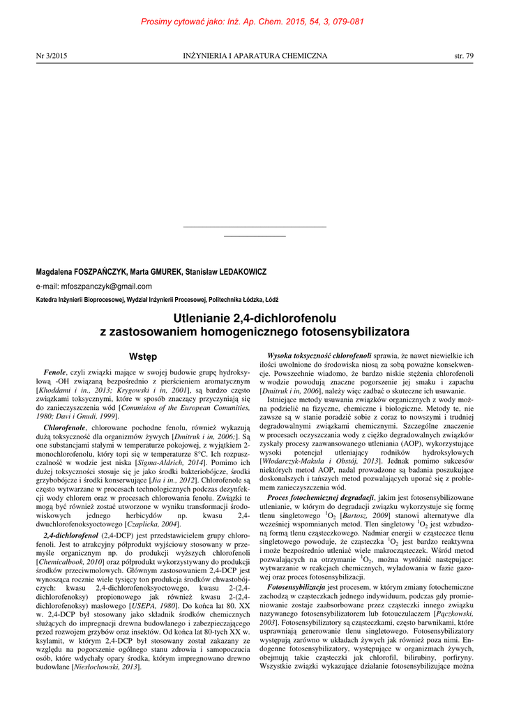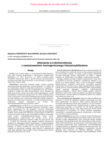 Prosimy cytować jako: Inż. Ap. Chem. 2015, 54, 3, 079-081 Nr 3/2015 INŻYNIERIA I APARATURA CHEMICZNA Wnioski Analizując wyniki otrzymane w przeprowadzonych doświadczeniach można stwierdzić, że szczepy bakteryjne należące do Actinobacteria wykazują zdolności flokulacyjne o zróżnicowanych aktywnościach. Szczególnie należy zwrócić uwagę na wysoką aktywność szczepu 89, która w przypadku płynu pohodowlanego wynosi 85% i co istotne, otrzymany preparat nie traci w znaczący sposób aktywności flokulacyjnej w wyniku kolejnych etapów oczyszczania. W przypadku tego szczepu otrzymano największą ilość preparatu bioflokulantu w przeliczeniu na 100 ml płynu pohodowlanego. LITERATURA Bradford M. M., 1976. A rapid and sensitive method for the quantitation of microgram quantities of protein utilizing the principle of protein-dye binding Anal. Bioch., 72, nr 1, 248-254. DOI:10.1006/abio.1976.9999 str. 79 Brathby J., 2006. Coagulation and flocculation in water and wastewater treatment. IWA Publishing, Londyn Dubois M., Gilles K. A., Hamilton J. K., Rebers P. A., Smith F., 1956. Colorimetric method for determination of sugars and related substances Anal. Chem., 28, nr 3, 350-356. DOI: 10.1021/ac60111a017 Kłyszejko-Stefanowicz L., 2003. Ćwiczenia z biochemii. PWN, Warszawa Kurane R., Hatamochi K., Kakuno T., Kiyohara M., Hirano M., Taniguchi Y., 1994. Production of a bioflocculant by Rhodococcus erythropolis S-1 grown on alcohols Biosci., Biotech. and Biochem., 58, nr 3, 428–429. DOI: 10.1271/bbb.58.428 Lee C. S., Robinson J., Chong M. F., 2014. A review on application of flocculants in wastewater treatment Process Saf. Environ., 92, nr 6, 489-508. DOI: 10.1016/j.psep.2014.04.010 Praca współfinansowana ze środków Narodowego Centrum Nauki w ramach grantu badawczego DEC-2012/07/B/ST5/01799. _____________________________________ ________________ Magdalena FOSZPAŃCZYK, Marta GMUREK, Stanisław LEDAKOWICZ e-mail: [email protected] Katedra Inżynierii Bioprocesowej, Wydział Inżynierii Procesowej, Politechnika Łódzka, Łódź Utlenianie 2,4-dichlorofenolu z zastosowaniem homogenicznego fotosensybilizatora Wstęp Fenole, czyli związki mające w swojej budowie grupę hydroksylową -OH związaną bezpośrednio z pierścieniem aromatycznym [Khoddami i in., 2013; Krygowski i in, 2001], są bardzo często związkami toksycznymi, które w sposób znaczący przyczyniają się do zanieczyszczenia wód [Commision of the European Comunities, 1980; Davi i Gnudi, 1999]. Chlorofenole, chlorowane pochodne fenolu, również wykazują dużą toksyczność dla organizmów żywych [Dmitruk i in, 2006;]. Są one substancjami stałymi w temperaturze pokojowej, z wyjątkiem 2monochlorofenolu, który topi się w temperaturze 8°C. Ich rozpuszczalność w wodzie jest niska [Sigma-Aldrich, 2014]. Pomimo ich dużej toksyczności stosuje się je jako środki bakteriobójcze, środki grzybobójcze i środki konserwujące [Jia i in., 2012]. Chlorofenole są często wytwarzane w procesach technologicznych podczas dezynfekcji wody chlorem oraz w procesach chlorowania fenolu. Związki te mogą być również zostać utworzone w wyniku transformacji środowiskowych jednego herbicydów np. kwasu 2,4dwuchlorofenoksyoctowego [Czaplicka, 2004]. 2,4-dichlorofenol (2,4-DCP) jest przedstawicielem grupy chlorofenoli. Jest to atrakcyjny półprodukt wyjściowy stosowany w przemyśle organicznym np. do produkcji wyższych chlorofenoli [Chemicalbook, 2010] oraz półprodukt wykorzystywany do produkcji środków przeciwmolowych. Głównym zastosowaniem 2,4-DCP jest wynosząca rocznie wiele tysięcy ton produkcja środków chwastobójczych: kwasu 2,4-dichlorofenoksyoctowego, kwasu 2-(2,4dichlorofenoksy) propionowego jak również kwasu 2-(2,4dichlorofenoksy) masłowego [USEPA, 1980]. Do końca lat 80. XX w. 2,4-DCP był stosowany jako składnik środków chemicznych służących do impregnacji drewna budowlanego i zabezpieczającego przed rozwojem grzybów oraz insektów. Od końca lat 80-tych XX w. ksylamit, w którym 2,4-DCP był stosowany został zakazany ze względu na pogorszenie ogólnego stanu zdrowia i samopoczucia osób, które wdychały opary środka, którym impregnowano drewno budowlane [Niesłochowski, 2013]. Wysoka toksyczność chlorofenoli sprawia, że nawet niewielkie ich ilości uwolnione do środowiska niosą za sobą poważne konsekwencje. Powszechnie wiadomo, że bardzo niskie stężenia chlorofenoli w wodzie powodują znaczne pogorszenie jej smaku i zapachu [Dmitruk i in, 2006], należy więc zadbać o skuteczne ich usuwanie. Istniejące metody usuwania związków organicznych z wody można podzielić na fizyczne, chemiczne i biologiczne. Metody te, nie zawsze są w stanie poradzić sobie z coraz to nowszymi i trudniej degradowalnymi związkami chemicznymi. Szczególne znaczenie w procesach oczyszczania wody z ciężko degradowalnych związków zyskały procesy zaawansowanego utleniania (AOP), wykorzystujące wysoki potencjał utleniający rodników hydroksylowych [Włodarczyk-Makuła i Obstój, 2013]. Jednak pomimo sukcesów niektórych metod AOP, nadal prowadzone są badania poszukujące doskonalszych i tańszych metod pozwalających uporać się z problemem zanieczyszczenia wód. Proces fotochemicznej degradacji, jakim jest fotosensybilizowane utlenianie, w którym do degradacji związku wykorzystuje się formę tlenu singletowego 1O2 [Bartosz, 2009] stanowi alternatywe dla wcześniej wspomnianych metod. Tlen singletowy 1O2 jest wzbudzoną formą tlenu cząsteczkowego. Nadmiar energii w cząsteczce tlenu singletowego powoduje, że cząsteczka 1O2 jest bardzo reaktywna i może bezpośrednio utleniać wiele makrocząsteczek. Wśród metod pozwalających na otrzymanie 1O2, można wyróżnić następujące: wytwarzanie w reakcjach chemicznych, wyładowania w fazie gazowej oraz proces fotosensybilizacji. Fotosensybilizacja jest procesem, w którym zmiany fotochemiczne zachodzą w cząsteczkach j
