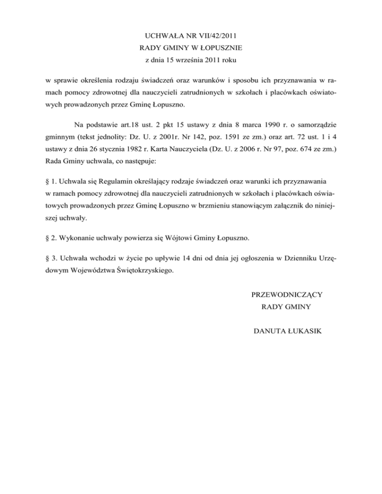 UCHWAŁA NR VII/42/2011 RADY GMINY W ŁOPUSZNIE z dnia 15 września 2011 roku w sprawie określenia rodzaju świadczeń oraz warunków i sposobu ich przyznawania w ramach pomocy zdrowotnej dla nauczycieli zatrudnionych w szkołach i placówkach oświatowych prowadzonych przez Gminę Łopuszno. Na podstawie art.18 ust. 2 pkt 15 ustawy z dnia 8 marca 1990 r. o samorządzie gminnym (tekst jednolity: Dz. U. z 2001r. Nr 142, poz. 1591 ze zm.) oraz art. 72 ust. 1 i 4 ustawy z dnia 26 stycznia 1982 r. Karta Nauczyciela (Dz. U. z 2006 r. Nr 97, poz. 674 ze zm.) Rada Gminy uchwala, co następuje: § 1. Uchwala się Regulamin określający rodzaje świadczeń oraz warunki ich przyznawania w ramach pomocy zdrowotnej dla nauczycieli zatrudnionych w szkołach i placówkach oświatowych prowadzonych przez Gminę Łopuszno w brzmieniu stanowiącym załącznik do niniejszej uchwały. § 2. Wykonanie uchwały powierza się Wójtowi Gminy Łopuszno. § 3. Uchwała wchodzi w Ŝycie po upływie 14 dni od dnia jej ogłoszenia w Dzienniku Urzędowym Województwa Świętokrzyskiego. PRZEWODNICZĄCY RADY GMINY DANUTA ŁUKASIK Załącznik Nr 1 do uchwały Nr VII/42/2011 Rady Gminy w Łopusznie z dnia 15 września 2011 r. Regulamin określający rodzaje świadczeń oraz warunki i sposób ich przyznawania w ramach pomocy zdrowotnej dla nauczycieli zatrudnionych w szkołach i placówkach prowadzonych przez gminę Łopuszno. Na podstawie: art. 72 ust. 1 i 4 ustawy z dnia 26 stycznia 1982 r. Karta Nauczyciela (tj. Dz.U. z 2006 r. Nr 97, poz. 674 ze zm.), art.18 ust. 2 pkt.15 ustawy z dnia 8 marca 1990 r. o samorządzie gminnym (tj. Dz.U. z 2001 r. Nr 142, poz.1591 ze zm.) § 1. Środki finansowe przeznaczone na pomoc zdrowotną dla nauczycieli, zwane dalej środkami finansowymi, wynoszą 0,1 % rocznego wynagrodzenia nauczycieli zatrudnionych w placówkach oświatowych podległych Gminie Łopuszno. § 2. Regulamin stosuje się do nauczycieli, o których mowa w art. 1 ust.1 pkt. 1-3 ustawy z dnia 26 stycznia 1982 r. Karta Nauczyciela, zatrudnionych co najmniej w połowie obowiązującego wymiaru godzin zajęć dydaktyczno-wychowawczych oraz dla nauczycieli emerytów i rencistów. § 3. Pomoc zdrowotna udzielana jest w formie bezzwrotnego świadczenia pienięŜnego. § 4. Pomoc zdrowotną mogą otrzymać nauczyciele, którzy: 1) leczą się z powodu choroby zawodowej nauczycieli, wypadku przy pracy lub w drodze do pracy, przewlekłej lub cięŜkiej choroby, 2) są pacjentami publicznych, jak i niepublicznych zakładów opieki zdrowotnej, 3) pokryli koszty leczenia w przypadku niefinansowania ich przez Narodowy Fundusz Zdrowia, 4) po leczeniu szpitalnym kontynuują leczenie w domu lub sanatorium. § 5. Warunkiem przyznania pomocy zdrowotnej jest złoŜenie wniosku wg, załącznika Nr 2 do uchwały. Do wniosku naleŜy dołączyć: 1) aktualne zaświadczenie lekarskie o chorobie nauczyciela, 2) dokumenty potwierdzające poniesione koszty leczenia, 3) oświadczenie o średniej wysokości dochodów brutto rodziny ze wszystkich źródeł z trzech miesięcy poprzedzających ubieganie się o pomoc, osób prowadzących wspólne gospodarstwo domowe w przeliczeniu na jednego członka rodziny. § 6. Środkami, o których mowa w § 1 dysponuje Wójt, który przyznaje pomoc pienięŜną na podstawie złoŜonych wniosków w ramach posiadanych środków finansowych. § 7. Przy rozpatrywaniu wniosków bierze się pod uwagę wysokość dodatkowych kosztów poniesionych przez nauczyciela w związku z przeprowadzeniem leczenia oraz sytuację materialną. O kolejności przyznawania pomocy decyduje dochód osiągnięty w trzech miesiącach poprzedzających ubieganie się o pomoc osób prowadzących wspólne gospodarstwo domowe w przeliczeniu na jednego członka rodziny. § 8. Z inicjatywą w sprawie przyznania pomocy mogą wystąpić równieŜ: a) ogniwa związków zawodowych, rada pedagogiczna, dyrektor szkoły lub placówki, b) prawny opiekun nauczyciela emeryta lub rencisty jeŜeli nie jest on zdolny osobiście do podejmowania czynności w tym zakresie. § 9. Podział środków przeznaczonych na pomoc zdrowotną odbywać się będzie w czerwcu i listopadzie kaŜdego roku. PRZEWODNICZĄCY RADY GMINY DANUTA ŁUKASIK Załącznik Nr 2 do uchwały Nr VII/42/2011 Rady Gminy w Łopusznie z dnia 15 września 2011 r. WNIOSEK O PRZYZNANIE POMOCY ZDROWOTNEJ ............................................................................................................................................ ( Wnioskodawca – imię i nazwisko) ............................................................................................................................................ ( Adres zamieszkania i nr telefonu) Zwracam się z uprzejmą prośbą o przyznanie mi/Pani/Panu ............................................................................................................................................ (imię i nazwisko nauczyciela adres zam.) ............................................................................................................................................ (szkoła/ placówka, w której nauczyciel jest lub był zatrudniony) pomocy zdrowotnej. UZASADNIENIE ....................................................................................................................................................... ...................................................................................................................................................... ....................................................................................................................................................... ...................................................................................................................................................... ....................................................................................................................................................... .........................