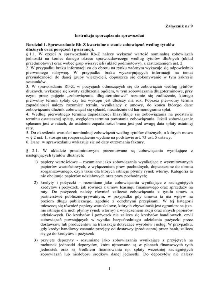 Załącznik nr 9 Instrukcja sporządzania sprawozdań Rozdział 1. Sprawozdanie Rb-Z kwartalne o stanie zobowiązań według tytułów dłużnych oraz poręczeń i gwarancji. § 1.1. W części A sprawozdania Rb-Z należy wykazać wartość nominalną zobowiązań jednostki na koniec danego okresu sprawozdawczego według tytułów dłużnych (układ przedmiotowy) oraz wobec grup wierzycieli (układ podmiotowy), z zastrzeżeniem ust. 2. 2. W przypadku braku informacji co do obrotu na rynku wtórnym wykazuje się odpowiednio pierwotnego nabywcę. W przypadku braku wyczerpujących informacji na temat przynależności do danej grupy wierzycieli, dopuszcza się dokonywanie w tym zakresie szacunków. 3. W sprawozdaniu Rb-Z, w pozycjach odnoszących się do zobowiązań według tytułów dłużnych, wykazuje się kwoty zadłużenia ogółem, w tym zobowiązania długoterminowe, przy czym przez pojęcie „zobowiązania długoterminowe” rozumie się zadłużenie, którego pierwotny termin spłaty czy też wykupu jest dłuższy niż rok. Poprzez pierwotny termin zapadalności należy rozumieć termin, wynikający z umowy, do końca którego dane zobowiązanie dłużnik zobowiązał się spłacić, niezależnie od harmonogramu spłat. 4. Według pierwotnego terminu zapadalności klasyfikuje się zobowiązania na podstawie terminu ostatecznej spłaty, względem terminu powstania zobowiązania. Jeżeli zobowiązanie spłacane jest w ratach, do ustalenia zapadalności brana jest pod uwagę data spłaty ostatniej raty. 5. Do określenia wartości nominalnej zobowiązań według tytułów dłużnych, o których mowa w § 2 ust. 1, stosuje się rozporządzenie wydane na podstawie art. 73 ust. 5 ustawy. 6. Dane w sprawozdaniu wykazuje się od daty otrzymania faktury. § 2.1. W układzie przedmiotowym prezentowane są zobowiązania wynikające z następujących tytułów dłużnych: 1) papiery wartościowe – rozumiane jako zobowiązania wynikające z wyemitowanych papierów wartościowych, z wyłączeniem praw pochodnych, dopuszczone do obrotu zorganizowanego, czyli takie dla których istnieje płynny rynek wtórny. Kategoria ta nie obejmuje papierów udziałowych oraz praw pochodnych; 2) kredyty i pożyczki – rozumiane jako zobowiązania wynikające z zaciągniętych kredytów i pożyczek, jak również z umów leasingu finansowego oraz sprzedaży na raty. Do pożyczek należy również zaliczać zobowiązania z tytułu umów o partnerstwie publiczno-prywatnym, w przypadku gdy umowa ta ma wpływ na poziom długu publicznego, zgodnie z odrębnymi przepisami. W tej kategorii mieszczą się również papiery wartościowe, których zbywalność jest ograniczona (tzn. nie istnieje dla nich płynny rynek wtórny) z wyłączeniem akcji oraz innych papierów udziałowych. Do kredytów i pożyczek nie zalicza się kredytów handlowych, czyli zobowiązań powstających w wyniku bezpośredniego udzielenia pożyczki przez dostawców lub producentów na transakcje dotyczące wyrobów i usług. W przypadku, gdy kredyt handlowy zostanie przejęty od dostawcy (producenta) przez bank, zalicza się go do kredytów i pożyczek. 3) przyjęte depozyty - rozumiane jako zobowiązania wynikające z przyjętych na rachunek jednostki depozytów, które ujmowane są w planach finansowych tych jednostek oraz są środkiem finansowania np. spłaty wcześniej zaciągniętych zobowiązań lub niedoboru środków danej jednostki. Do depozytów nie należy 1 zaliczać depozytów mających charakter swoistego rodzaju gwarancji (np. kaucje mieszkaniowe, depozyty przyjęte przez jednostkę sprawozdającą się w celu zabezpieczenia należytego wykonania umów), gdyż tego typu depozyty nie służą sfinansowaniu deficytu ani długu jednostki i w związku z powyższym nie należy tego typu depozytów wykazywać. Przyjęte depozyty pojawiają się przede wszystkim w sektorze bankowym; 4) wymagalne zobowiązania – rozumiane jako wszystkie bezsporne zobowiązania, których termin płatności dla dłużnika minął, a które nie zostały ani przedawnione ani umorzone. Są to zobowiązania wynikające głównie z dostaw towarów i usług (np. niezapłaconych w terminie faktur), prawomocnych orzeczeń sądu, udzielonych poręczeń i gwarancji. Kategoria ta nie obejmuje zobowiązań wymagalnych z tytułu papierów wartościowych, pożyczek i kredytów oraz przyjętych depozytów, a także odsetek za opóźnienie od wymagalnych zobowiązań. W sytuacji, w której zostanie zawarta ugoda pomiędzy dłużnikiem a wierzycielem i zobowiązanie uprzednio wymagalne zostanie zrestrukturyzowane (tj. wierzyciel wyznaczy nowy harmonogram spłat), zobowiązanie przestaje być wymagalne i nie podlega wykazaniu w wierszu E4. Zobowiązanie staje się wymagalne w rozumieniu niniejszego rozporządzenia licząc od dnia następnego po upływie terminu płatności wskazanego w dokumencie zapłaty lub zapisanego w umowie. 2. W układzie podmiotowym prezentowane są zobowiązania wobec następujących wierzycieli: 1) jednostek należących do sektora finansów publicznych, w tym wobec: a) grupy I, obejmującej organy władzy publicznej, organy administracji rządowej, organy kontroli państwowej i ochrony prawa, sądy i trybunały, państwowe jednostki budżetowe, zakłady budżetowe i gospodarstwa pomocnicze państwowych jednostek budżetowych oraz państwowe fundusze celowe nieposiadające osobowości prawnej, b) grupy II, obejmującej uczelnie publiczne, samodzielne publiczne zakłady opieki zdrowotnej nadzorowane przez ministrów, centralne organy administracji rządowej, wojewodów, państwowe uczelnie medyczne lub państwowe uczelnie prowadzące działalność dydaktyczną i badawczą w dziedzinie nauk medycznych, państwowe instytucje kultury, państwowe instytucje filmowe, Polską Akademię Nauk i tworzone przez nią jednostki organizacyjne oraz państwowe osoby prawne, w tym agencje państwowe i wykonawcze oraz fundusze celowe, utworzone na podstawie od