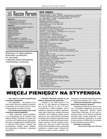 Biuletyn Informacyjny WSZiA 3 SPIS TREŚCI Wydawca: Wyższa Szkoła Zarządzania i Administracji w Zamościu, ul. Akademicka 4, tel. (084) 677 67 16 Redakcja: Małgorzata Bzówka (redaktor naczelny), stali współpracownicy: Katarzyna Kimak, Bogdan Kawałko, Mieczysław Kowerski, Władysław Molas. Druk: Drukarnia Attyla s. j., Zamość, tel. (084) 639 12 13, (084) 627 19 16 W formie elektronicznej gazeta dostępna w formacie PDF na stronie internetowej uczelni www.wszia.edu.pl Skład i projekt okładki - Mateusz Gajos, drukarnia Attyla Rozmowa z dr. Mieczysławem Kowerskim, prorektorem ds. nauczania w Wyższej Szkole Zarządzania i Administracji w Zamościu WIĘCEJ PIENIĘDZY NA STYPENDIA .................................................................................................. 3 SPRAWOZDANIE Z PRAC ZESPOŁU BADAWCZEGO PROJEKTU „SYSTEM PRZECIWDZIAŁANIA POWSTAWANIU BEZROBOCIA NA OBSZARACH SŁABO ZURBANIZOWANYCH” ................................................................... 4 BADANIA I PREZENTACJE .................................................................................................................. 7 PIERWSZE MIEJSCE W KRAJU .......................................................................................................... 8 WSZIA MIĘDZY POLITECHNIKĄ A KUL .............................................................................................. 8 AWANSOWALIŚMY O TRZY MIEJSCA ................................................................................................ 8 TSA W ZAMOŚCIU ............................................................................................................................... 9 NIE JESTEŚ BEZPIECZNY W SIECI ................................................................................................... 9 KONIUNKTURA GOSPODARCZA LUBELSZCZYZNY NA TLE EUROPY ......................................... 10 NAJWIĘKSZY SUKCES STUDENTÓW ............................................................................................. 10 UNESCO – STAN OBECNY I PERSPEKTYWY W POLSCE ............................................................. 11 FIZJOTERAPIA PO TURECKU ........................................................................................................... 14 INFORMATYCY TO NIE DINOZAURY ............................................................................................... 14 NOWE KIERUNKI – NOWE SPECJALNOŚCI ................................................................................... 15 1000 ZŁ DLA PRZYSZŁEGO INŻYNIERA .......................................................................................... 15 PRODZIEKAN O KOMUNIKACJI MIĘDZYKULTUROWEJ ................................................................ 16 NOWY PUNKT KONTAKTOWY W NAŁĘCZOWIE ............................................................................. 16 NOWA OFERTA .................................................................................................................................. 17 SPOTKANIE Z PROFESOR HÜBNER ............................................................................................... 17 WIĘCEJ NIŻ SĄSIEDZTWO ............................................................................................................... 18 DZIEŃ EUROPY W ZAMOŚCIU ......................................................................................................... 19 WSPIERAMY INICJATYWY EUROPEJSKIE ...................................................................................... 19 DZIEDZICTWO KULTUROWE PŁASZCZYZNĄ DIALOGU - EUROPEJSKI ROK DIALOGU MIĘDZYKULTUROWEGO 2008 ..................................................... 20 LUBIMY UNIĘ ..................................................................................................................................... 21 EUROPE DIRECT W 2007 ................................................................................................................. 22 PRZEDSTAWICIEL WSZIA W POLSKIEJ AKADEMII NAUK ............................................................. 23 DR GERYCZ W WILANOWIE ............................................................................................................. 23 OWIECZKA DOLLY MISTRZYNIĄ KARATE ....................................................................................... 23 SESJA STUDENCKA TUŻ-TUŻ .......................................................................................................... 24 ZAWODY MEDYCZNE – ZAWODAMI PRZYSZŁOŚCI ...................................................................... 24 NASZ DZIEKAN W RZĄDOWEJ RADZIE .......................................................................................... 24 FINAŁ PROJEKTU EQUAL ................................................................................................................. 25 MISJA W STUTTGARCIE ................................................................................................................... 25 7 KILOMETRÓW OD JEROZOLIMY .................................................................................................. 26 KRZYSZTOF ZANUSSI ...................................................................................................................... 27 STUDENCI O KOMUNIKACJI ................................................................................................... 28 NOWY KONTRAKT NA 2008 .............................................................................................................. 28 PO FINIE BELG .................................................................................................................................. 29 FRATRES PONIFICES ....................................................................................................................... 29 MŁODZI NADZIEJĄ PODZIELONEGO ŚWIATA ................................................................................ 30 SPOTKANIE Z BOGI