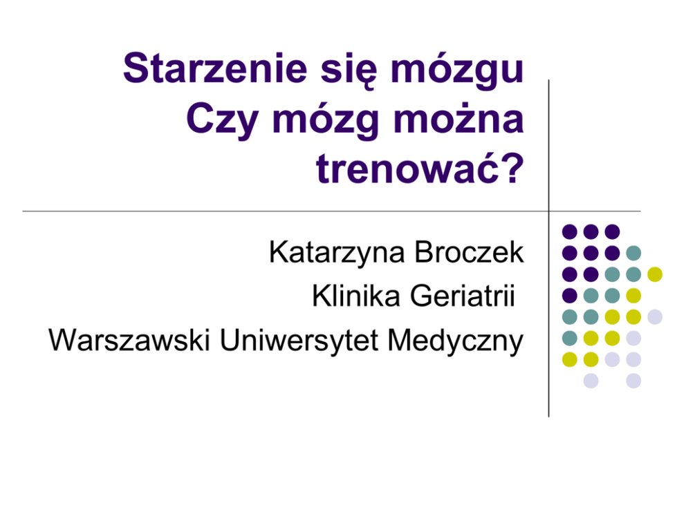 Starzenie się mózgu Czy mózg można trenować? Katarzyna Broczek Klinika Geriatrii Warszawski Uniwersytet Medyczny Plan wykładu Jak mózg się starzeje? Jak odczuwamy starzenie się mózgu? Czy można poprawić funkcjonowanie mózgu w starszym wieku? Jak mózg się starzeje? Plastyczność mózgu Mózg Starzenie się fizjologiczne Choroba mózgu Udar Ch. Alzheimera Otępienie Inne choroby mające wpływ na mózg Starzenie się mózgu Utrata ok. 10% neuronów (ze 100 mld neuronów) Zmniejszenie liczby połączeń synaptycznych Zmiany w systemach neuroprzekaźników Zwolnienie szybkości przekazywania sygnałów Starzenie się nerek http://www.alz.org/brain_polish/01.asp Mózg stanowi tylko 2% masy ciała Ale kontroluje wszystkie funkcje fizjologiczne w organizmie Starzenie się mózgu Starzenie się a procesy poznawcze Pogorszenie pamięci operacyjnej Zmniejszenie szybkości przetwarzania informacji Zmniejszenie zjawiska torowania / hamowania w mózgu: Rozwlekłość Dygresyjność Drobiazgowość Wpływ osobowości, temperamentu Subiektywne pogorszenie funkcjonowania umysłowego NIEWIELKIE ZABURZENIA PAMIĘCI: Lepiej pamiętamy to, co dawniej, niż to co teraz Trudności w uczeniu się nowych informacji Trudności z wydobywaniem informacji z pamięci Subiektywne pogorszenie funkcjonowania umysłowego OBJAWY NIEDOTYCZĄCE PAMIĘCI Zwolnienie tempa myślenia Zaburzenia uwagi Trudności z jednoczesnym wykonywaniem dwóch czynności Sztywność procesów poznawczych Fizjologiczne starzenie się mózgu sprzyja zwiększeniu wrażliwości na różne niekorzystne bodźce: Zaburzenia świadomości podczas chorób somatycznych Częste działania niepożądane leków dotyczące mózgu Zaburzenia snu: nadmierna senność i bezsenność Jak odróżnić zdrowe starzenie się od starzenia patologicznego? To nie jest łatwe zadanie: U wielu osób łagodne pogorszenie pamięci nie ma charakteru postępującego Pierwsze objawy kliniczne chorób neurodegeneracyjnych pojawiają się późno w przebiegu tych chorób Możliwości poprawy funkcjonowania mózgu w przebiegu starzenia się Usprawnianie przetwarzania informacji w czasie Szybsze przetwarzanie informacji może prowadzić do poprawy innych funkcji poznawczych Strategie poprawy funkcji poznawczych Strategie radzenia sobie z niewielkimi zaburzeniami pamięci (np. lista zadań) Zapamiętywanie obrazowe Metoda skojarzeń Regularny trening Czy krzyżówki są dobre dla każdego? Lepiej robić cokolwiek niż nic dla swojej pamięci Z DRUGIEJ STRONY Dobrany indywidualnie trening przynosi lepsze efekty Ile ptaków Pani / Pan widzi na zdjęciu? A. B. C. D. 1 – 4 ptaki 5 – 9 ptaków 10 – 14 ptaków Więcej niż 15 ptaków Proponowane zasady „trenowania” mózgu Codzienna aktywizacja umysłowa Podejmowania nowych zadań i uczenie się trudnych zagadnień Trenowanie uwagi, czujności Streszczanie: opowiedz krócej to, co zostało już powiedziane Zadania muzyczne, rytm, taniec Aktywność fizyczna a mózg Aktywność fizyczna ma pozytywny wpływ na funkcjonowanie umysłowe Lepiej ćwiczyć przez całe życie, ale można zacząć w każdym wieku Jak wysiłek fizyczny działa na mózg Poprawa przepływu krwi i utlenowania Tworzenie nowych naczyń – angiogeneza Mechanizmy plastyczności mózgu Rola neurotransmiterów i neurotrofin Zaproszenie XIX FESTIWAL NAUKI Pracownia Neuropsychologii Instytutu Biologii Doświadczalnej PAN zaprasza na wykład Prof. Elżbiety Szeląg pt.: Usprawnianie umysłu człowieka (dr Neuronowski) Termin: 22.09.2015 r. (wtorek), godz. 18:00 Miejsce: Instytut Biologii Doświadczalnej PAN, ul. Pasteura 3 Warsztaty: dr Neuronowski 23.09.2015 (środa), godz. 17:30