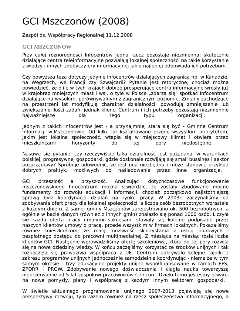 GCI Mszczonów (2008) Zespół ds. Współpracy Regionalnej 11.12.2008 GCI MSZCZONÓW Przy całej różnorodności Infocentrów jedna rzecz pozostaje niezmienna: skutecznie działające centra teleinformacyjne pozwalają lokalnej społeczności na takie korzystanie z wiedzy i innych zdobyczy ery informacyjnej jakie najlepiej odpowiada ich potrzebom. Czy powyższa teza dotyczy jedynie infocentrów działających zagranicą np. w Kanadzie, na Węgrzech, we Francji czy Szwajcarii? Pytanie jest retoryczne, chociaż można powiedzieć, że o ile w tych krajach dobrze prosperujące centra informacyjne wrosły już w krajobraz mniejszych miast i wsi, o tyle w Polsce „zdarza się" spotkać Infocentrum działające na wysokim, porównywalnym z zagranicznym poziomie. Zmiany zachodzące na przestrzeni lat modyfikują charakter działalności, powodują zmniejszenie lub zwiększenie ilości zadań, jednak klienci Centrum i ich potrzeby pozostają niezmiennie najważniejsze dla tego typu organizacji. Jednym z takich Infocentrów jest - a przynajmniej stara się być - Gminne Centrum Informacji w Mszczonowie. Od kilku lat kształtowane przede wszystkim priorytetem, jakim jest lokalna społeczność, wtapia się w miejscowy klimat i otwiera przed mieszkańcami horyzonty do tej pory niedostępne. Nasuwa się pytanie, czy rzeczywiście taka działalność jest pożądana, w warunkach polskiej, progresywnej gospodarki, gdzie doskonale rozwijają się small bussines i sektor pozarządowy? Spróbuję udowodnić, że jest ona niezbędna i może stanowić przykład dobrych praktyk, możliwych do naśladowania przez inne organizacje. GCI przeszłość a przyszłość. Analizując dotychczasowe funkcjonowanie mszczonowskiego Infocentrum można stwierdzić, że zostały zbudowane mocne fundamenty do rozwoju edukacji i informacji, chociaż początkowo najistotniejszą sprawą była koordynacja działań na rynku pracy. W 2003r. zaczynaliśmy od zdobywania ofert pracy dla lokalnej społeczności, a liczba osób bezrobotnych wzrastała z każdym dniem. Z samej gminy Mszczonów zarejestrowano ok. 500 bezrobotnych, a ogólnie w bazie danych (również z innych gmin) znalazło się ponad 1000 osób. Liczyła się każda oferta pracy i małymi sukcesami stawały się kolejne podpisane przez naszych klientów umowy o pracę, przede wszystkim w firmach lokalnych. Pokazaliśmy również mieszkańcom, że mają możliwość skorzystania z usług biurowych i bezpłatnego dostępu do pracowni multimedialnej. Z miesiąca na miesiąc rosła liczba klientów GCI. Następnie wprowadziliśmy ofertę szkoleniową, która do tej pory rozwija się na nowe dziedziny wiedzy. W końcu zaczęliśmy korzystać ze środków unijnych i tak rozpoczęła się prawdziwa współpraca z UE. Centrum odkrywało kolejne tajniki z zakresu programów unijnych jednocześnie samodzielnie koordynując - niemalże w tym samym okresie - trzy edukacyjne projekty unijne współfinansowane w ramach EFS, ZPORR i PROW. Zdobywanie nowego doświadczenia i ciągła nauka towarzyszą nieprzerwalnie od 5 lat zespołowi pracowników Centrum. Dzięki temu jesteśmy otwarci na nowe pomysły, plany i współpracę z każdym innym sektorem gospodarki. W świetle aktualnego programowania unijnego 2007-2013 pojawiają się nowe perspektywy rozwoju, tym razem również na rzecz społeczeństwa informacyjnego, a GCI ma zamiar zamienić je na korzyści płynące dla lokalnego środowiska. Kierunek został zatem obrany, społeczeństwo informacyjne (SI), jakkolwiek rozumiane przez poszczególne grupy społeczne jest wg UKIE nowym typem społeczeństwa, który ukształtował się w krajach, gdzie następuje szybkie tempo rozwoju nowoczesnych technologii teleinformatycznych. Warunki, które muszą być spełnione, aby kreować SI, są absolutnie zbieżne z warunkami tworzonymi w Gminnym Centrum Informacji. Internet (jako środek komunikacji i informacji publicznej), powszechny dostęp do informacji i edukacja to działania, które na co dzień realizuje Centrum. Dzięki temu warunki do rozwoju informacyjnego już są, a Infocentrum stało się swoistą siłą napędową dla tej inicjatywy. Teraz należy starać się o realny, fizyczny rozwój technik i technologii informacyjnych na terenie gminy Mszczonów, zaczynając od założenia szerokopasmowego Internetu na terenach gdzie go brakuje poprzez zbudowanie profesjonalnych platform informacyjnych i edukacyjnych aż po zmodernizowanie pod względem sprzętowym, ogólnodostępnych pracowni multimedialnych koordynowanych przez GCI w Mszczonowie i filię w Osuchowie. To plany na niedaleką przyszłość, które będą mogły być z powodzeniem realizowane przez Centrum a współfinansowane poprzez działania w ramach RPO WM. Atutem mszczonowskiego Infocentrum jest również realizacja celów związanych z rozwojem edukacjina terenie gminy. Proponowane przez GCI szkolenia, warsztaty, seminaria wskazują drogę do samokształcenia mieszkańców i są realną szansą na znalezienie zatrudnienia, lepszą pracę, awans zawodowy czy po prostu podniesienie samooceny. Do chwili obecnej działaniami edukacyjnymi w różnej formie i z różnych dziedzin zostało objętych ok. 1800 osób, w tym dzieci, młodzież i osoby dorosłe. Poprzez edukację GCI wypełnia swoją misję jako jednostka szkoleniowa i centrum kształcenia ustawicznego. Obecnie działalność szkoleniowa i informacyjno-promocyjna stanowią główny filar zadaniowy Centrum. Inicjatywy podejmowane na rzecz koordynacji działań pomiędzy pracodawcami a potencjalnymi pracownikami zeszły na boczny tor, ze względu na diametralną zmianę sytuacji na rynku pracy (aktualnie stopa bezrobocia w gminie Mszczonów wynosi ok. 4-5%). Dzięki ofercie kształcenia ustawicznego, znaczna ilość lokalnej społeczności jest zainteresowana podnoszeniem swoich umiejętności i kwalifikacji, a w szczególności (wg badań ankietowych przeprowadzonych przez GCI) szkoleniami z zakresu techn