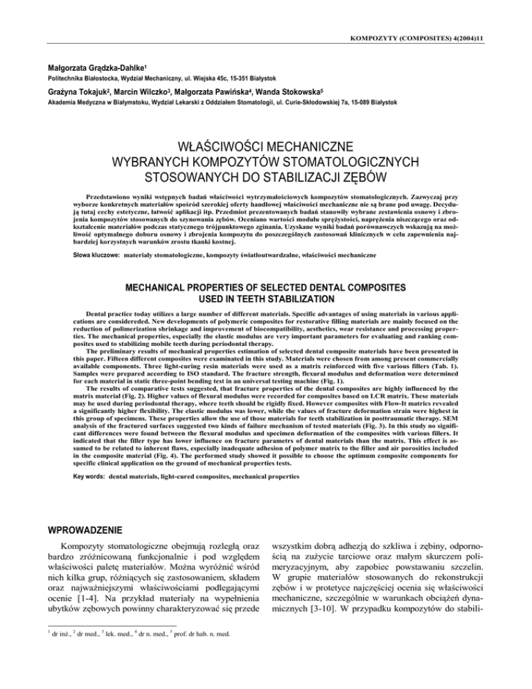 KOMPOZYTY (COMPOSITES) 4(2004)11 Małgorzata Grądzka-Dahlke1 Politechnika Białostocka, Wydział Mechaniczny, ul. Wiejska 45c, 15-351 Białystok Grażyna Tokajuk2, Marcin Wilczko3, Małgorzata Pawińska4, Wanda Stokowska5 Akademia Medyczna w Białymstoku, Wydział Lekarski z Oddziałem Stomatologii, ul. Curie-Skłodowskiej 7a, 15-089 Białystok WŁAŚCIWOŚCI MECHANICZNE WYBRANYCH KOMPOZYTÓW STOMATOLOGICZNYCH STOSOWANYCH DO STABILIZACJI ZĘBÓW Przedstawiono wyniki wstępnych badań właściwości wytrzymałościowych kompozytów stomatologicznych. Zazwyczaj przy wyborze konkretnych materiałów spośród szerokiej oferty handlowej właściwości mechaniczne nie są brane pod uwagę. Decydują tutaj cechy estetyczne, łatwość aplikacji itp. Przedmiot prezentowanych badań stanowiły wybrane zestawienia osnowy i zbrojenia kompozytów stosowanych do szynowania zębów. Oceniano wartości modułu sprężystości, naprężenia niszczącego oraz odkształcenie materiałów podczas statycznego trójpunktowego zginania. Uzyskane wyniki badań porównawczych wskazują na możliwość optymalnego doboru osnowy i zbrojenia kompozytu do poszczególnych zastosowań klinicznych w celu zapewnienia najbardziej korzystnych warunków zrostu tkanki kostnej. Słowa kluczowe: materiały stomatologiczne, kompozyty światłoutwardzalne, właściwości mechaniczne MECHANICAL PROPERTIES OF SELECTED DENTAL COMPOSITES USED IN TEETH STABILIZATION Dental practice today utilizes a large number of different materials. Specific advantages of using materials in various applications are considereded. New developments of polymeric composites for restorative filling materials are mainly focused on the reduction of polimerization shrinkage and improvement of biocompatibility, aesthetics, wear resistance and processing properties. The mechanical properties, especially the elastic modulus are very important parameters for evaluating and ranking composites used to stabilizing mobile teeth during periodontal therapy. The preliminary results of mechanical properties estimation of selected dental composite materials have been presented in this paper. Fifteen different composites were examinated in this study. Materials were chosen from among present commercially available components. Three light-curing resin materials were used as a matrix reinforced with five various fillers (Tab. 1). Samples were prepared according to ISO standard. The fracture strength, flexural modulus and deformation were determined for each material in static three-point bending test in an universal testing machine (Fig. 1). The results of comparative tests suggested, that fracture properties of the dental composites are highly influenced by the matrix material (Fig. 2). Higher values of flexural modulus were recorded for composites based on LCR matrix. These materials may be used during periodontal therapy, where teeth should be rigidly fixed. However composites with Flow-It matrics revealed a significantly higher flexibility. The elastic modulus was lower, while the values of fracture deformation strain were highest in this group of specimens. These properties allow the use of those materials for teeth stabilization in posttraumatic therapy. SEM analysis of the fractured surfaces suggested two kinds of failure mechanism of tested materials (Fig. 3). In this study no significant differences were found between the flexural modulus and specimen deformation of the composites with various fillers. It indicated that the filler type has lower influence on fracture parametrs of dental materials than the matrix. This effect is assumed to be related to inherent flaws, especially inadequate adhesion of polymer matrix to the filler and air porosities included in the composite material (Fig. 4). The performed study showed it possible to choose the optimum composite components for specific clinical application on the ground of mechanical properties tests. Key words: dental materials, light-cured composites, mechanical properties WPROWADZENIE Kompozyty stomatologiczne obejmują rozległą oraz bardzo zróżnicowaną funkcjonalnie i pod względem właściwości paletę materiałów. Można wyróżnić wśród nich kilka grup, różniących się zastosowaniem, składem oraz najważniejszymi właściwościami podlegającymi ocenie [1-4]. Na przykład materiały na wypełnienia ubytków zębowych powinny charakteryzować się przede 1 dr inż., 2 dr med., 3 lek. med., 4 dr n. med., 5 prof. dr hab. n. med. wszystkim dobrą adhezją do szkliwa i zębiny, odpornością na zużycie tarciowe oraz małym skurczem polimeryzacyjnym, aby zapobiec powstawaniu szczelin. W grupie materiałów stosowanych do rekonstrukcji zębów i w protetyce najczęściej ocenia się właściwości mechaniczne, szczególnie w warunkach obciążeń dynamicznych [3-10]. W przypadku kompozytów do stabili- 327 Właściwości mechaniczne wybranych kompozytów stomatologicznych stosowanych do stabilizacji zębów MATERIAŁY I METODYKA BADAŃ Do badań wybrano 15 kompozytów na bazie materiałów stosowanych najczęściej w praktyce klinicznej. Badano trzy rodzaje osnowy - światłoutwardzalny kompozyt LCR, kompomer Dyract-AP, kompozyt Flow-It oraz pięć rodzajów zbrojenia, w tym włóknami szklanymi w postaci różnych splotów, włóknami organicznymi i metalowymi (tab. 1). Próbki do badań wytrzymałościowych w kształcie belek o wymiarach 2x4x25 mm przygotowano zgodnie z zaleceniami producentów materiałów, analogicznie do warunków aplikacji klinicznej. Badania wytrzymałościowe przeprowadzono na maszynie Instron TM-SM podczas statycznego 3-punktowego zginania wg normy ISO-4049 [11]. Rejestrowano przebieg zmian siły i odkształcenia. Przykładowy wykres dla trzech wybranych materiałów pokazano na rysunku 1. Przy ocenie naprężenia niszczącego i maksymalnego odkształcenia brano pod uwagę wartość siły, przy któ- rej następowało pękanie osnowy kompozytu, widoczne w postaci załam