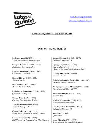 www.lutosairquintet.com [email protected] LutosAir Quintet - REPERTUAR kwintet – fl, ob, cl, fg, cr Malcolm Arnold (*1921): Three Shanties for Wind Quintet August Klughardt (1847 - 1902): Quintett C-Dur, op. 79 Grażyna Bacewicz (1909 – 1969) Kwintet na instrument dęte György Ligeti (1923 - 2006): 6 Bagatelles (1953) 10 pieces for woodwind quintet (1968) Leonard Bernstein (1918 - 1990): Ouverture „Candide” Samuel Barber (1910-1981): Summer music Bela Bartok (1881 – 1945) Rumuńskie tańce ludowe Ludwig van Beethoven (1770 – 1827): Quintet Es-dur op 103 George Bizet (1838 - 1875): Carmen Fantasie (arr. Walter) Theodor Blumer (1881-1964): Kwintet dęty op. 52 Claude Debussy (1862-1918): Petite Suite Reverie Children's Corner Ferenc Farkas (1905 - 2000): Old Hungarian Dances of the 17th Century Mikołaj Majkusiak (*1982): Concerto in air Felix Mendelssohn Bartholdy(1809-1847): Sen nocy letniej - uwertura Wolfgang Amadeus Mozart (1756 - 1791): Divertimento B-Dur, KV 270 Alexander Moyzes (1906 – 1984) Kwintet dęty Modest Mussorgsky (1839-1881): Pictures at the exhibition Carl August Nielsen (1865 - 1931): Quintett A-Dur, op. 43 Arvo Pärt (*1935): Quintettion Astor Piazolla (1921 - 1992): Arrangements for woodwind quintet Jean Francaix (1912 - 1997): Woodwind quintet Nr. 1 and Nr. 2 Paul Pierne (1874-1952): Suite Pittoresque George Gershwin (1898 - 1937): Three Preludes Sergei Prokofiev (1891-1953): “Romeo i Julia”, Suite Joseph Haydn (1732 - 1809): Divertimento Nr.1 B-Dur "St.Antoni" Maurice Ravel (1875 - 1937): Le Tombeau de Couperin Paul Hindemith (1895 - 1963): Kleine Kammermusik für fünf Bläser, op. 24 Nr. 2 Anton Reicha (1770 - 1836): all woodwind quintets Andrey Rubtsov (*1982): Three moods for woodwind quintet Gustav Holst (1874 - 1934): Woodwind quintet, op. 14 Fazil Say (*1970): Alevi dedeler rakı masasında Jacques Ibert (1890 - 1962): Trois Pièces brèves André Jolivet (1905 - 1974): Serenade for Woodwindquintet Tadeusz Szeligowski (1896-1963): Woodwind quintet Paul Taffanel (1844 - 1908): Quintett g-Moll Scott Joplin (1868 - 1917): Ragtimes Wojciech Kilar (1932-2013): Woodwind quintet Kerry Turner (*1960) Berceuse for Mary Rose trio – ob, cl, fg Witold Lutosławski (1913 – 1993) Trio na obój, klarnet i fagot Alexander Tansman (1897 – 1986) Trio stroikowe Erwin Schulhoff (1894 – 1942) Divertissement kwartet – fl, ob, cl, fg Tadeusz Baird (1928 – 1991) Divertimento Eugene Bozza (1905 – 1991) Trois pieces pour une musique de nuit Frank Bridge (1879 – 1941) Divertimenti Jean Francaix (1912 – 1997) Quatuor a vents instrumenty dęte i fortepian Ludwig van Beethoven (1770 – 1827) Kwintet op. 16 Francis Poulenc (1899 – 1963) Sextuor Ludwig Thuille (1861-1907) Sextet op. 6
