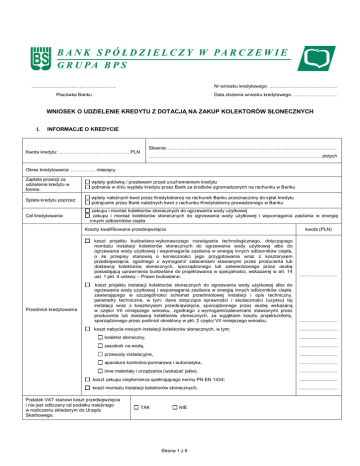 …………………………………………….. Nr wniosku kredytowego: …………………………………… Placówka Banku Data złożenia wniosku kredytowego: ……………………… WNIOSEK O UDZIELENIE KREDYTU Z DOTACJĄ NA ZAKUP KOLEKTORÓW SŁONECZNYCH I. INFORMACJE O KREDYCIE Słownie: ……………………………..…………………….……………………………………… Kwota kredytu: …………….………………………. PLN ………………….………………………………..…………………………………………złotych Okres kredytowania: …………… miesięcy Zapłata prowizji za udzielenie kredytu w formie: wpłaty gotówką / przelewem przed uruchomieniem kredytu pobrania w dniu wypłaty kredytu przez Bank ze środków zgromadzonych na rachunku w Banku Spłata kredytu poprzez: wpłaty należnych kwot przez Kredytobiorcę na rachunek Banku przeznaczony do spłat kredytu potrącanie przez Bank należnych kwot z rachunku Kredytobiorcy prowadzonego w Banku Cel kredytowania zakupu i montaż kolektorów słonecznych do ogrzewania wody użytkowej zakupu i montaż kolektorów słonecznych do ogrzewania wody użytkowej i wspomagania zasilania w energię innych odbiorników ciepła Koszty kwalifikowane przedsięwzięcia Przedmiot kredytowania kwota (PLN) koszt projektu budowlano-wykonawczego rozwiązania technologicznego, dotyczącego montażu instalacji kolektorów słonecznych do ogrzewania wody użytkowej albo do ogrzewania wody użytkowej i wspomagania zasilania w energię innych odbiorników ciepła, o ile przepisy stanowią o konieczności jego przygotowania wraz z kosztorysem przedsięwzięcia, zgodnego z wymogami/ zaleceniami stawianymi przez producenta lub dostawcę kolektorów słonecznych, sporządzonego lub zatwierdzonego przez osobę posiadającą uprawnienia budowlane do projektowania w specjalności, wskazanej w art. 14 ust. 1 pkt. 4 ustawy – Prawo budowlane; ............................. koszt projektu instalacji kolektorów słonecznych do ogrzewania wody użytkowej albo do ogrzewania wody użytkowej i wspomagania zasilania w energię innych odbiorników ciepła, zawierającego w szczególności schemat przedmiotowej instalacji i opis techniczny, parametry techniczne, w tym: dane dotyczące sprawności i skuteczności (uzysku) tej instalacji wraz z kosztorysem przedsięwzięcia, sporządzonego przez osobę wskazaną w części VII niniejszego wniosku, zgodnego z wymogami/zaleceniami stawianymi przez producenta lub dostawcę kolektorów słonecznych, za wyjątkiem kosztu projektu/oferty, sporządzonego przez podmiot określony w pkt. 2 części VII niniejszego wniosku; ............................. koszt nabycia nowych instalacji kolektorów słonecznych, w tym: ............................. kolektor słoneczny, ............................. zasobnik na wodę, ............................. przewody instalacyjne, ............................. aparatura kontrolno-pomiarowa i automatyka, ............................. inne materiały i urządzenia (wskazać jakie). ............................ koszt zakupu ciepłomierza spełniającego normy PN EN 1434; ............................. koszt montażu instalacji kolektorów słonecznych; ............................. Podatek VAT stanowi koszt przedsięwzięcia i nie jest odliczany od podatku należnego w rozliczeniu składanym do Urzędu Skarbowego. TAK NIE Strona 1 z 6 Koszt przedsięwzięcia: Słownie: ……………………………..…………………….……………………………………… …………….………………………. PLN ………………….………………………………..……………………………………………złotych Adres przedsięwzięcia Typ nieruchomości: ………………….………………………………..……………………………………………………………….…………………… budynek mieszkalny budynek mieszkalny w budowie Deklarowany udział własny w finansowaniu przedsięwzięcia: ....................................................................................................……………… PLN słownie: ………………………………………………………………………………………………………………………………………………………złotych w formie: ……………………………………………………………………………………………………………………………………………………………… Tytuł prawny do nieruchomości Przewidywane terminy wykorzystania kredytu i wysokość poszczególnych transz: Własność / odrębna własność Dzierżawa Spółdzielcze własnościowe prawo do lokalu Inny: .................................................................................................. termin kwota kwota słownie 1) ................................................ .................................................... 2) ................................................ .................................................... 3) ................................................ .................................................... 4) ................................................ .................................................... 5) ................................................ .................................................... ......................................................................... ......................................................................... ......................................................................... ......................................................................... ......................................................................... ......................................................................... ......................................................................... ................................