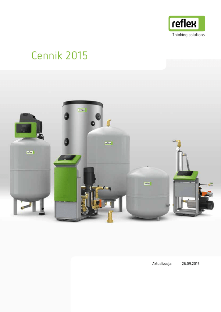 Cennik 2015 Aktualizacja: 26.09.2015 Zadowolenie klienta - Reflex to firma nowoczesnych rozwiązań w dziedzinie instalacji grzewczych, chłodniczych i solarnych oferująca szeroki asortyment innowacyjnych produktów oraz kompleksową opiekę serwisową. Decydując się na nasze usługi, otrzymują Państwo nasze wsparcie na każdym z poszczególnych etapów – począwszy od projektowania, przez wykonanie danej instalacji, aż po kontrolę i nadzór jej funkcjonowania. Działamy w myśl zasady „Thinking solutions”. Naszą siłę stanowią przemyślane rozwiązania. Dzięki wieloletniemu doświadczeniu, doskonałej wiedzy technicznej oraz praktyce tworzymy innowacyjne rozwiązania – odpowiednie dla Państwa. 2 naszą satysfakcją. Dbamy o to, aby dopasować wszystkie elementy Ogrzewanie, chłodzenie, dostarczanie ciepłej wody – zadania instalacji dostarczających wodę są różnorodne i złożone. Z tego względu Reflex oferuje Państwu różnorodne produkty przeznaczone do odpowiedniego zadania. Nasze wyroby można ze sobą odpowiednio łączyć tworząc tym samym gotowe rozwiązania lub uzupełniać instalacje naszymi urządzeniami. Cel jest ten sam: stworzyć dla Państwa odpowiednie rozwiązanie, które zapewni ekonomiczną i jeszcze bardziej wydajną pracę instalacji. Spis treści Ciśnieniowe naczynia przeponowe do instalacji grzewczych, chłodniczych i solarnych Reflex N Reflex C Reflex G Reflex S Zbiorniki schładzające Osprzęt 6 7 8 9 10 11-12 Ciśnieniowe naczynia przeponowe do wody użytkowej, instalacji podwyższających ciśnienie i podgrzewających wodę Refix Refix Refix Refix Refix DD DT DE DC HW 13 14-15 16-18 18 19 Układy stabilizacji ciśnienia sterowane kompresorowo Reflexomat (z osprzętem) 20-25 sterowane pompowo Variomat (z osprzętem) 26-29 Variomat Giga (z osprzętem)30-33 Układy uzupełniania wody Fillset Fillcontrol Fillsoft 34 35-36 37 Układy odgazowywania wody oraz separatory mikropęcherzy powietrza i osadów Servitec Exvoid Exdirt Extwin Osprzęt, zbiorniki odmulające Separator powietrza Zbiorniki rozprężające W poniższym cenniku zebraliśmy dla Państwa wszystkie nasze produkty, informacje dotyczące ich grupy produktowej oraz dane techniczne. Należy zwrócić uwagę, że podane ceny są cenami jednostkowymi i nie zawierają podatku VAT. Zawarte w cenniku ceny są cenami netto. Firma Reflex-POLSKA Sp. z o.o. zastrzega sobie prawo do błędów i dokonywania zmian. Obowiązują ogólne warunki handlowe z dnia 01.01.2013. 38-39 40-41 42-44 45-47 48 49 49 Zasobniki buforowe & podgrzewacze wody Zasobniki buforowe Storatherm Aqua Storatherm Aqua Load Storatherm Aqua Solar Storatherm Aqua Heat Pump Storatherm Aqua Combi Akcesoria do podgrzewaczy 50-52 54 55 56 57 58 60-61 Warunki zakupu Warunki zakupu Kontakt 62 63 3 Oferta Reflex Zmiana nazw produktów Zmiana nazw urządzeń i akcesoriów marki Reflex Ciśnieniowe naczynia przeponowe ‚reflex EN‘ ‚refix DT5‘ ‚refix DE Junior‘ → Reflex C → Refix DT → Refix DC Układy stabilizacji ciśnienia ‚minimat‘ ‚gigamat‘ → Reflexomat Compact → Variomat Giga Układy uzupełniania wody ‚fillcontrol‘ ‚magcontrol‘ ‚control P‘ ‚control P/gl‘ → → → → Fillcontrol Plus Compact Fillcontrol Plus Fillcontrol Auto Compact Fillcontrol Auto Układy odgazowywania wody oraz separatory mikropęcherzy powietrza i osadów ‚extop‘ ‚exair‘ → Exvoid T → Exvoid Zasobniki buforowe i podgrzewacze wody 4 Zasobniki buforowe → STORATHERM HEAT ‚PH‘ ‚PFH‘ ‚PHF‘ ‚PFHF‘ ‚PHW‘ ‚PFHW‘ ‚PWF‘ płaszcz foliowy → → → → → → → → Podgrzewacze wody → STORATHERM AQUA ‚SB‘ lub ‚SF‘ ‚SF/2‘ ‚LS‘ ‚WPS‘ ‚VKS‘ ‚VKW‘ izolacja cieplna → → → → → → H HF H.../R HF.../R H.../1 HF.../1 HWF nowość: (bez izolacji) (z izolacją) (bez izolacji, z otworem rewizyjnym) (z izolacją, z otworem rewizyjnym) (bez izolacji, z wężownicą) (z izolacją, z wężownicą) H.../2 oraz HF.../2 (zasobnik z 2 wężownicami) AB.../1 lub AF...1 AF.../2 AL AH.../1 AC ACW (Storatherm Aqua) (Storatherm Aqua Solar) (Storatherm Aqua Load) (Storatherm Aqua Heat Pump) (Storatherm Aqua Combi) Oferta Reflex Zestawienie Ciśnieniowe naczynia przeponowe do instalacji grzewczych, chłodnicznych i solarnych do wody użytkowej, instalacji podwyższających ciśnienie i podgrzewających wodę Reflex C Refix DD 10 bar 3 bar DD 2-25 C 8–80 membrana workowa niewymienna DD 33 25 bar * * DD 8/25 bar membrana workowa niewymienna Refix DT Reflex N i NG 10 bar 6 bar NG 8 – 25 N / NG 35 – 250 N 300 – 1000 półmembrana niewymienna Reflex G 16 bar DT 60-500 DT 600-1000 25 bar DT 1000-2000 DT 3000 membrana workowa wymienna Refix DE 10 bar 6 bar G 1000 – 5000 16 bar membrana workowa wymienna 25 bar G 100 – 500 10 bar G 600 – 1000 Reflex S DE 2-25 DE 50-500 DE 600-1000 DE 1000-2000 DE 33 niewymienna DE 3000-5000 membrana workowa wymienna Refix DC 10 bar S 20– 33 10 bar S 50– 250 S 300– 600 membrana workowa / półmembrana niewymienna DC 25 DC 50-400 DC 500-600 półmembrana niewymienna 5 Ciśnieniowe naczynia przeponowe Reflex Reflex N i NG • do instalacji grzewczych i systemów chłodniczych • przyłącza gwintowane • stojące od 35 l • membrana niewymienna, zgodna z normą PN-EN 13831, dop. temp. pracy 70 ºC • dopuszczenie zgodne z dyrektywą dot. urządzeń ciśnieniowych 97/23/WE 6 bar Typ 6 bar /120 °C NG 8 NG 12 NG 18 NG 25 NG 35 NG 50 NG 80 NG 100 NG 140 N 200 N 250 N 300 N 400 N 500 N 600 N 800 N 1000 Indeks szare białe Cena PLN VPE* 8230113 8240113 8250113 8260113 8270113 8001013 8001213 8001413 8001613 8213313 8214313 8215300 8218000 8218300 8218400 8218500 8218600 102 113 124 147 201 276 403 637 762 921 1 215 1 500 1 905 2 532 3 374 4 416 5 645 96 72 56 42 24 24 12 10 8 4 4 – – – – – – 7230107 7240107 7250107 7260107 7270107 7001100 7001300 7001500 7001700 – – – – – – – – pojemnoś