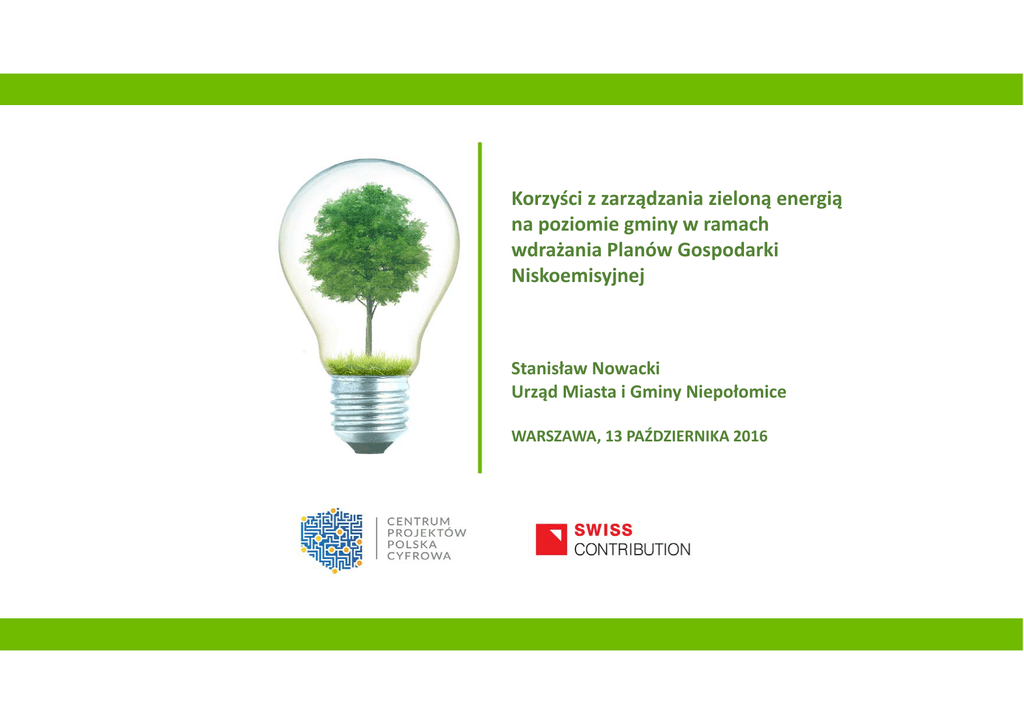 Korzyści z zarządzania zieloną energią na poziomie gminy w ramach wdrażania Planów Gospodarki Niskoemisyjnej Stanisław Nowacki Urząd Miasta i Gminy Niepołomice WARSZAWA, 13 PAŹDZIERNIKA 2016 MIASTO I GMINA NIEPOŁOMICE Gmina Niepołomice leży w województwie małopolskim, w powiecie wielickim. Jej powierzchnia wynosi nieco ponad 97 km kw. Gminę zamieszkuje ponad 25 tysięcy osób. Jesteśmy jedną z gmin w województwie, które cechuje dodatnie saldo przyrostu. Co roku przybywa nam około półtysiąca osób. Konferencja współfinansowana przez Szwajcarię w ramach szwajcarskiego programu współpracy z nowymi krajami członkowskimi Unii Europejskiej MIASTO I GMINA NIEPOŁOMICE Konferencja współfinansowana przez Szwajcarię w ramach szwajcarskiego programu współpracy z nowymi krajami członkowskimi Unii Europejskiej MIASTO I GMINA NIEPOŁOMICE Konferencja współfinansowana przez Szwajcarię w ramach szwajcarskiego programu współpracy z nowymi krajami członkowskimi Unii Europejskiej Gmina Niepołomice przystąpiła do Porozumienia Burmistrzów 9 lutego 2009. Uchwała Rady Miejskiej w Niepołomicach Z dnia 29 marca 2011r. MIASTO I GMINA NIEPOŁOMICE Konferencja współfinansowana przez Szwajcarię w ramach szwajcarskiego programu współpracy z nowymi krajami członkowskimi Unii Europejskiej MIASTO I GMINA NIEPOŁOMICE Inwentaryzacja emisji gazów cieplarnianych Wytyczne do sporządzenia inwentaryzacji Jako rok bazowy przyjęto 2008 Wielkość emisji określona wyłącznie w oparciu o wielkość zużycia energii finalnej na terenie gminy (mniejszy szacunkowy błąd) Konferencja współfinansowana przez Szwajcarię w ramach szwajcarskiego programu współpracy z nowymi krajami członkowskimi Unii Europejskiej MIASTO I GMINA NIEPOŁOMICE Stan sektora energetycznego w gminie W skład mienia komunalnego wchodzi 55 obiektów Budynki administracyjne Urzędu Placówki oświatowe Domy kultury Placówki służby zdrowia Placówki OSP Inne obiekty: Zamek Królewski, Kryta pływalnia, Izba Regionalna Konferencja współfinansowana przez Szwajcarię w ramach szwajcarskiego programu współpracy z nowymi krajami członkowskimi Unii Europejskiej MIASTO I GMINA NIEPOŁOMICE Bilans emisji CO2 Konferencja współfinansowana przez Szwajcarię w ramach szwajcarskiego programu współpracy z nowymi krajami członkowskimi Unii Europejskiej MIASTO I GMINA NIEPOŁOMICE Konferencja współfinansowana przez Szwajcarię w ramach szwajcarskiego programu współpracy z nowymi krajami członkowskimi Unii Europejskiej MIASTO I GMINA NIEPOŁOMICE Lista zaplanowanych działań Nazwa działania Rodzaj Redukcja CO2 Działanie 1: Wprowadzenie transportu gminnego z dopłatami do biletów Inwestycyjne 537 Mg Działanie 2: Wykorzystanie wód geotermalnych do celów grzewczych – odwiert geotermalny zbiornika doggeru Inwestycyjne 1 150 Mg Działanie 3: Wymiana liczników energii elektrycznej w obiektach komunalnych i oświetleniu ulicznym Inwestycyjne Wpływ pośredni Działanie 4: Rozwój wykorzystania kolektorów słonecznych oraz ogniw fotowoltaicznych Inwestycyjne 1 430 Mg Działanie 5: Modernizacja oświetlenia ulicznego Inwestycyjne 278 Mg Działanie 6: Termomodernizacja obiektów komunalnych Inwestycyjne 50 Mg Działanie 7: Termomodernizacja budynków prywatnych, zmiana stosowanych w nich paliw oraz zmiana zachowań o mieszkańców będące następstwem akcji promocyjnych i informacyjnoedukacyjnych prowadzonych przez gminę Miękkie 10 877 Mg Działanie 8: Monitoring zużycia energii Inwestycyjne 3 992 Mg Konferencja współfinansowana przez Szwajcarię w ramach szwajcarskiego programu współpracy z nowymi krajami członkowskimi Unii Europejskiej MIASTO I GMINA NIEPOŁOMICE Lista zaplanowanych działań Działanie 9: Budowa Centrum Certyfikacji Energii Odnawialnej Inwestycyjne Efekt pośredni Działanie 10: Edukacja użytkowników obiektów komunalnych Edukacyjne Efekt pośredni Działanie 11: Realizacja projektu „EURONET 50/50” we wszystkich placówkach oświatowych zlokalizowanych na terenie gminy Niepołomice Edukacyjne 316 Mg Działanie 12: Kotłownia na biomasę w Młodzieżowym Obserwatorium Astronomicznym Inwestycyjne 162 Mg Działanie 13: Kotłownia na biomasę w Szkole Podstawowej im. Króla Kazimierza Wielkiego Inwestycyjne 107 Mg Działanie 14: Zielone zakupy – wprowadzenie zasad zrównoważonego rozwoju przy zakupach dla UMiG Organizacyjne Efekt pośredni Działanie 15: Bezpłatne porady konsultanta ds. energetycznych dla mieszkaoców Organizycyjne Efekt pośredni Działanie 16: Program szkoleniowy dla mieszkańców – Eco – Driving Edukacyjne 392 Mg Działanie 17: Budowa biogazowni rolniczej Inwestycyjne 2 160 Mg Działanie 18: Realizacja projektu SEECA Miękkie 650 Mg Konferencja współfinansowana przez Szwajcarię w ramach szwajcarskiego programu współpracy z nowymi krajami członkowskimi Unii Europejskiej MIASTO I GMINA NIEPOŁOMICE OGRANICZENIE BARIER ROZWOJU OZE EDUKACJA Edukacja użytkowników obiektów komunalnych Realizacja projektu” EURONET 50/50”we wszystkich placówkach oświatowych Program szkoleniowy dla mieszkańców – Eco ‐ Driving Konferencja współfinansowana przez Szwajcarię w ramach szwajcarskiego programu współpracy z nowymi krajami członkowskimi Unii Europejskiej MIASTO I GMINA NIEPOŁOMICE Zwiększenie efektywności energetycznej w sektorze publicznym Zielone zakupy Termomodernizacja obiektów komunalnych Monitoring zużycia energii Modernizacja oświetlenia ulicznego Wymiana liczników energii elektrycznej w obiektach komunalnych i oświetleniu ulicznym Konferencja współfinansowana przez Szwajcarię w ramach szwajcarskiego programu współpracy z nowymi krajami członkowskimi Unii Europejskiej MIASTO I GMINA NIEPOŁOMICE Opracowano projekt techniczny dla budowy docelowej struktury układów pomiarowo ‐ rozliczeniowych oraz systemu zarządzania gospodarką energetyczną dla obiektów komunalnych Konferencja współfinansowana przez Szw
