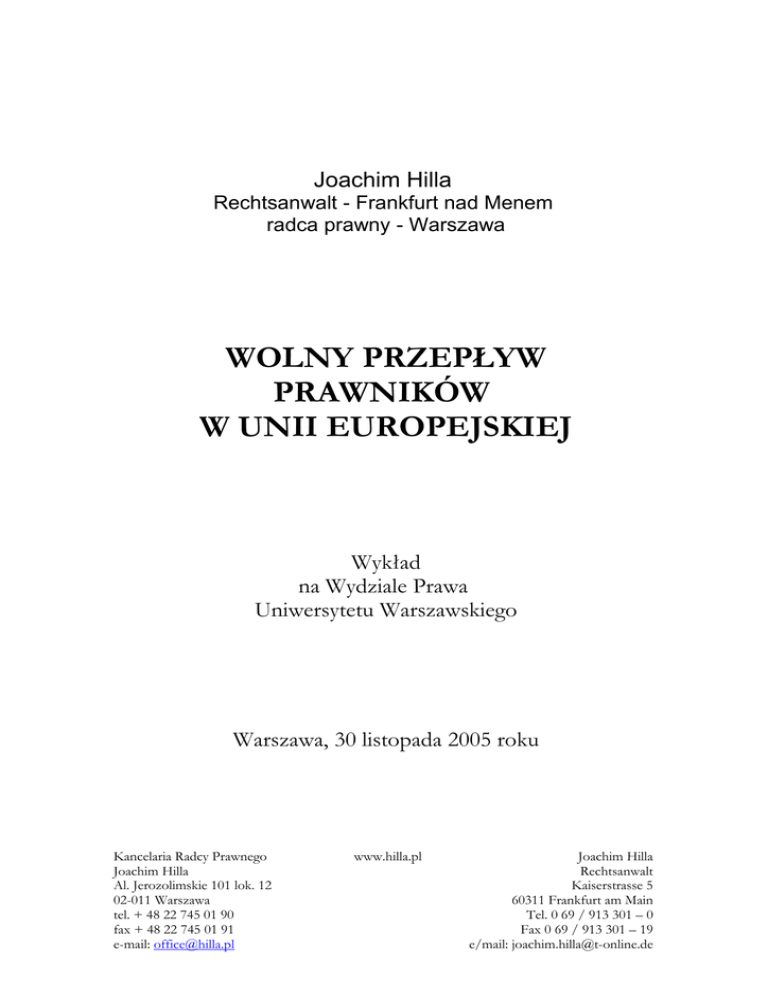 Joachim Hilla Rechtsanwalt - Frankfurt nad Menem radca prawny - Warszawa WOLNY PRZEPŁYW PRAWNIKÓW W UNII EUROPEJSKIEJ Wykład na Wydziale Prawa Uniwersytetu Warszawskiego Warszawa, 30 listopada 2005 roku Kancelaria Radcy Prawnego Joachim Hilla Al. Jerozolimskie 101 lok. 12 02-011 Warszawa tel. + 48 22 745 01 90 fax + 48 22 745 01 91 e-mail: [email protected] www.hilla.pl Joachim Hilla Rechtsanwalt Kaiserstrasse 5 60311 Frankfurt am Main Tel. 0 69 / 913 301 – 0 Fax 0 69 / 913 301 – 19 e/mail: [email protected] Joachim Hilla radca prawny Rechtsanwalt (Frankfurt am Main) I. II. WPROWADZENIE 1. Kazusy europejskie 2. Cel i zakres wykładu 3. Statystyka UWARUNKOWANIA PRAWNE 1. 2. 1. Prawo europejskie a) Art. 49-60 Europejską Traktatu Ustanawiającego Wspólnotę b) Dyrektywa Rady z dn. 22.03.1977 r. mająca na celu ułatwienie skutecznego korzystania przez adwokatów ze swobody świadczenia usług (77/249/EWG) c) Dyrektywa Rady z dn. 21.12.1988 r. dotycząca ogólnego systemu uznawania dyplomów szkół wyższych, przyznanych na zakończenie przynajmniej 3-letniego kształcenia i doskonalenia zawodowego (89/48/EWG) d) Dyrektywa Parlamentu Europejskiego i Rady z dn. 16.02.1998 r. w sprawie ułatwienia stałego wykonywania zawodu adwokata w państwie członkowskim innym niż państwo uzyskania kwalifikacji zawodowych (98/5/UE) Prawo krajowe a) ustawa z dn. 05.07.2002 r. o świadczeniu przez prawników zagranicznych pomocy prawnej w Rzeczypospolitej Polskiej b) ustawa z dn. 26.05.1982 r. prawo o adwokaturze c) ustawa z dn. 06.07.1982 r. o radcach prawnych III. ASPEKTY KULTUROWE Język Joachim Hilla radca prawny Rechtsanwalt (Frankfurt am Main) 2. Kształcenie / dokształcanie 3. Społeczna pozycja adwokata IV. ASPEKTY EKONOMICZNE 4. V. 1. Ubezpieczenie od odpowiedzialności cywilnej 2. Podatki 3. Zabezpieczenie społeczne a) na wypadek choroby b) na wypadek niezdolności do pracy c) emerytalne Koszty działalności i utrzymania PODSUMOWANIE I PERSPEKTYWY 1. Rozwiązanie kazusów europejskich 2. Dyrektywa w sprawie wolności świadczenia usług 3. Świadczenie pomocy prawnej a swoboda konkurencji 4. Wskazówki biliograficzne Joachim Hilla radca prawny Rechtsanwalt (Frankfurt am Main) BIBLIOGRAFIA Literatura: 1. Kłaczyńska Katarzyna, Świadczenie przez prawników zagranicznych pomocy Kłaczyński Michał prawnej w Polsce: Komentarz, Wydawnictwo Prawnicze 2. Bohdan Łukasz LexisNexis, Warszawa 2004, Usługi prawnicze w Unii 3. Kulesza i Kamiński Wydawniczy Zakamycze, Kraków 2000, Swoboda świadczenia usług i wykonywania wolnych Europejskiej, Kantor Biuro Doradztwa zawodów, cz. 1 - Opracowanie analityczne, cz. 2 - Prawnego Dokumenty, Komitet Integracji Europejskiej, Warszawa 4. Filipek Józef 1998, Wykonywanie wolnych zawodów, Urząd Rady Ministrów, Biuro ds. Integracji Europejskiej oraz Pomocy Zagranicznej, Komitet Integracji Europejskiej, Warszawa 1996. Artykuły: 1. Winnicka Hanna Wolność przedsiębiorczości dla prawników w Unii Europejskiej czyli prowadzenie stałej praktyki w innym kraju członkowskim niż ten, w którym uzyskano uprawnienia do wykonywania zawodu radcy prawnego, 2. Winnicka Hanna Radca Prawny nr 5/2005, str. 84-96, Swoboda świadczenia usług prawniczych w prawie 3. Klatka Zenon wspólnotowym, Radca Prawny nr 3/2005, str. 79-88, Reprezentowanie klienta przez prawnika zagranicznego w postępowaniu przez sądami i innymi organami władzy 4. Podleś Marcin publicznej, Radca Prawny nr 5/2004, str. 115-126, Zasady ponadgranicznej działalności prawników w Unii Europejskiej i ich urzeczywistnienie na przykładzie prawa niemieckiego, Radca Prawny nr 5/2003, str. 98- Joachim Hilla radca prawny Rechtsanwalt (Frankfurt am Main) 5. Laszuk Grażyna 112, Świadczenie pomocy prawnej w Zjednoczonej Europie 6. Gromek-Broc a prawo polskie, Radca Prawny nr 4/2001, str. 28-41, Swobodny przepływ adwokatów w Unii Europejskiej w Katarzyna świetle dyrektywy 98/5 WE o prowadzeniu działalności zawodowej na terenie innego kraju członkowskiego, 7. Hilla Joachim Radca Prawny nr 2/2001, str. 86-91, Udział obrońców i pełnomocników z innych państw w postępowaniu karnym przeciwko cudzoziemcom w Polsce, Przestępczość przygraniczna, Wydawnictwo 8. Hilla Joachim Poznańskie, Poznań 2000, Nowe zasady wykonywania zawodu prawnika w Unii Europejskiej (dyrektywa 98/5/EC), Monitor Prawniczy nr 11/1999, str. 52-55.