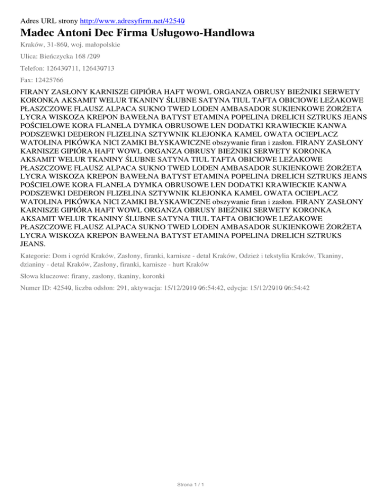 Madec Antoni Dec Firma Uslugowo-Handlowa, Krakow, Bienczycka