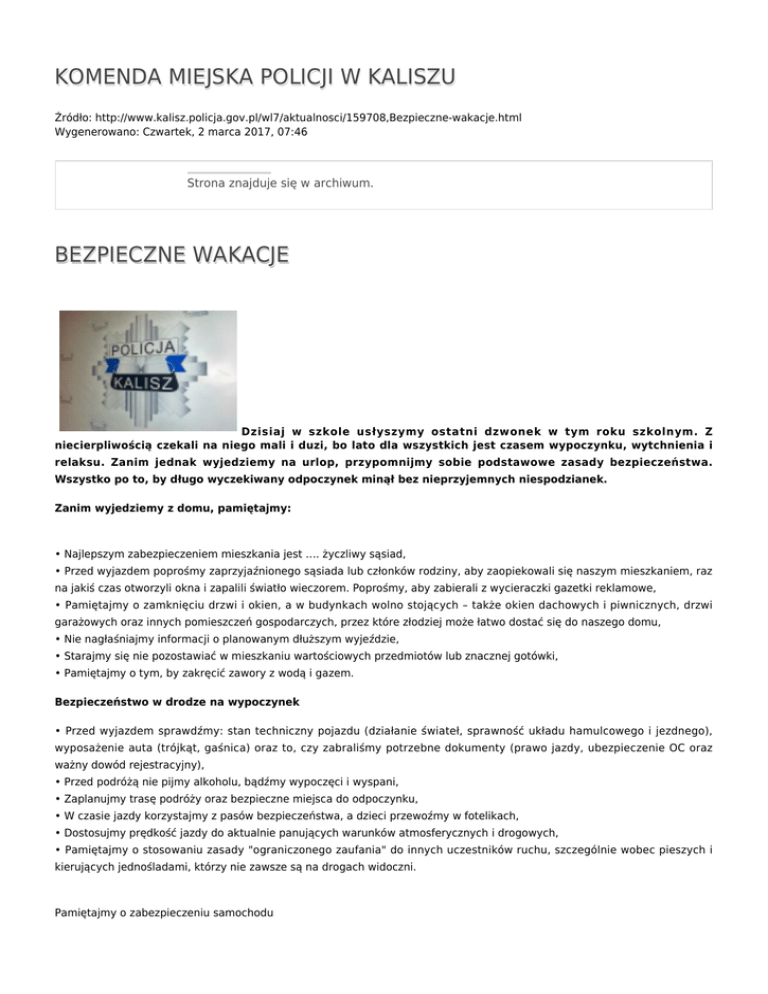 KOMENDA MIEJSKA POLICJI W KALISZU Źródło: http://www.kalisz.policja.gov.pl/wl7/aktualnosci/159708,Bezpieczne-wakacje.html Wygenerowano: Czwartek, 2 marca 2017, 07:46 Strona znajduje się w archiwum. BEZPIECZNE WAKACJE Dzisiaj w szkole usłyszymy ostatni dzwonek w tym roku szkolnym. Z niecierpliwością czekali na niego mali i duzi, bo lato dla wszystkich jest czasem wypoczynku, wytchnienia i relaksu. Zanim jednak wyjedziemy na urlop, przypomnijmy sobie podstawowe zasady bezpieczeństwa. Wszystko po to, by długo wyczekiwany odpoczynek minął bez nieprzyjemnych niespodzianek. Zanim wyjedziemy z domu, pamiętajmy: • Najlepszym zabezpieczeniem mieszkania jest …. życzliwy sąsiad, • Przed wyjazdem poprośmy zaprzyjaźnionego sąsiada lub członków rodziny, aby zaopiekowali się naszym mieszkaniem, raz na jakiś czas otworzyli okna i zapalili światło wieczorem. Poprośmy, aby zabierali z wycieraczki gazetki reklamowe, • Pamiętajmy o zamknięciu drzwi i okien, a w budynkach wolno stojących – także okien dachowych i piwnicznych, drzwi garażowych oraz innych pomieszczeń gospodarczych, przez które złodziej może łatwo dostać się do naszego domu, • Nie nagłaśniajmy informacji o planowanym dłuższym wyjeździe, • Starajmy się nie pozostawiać w mieszkaniu wartościowych przedmiotów lub znacznej gotówki, • Pamiętajmy o tym, by zakręcić zawory z wodą i gazem. Bezpieczeństwo w drodze na wypoczynek • Przed wyjazdem sprawdźmy: stan techniczny pojazdu (działanie świateł, sprawność układu hamulcowego i jezdnego), wyposażenie auta (trójkąt, gaśnica) oraz to, czy zabraliśmy potrzebne dokumenty (prawo jazdy, ubezpieczenie OC oraz ważny dowód rejestracyjny), • Przed podróżą nie pijmy alkoholu, bądźmy wypoczęci i wyspani, • Zaplanujmy trasę podróży oraz bezpieczne miejsca do odpoczynku, • W czasie jazdy korzystajmy z pasów bezpieczeństwa, a dzieci przewoźmy w fotelikach, • Dostosujmy prędkość jazdy do aktualnie panujących warunków atmosferycznych i drogowych, • Pamiętajmy o stosowaniu zasady "ograniczonego zaufania" do innych uczestników ruchu, szczególnie wobec pieszych i kierujących jednośladami, którzy nie zawsze są na drogach widoczni. Pamiętajmy o zabezpieczeniu samochodu • Korzystajmy z parkingów strzeżonych, • Jeżeli nie mamy takiej możliwości, parkujmy auto zawsze w miejscach dobrze oświetlonych, blisko ulicy, • Sprawdźmy, czy pozamykaliśmy okna drzwi. Włączmy autoalarm, • Nie zostawiajmy w samochodzie, w widocznym miejscu, wartościowych przedmiotów (telefon komórkowy, radioodtwarzacz wartościowa odzież). To samo dotyczy pozostawiania w samochodzie toreb z zakupami. Podróż środkami komunikacji publicznej • Kiedy wsiadamy do pustego autobusu czy tramwaju, zajmujmy miejsce blisko kierowcy lub motorniczego. W pociągach wybierzmy przedział, w którym podróżują np. rodziny z dziećmi lub osoby starsze. Unikajmy grup, które spożywają alkohol ich zachowanie może być agresywne, • Przechowujmy pieniądze w różnych miejscach. Wówczas, nawet jeśli padniemy ofiarą złodziei, jest szansa, że nie utracimy całej sumy, • Zajmując miejsce w autobusie czy w tramwaju bagaż pozostawiamy w zasięgu ręki, tak, by móc go stale obserwować. Swoje torebki panie trzymają na kolanach, • Bilety i rzeczy podręczne, niezbędne w podróży, należy trzymać na wierzchu – unikniemy wtedy pokazywania zawartości całego bagażu, kiedy będziemy przeszukiwać jego wnętrze, • Nie powinno się korzystać z poczęstunku oferowanego przez nieznanych współpasażerów - w ten sposób złodzieje często usypiają swoje ofiary, a następnie je okradają, • Jeżeli ktoś źle znosi podróże - powinien zażyć środki farmakologiczne. Pamiętajmy o tym, że złe samopoczucie wywołane "chorobą lokomocyjną" osłabia czujność, uwagę i koncentrację. Bezpieczny wypoczynek nad wodą • Korzystaj tylko z kąpielisk strzeżonych, • Nigdy nie wchodź do wody po alkoholu, • Jeżeli pod Twoją opieką znajdują się małe dzieci, ani na chwilę nie spuszczaj ich z oczu, • Gdy idziesz do wody, nie proś o popilnowanie rzeczy przygodnie poznanych osób - taka sytuacja często kończy się ich utratą, • Po długim leżeniu na słońcu nie zanurzaj się gwałtownie w wodzie - rób to stopniowo, aby uniknąć wstrząsu termicznego, • Nie skacz do płytkiej wody oraz do zbiorników o niezbadanym dnie - taki skok może zakończyć się urazem kręgosłupa i nieodwracalnym kalectwem, • Wypływając łódką, kajakiem, rowerem wodnym lub żaglówką sprawdźmy ich stan techniczny, np.: czy w środku nie ma wody, dziur i połamanych elementów kadłuba, czy sprawne są wiosła, żagle i inny osprzęt, • Upewnijmy się, czy na wyposażeniu jest sprawny sprzęt ratunkowy. Sprawdźmy, czy kamizelka ratunkowa zgodnie z adnotacją wagową zamieszczoną na niej, odpowiada naszej wadze, czy osoby, które zabieramy na pokład potrafią pływać. W przeciwnym razie obowiązkowo powinny one włożyć kamizelki ratunkowe, • Przed wypłynięciem poinformujmy najbliższych lub znajomych dokąd, z kim i jakim sprzętem wypływamy oraz o przewidywanej porze powrotu, • Zabierzmy ze sobą telefon komórkowy z naładowaną baterią, zabezpieczony w wodoszczelnym i pływającym futerale oraz gwizdek, za pomocą którego wezwiemy pomoc gdy będzie potrzebna; miejmy go stale przy sobie. Dziecko w domu • Dziecko do 10 roku życia nie powinno samo zostawać w domu! Dzieci trochę starsze mogą zostawać same, ale na krótko i pod warunkiem, że wiedzą, gdzie są rodzice, znają do nich numer telefonu i potrafią się z nimi skontaktować w razie potrzeby, • W domu, w widocznym miejscu, zostawmy kartkę z numerami telefonów do krewnych, zaufanych sąsiadów i na Policję. Dziecko powinno wiedzieć, że może dzwonić tam zawsze, gdy czuje się w niebezpieczeństwie, • Uprzedźmy dziecko, że kie