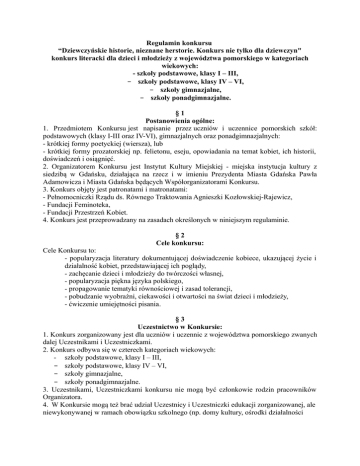 Regulamin konkursu “Dziewczyńskie historie, nieznane herstorie. Konkurs nie tylko dla dziewczyn" konkurs literacki dla dzieci i młodzieży z województwa pomorskiego w kategoriach wiekowych: - szkoły podstawowe, klasy I – III, - szkoły podstawowe, klasy IV – VI, - szkoły gimnazjalne, - szkoły ponadgimnazjalne. §1 Postanowienia ogólne: 1. Przedmiotem Konkursu jest napisanie przez uczniów i uczennice pomorskich szkół: podstawowych (klasy I-III oraz IV-VI), gimnazjalnych oraz ponadgimnazjalnych: - krótkiej formy poetyckiej (wiersza), lub - krótkiej formy prozatorskiej np. felietonu, eseju, opowiadania na temat kobiet, ich historii, doświadczeń i osiągnięć. 2. Organizatorem Konkursu jest Instytut Kultury Miejskiej - miejska instytucja kultury z siedzibą w Gdańsku, działająca na rzecz i w imieniu Prezydenta Miasta Gdańska Pawła Adamowicza i Miasta Gdańska będących Współorganizatorami Konkursu. 3. Konkurs objęty jest patronatami i matronatami: - Pełnomocniczki Rządu ds. Równego Traktowania Agnieszki Kozłowskiej-Rajewicz, - Fundacji Feminoteka, - Fundacji Przestrzeń Kobiet. 4. Konkurs jest przeprowadzany na zasadach określonych w niniejszym regulaminie. §2 Cele konkursu: Cele Konkursu to: - popularyzacja literatury dokumentującej doświadczenie kobiece, ukazującej życie i działalność kobiet, przedstawiającej ich poglądy, - zachęcanie dzieci i młodzieży do twórczości własnej, - popularyzacja piękna języka polskiego, - propagowanie tematyki równościowej i zasad tolerancji, - pobudzanie wyobraźni, ciekawości i otwartości na świat dzieci i młodzieży, - ćwiczenie umiejętności pisania. §3 Uczestnictwo w Konkursie: 1. Konkurs zorganizowany jest dla uczniów i uczennic z województwa pomorskiego zwanych dalej Uczestnikami i Uczestniczkami. 2. Konkurs odbywa się w czterech kategoriach wiekowych: - szkoły podstawowe, klasy I – III, - szkoły podstawowe, klasy IV – VI, - szkoły gimnazjalne, - szkoły ponadgimnazjalne. 3. Uczestnikami, Uczestniczkami konkursu nie mogą być członkowie rodzin pracowników Organizatora. 4. W Konkursie mogą też brać udział Uczestnicy i Uczestniczki edukacji zorganizowanej, ale niewykonywanej w ramach obowiązku szkolnego (np. domy kultury, ośrodki działalności twórczej, świetlice) lub edukacji nieformalnej, jeśli spełniają wymagania dotyczące kategorii wiekowych wskazanych powyżej w ust. 2. §4 Komisja Konkursu: 1. Konkurs przeprowadzi Komisja Konkursowa. W skład Komisji Konkursowej wejdą: - Koordynatorka projektu, pisarka, poetka Barbara Piórkowska, - Poetka Aleksandra Perzyńska, - Przedstawicielka Organizatora Anna Urbańczyk. 2. Komisja będzie odpowiadać za czuwanie nad prawidłowością przebiegu Konkursu, wyłonienie zdobywców, zdobywczyń nagród w każdej z czterech kategorii wiekowych. 3. Decyzje Komisji Konkursowej są ostateczne i nie podlegają odwołaniu. 4. Komisja Konkursowa obraduje na posiedzeniach zwoływanych w miarę potrzeb postępowania konkursowego. 5. Posiedzenia Komisji Konkursowej dla podjęcia wiążących decyzji wymagają obecności przynajmniej 2/3 jej składu. Decyzje Komisji Konkursowej zapadają zwykłą większością obecnych na posiedzeniu Komisji. 6. Każdemu członkowi, członkini Komisji przysługuje 1 głos. 7. Laureatami, laureatkami Konkursu będzie troje Uczestników, Uczestniczek w każdej z czterech kategorii wiekowych, którzy uzyskają największą liczbę głosów. 8. W przypadku uzyskania tej samej ilości głosów przez większą liczbę Uczestników, Uczestniczek – przeprowadza się ponowne głosowanie, w którym biorą udział wyłącznie kandydaci, kandydatki, którzy uzyskali tę samą najwyższą liczbę głosów. §5 Zgłoszenie: 1. Za datę rozpoczęcia Konkursu uważa się dzień 22 stycznia 2013 r., od wskazanego dnia będą przyjmowane przez Organizatora zgłoszenia konkursowe. 2. Zgłoszenia do Konkursu można nadsyłać do 7 kwietnia 2013 r. Nadesłane utwory należy wydrukować w trzech egzemplarzach oznaczonych na każdej stronie godłem (patrz ust. 3.). Nadesłane egzemplarze powinny mieć maksymalnie do trzech stron tekstu formatu A4 pisanych czcionką Times New Roman 12, odstęp 1,5 wiersza; pliki zapisane w formacie rtf lub doc oraz nagrane na opisanej (godło i kategoria wiekowa) płycie CD, DVD lub pendrivie (jeśli Uczestnik, Uczestniczka nie ma możliwości nagrania płyty CD, DVD, pendrive’u – prosimy o kontakt z koordynatorką). Prace prosimy nadsyłać na adres: Anna Urbańczyk Instytut Kultury Miejskiej ul. Długi Targ 39 / 40 80 - 830 Gdańsk Na kopercie prosimy umieścić dopisek „Konkurs herstoryczny literacki”. 3. W celu zachowania anonimowości Uczestników, Uczestniczek, przesyłane prace powinny być zaopatrzone w godło (pseudonim artystyczny np. „gdańszczanka”) oraz kategorię wiekową i nie powinny być oznaczane danymi Uczestnika, Uczestniczki Konkursu. Elektroniczne wersje prac powinny być oznaczone godłem i kategorią wiekową poprzez napis niezmywalnym flamastrem na płycie CD, DVD lub na doklejonej etykiecie na pendrivie. W osobnej kopercie oznaczonej przez Uczestnika, Uczestniczki tym samym godłem prosimy dołączyć dane personalne i teleadresowe (imię, nazwisko, dokładny adres, numer telefonu kontaktowego, e–mail, nazwa i adres oraz dane kontaktowe szkoły lub placówki edukacji nieformalnej). 4. W oznaczeniu pracy konkursowej należy zamieścić informację, z jakiej grupy wiekowej jest Uczestnik, Uczestniczka. 5. Prace złożone po terminie 7 kwietnia 2013 r. (decyduje data stempla pocztowego) nie będą brały udziału w Konkursie. 1. 2. 3. 4. §6 Wymogi odnośnie pracy konkursowej: Zgłoszona do konkursu praca musi spełniać następujące kryteria: - Osoba zgłaszająca jest jej Autorem, Autorką, - Praca jest wykonana przez tylko jednego Autora, Autorkę, - Praca nie może być wcześniej nigdzie publikowana ani rozpowszechniona w innej formie, - Nadesłane p
