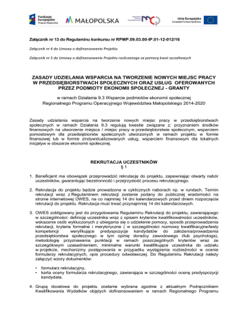 Załącznik nr 13 do Regulaminu konkursu nr RPMP.09.03.00-IP.01-12-012/16 Załącznik nr 6 do Umowy o dofinansowanie Projektu Załącznik nr 5 do Umowy o dofinansowanie Projektu rozliczanego za pomocą kwot ryczałtowych ZASADY UDZIELANIA WSPARCIA NA TWORZENIE NOWYCH MIEJSC PRACY W PRZEDSIĘBIORSTWACH SPOŁECZNYCH ORAZ USŁUG OFEROWANYCH PRZEZ PODMIOTY EKONOMII SPOŁECZNEJ - GRANTY w ramach Działania 9.3 Wsparcie podmiotów ekonomii społecznej Regionalnego Programu Operacyjnego Województwa Małopolskiego 2014-2020 Zasady udzielania wsparcia na tworzenie nowych miejsc pracy w przedsiębiorstwach społecznych w ramach Działania 9.3 regulują kwestie związane z: przyznaniem środków finansowych na utworzenie miejsca / miejsc pracy w przedsiębiorstwie społecznym, wsparciem pomostowym dla przedsiębiorstw społecznych utworzonych w ramach projektu w formie finansowej lub w formie zindywidualizowanych usług, wsparciem finansowym dla lokalnych inicjatyw w obszarze ekonomii społecznej. REKRUTACJA UCZESTNIKÓW §1 1. Beneficjent ma obowiązek przeprowadzić rekrutację do projektu, zapewniając otwarty nabór uczestników, gwarantując bezstronność i przejrzystość procesu rekrutacyjnego. 2. Rekrutacja do projektu będzie prowadzona w cyklicznych naborach np. w rundach. Termin rekrutacji wraz z Regulaminem rekrutacji zostanie podany do publicznej wiadomości na stronie internetowej OWES, na co najmniej 14 dni kalendarzowych przed dniem rozpoczęcia rekrutacji do projektu. Rekrutacja musi trwać przynajmniej 14 dni kalendarzowych. 3. OWES zobligowany jest do przygotowania Regulaminu Rekrutacji do projektu, zawierającego w szczególności: definicję uczestnika wraz z opisem kryteriów kwalifikowalności uczestników, wskazanie osób wykluczonych z ubiegania się o udzielenie pomocy, sposób przeprowadzenia rekrutacji, kryteria formalne i merytoryczne ( w szczególności rozmowy kwalifikacyjne/testy kompetencji weryfikujące predyspozycje kandydatów do założenia/prowadzenia przedsiębiorstwa społecznego w tym opinię doradcy zawodowego i/lub psychologa), metodologię przyznawania punktacji w ramach poszczególnych kryteriów wraz ze szczegółowym uzasadnieniem, minimalne warunki kwalifikujące uczestnika do udziału w projekcie, mechanizmy postępowania w przypadku wystąpienia rozbieżności w ocenie formularzy rekrutacyjnych, opis procedury odwoławczej. Do Regulaminu Rekrutacji należy załączyć wzory dokumentów: • formularz rekrutacyjny, • karta oceny formularza rekrutacyjnego, zawierająca w szczególności ocenę predyspozycji kandydata. 4. Grupą docelowa do projektu zostanie wybrana zgodnie z aktualnym Podręcznikiem Kwalifikowania Wydatków objętych dofinansowaniem w ramach Regionalnego Programu Operacyjnego Województwa Małopolskiego na lata 2014-2020 - Wytyczne Programowe Instytucji Zarządzającej RPO WM 2014-2020, Szczegółowym Opisem Osi Priorytetowych Regionalnego Programu Operacyjnego Województwa Małopolskiego na lata 2014-2020 oraz Wytycznymi w zakresie realizacji przedsięwzięć w obszarze włączenia społecznego i zwalczania ubóstwa z wykorzystaniem środków Europejskiego Funduszu Społecznego i Europejskiego Funduszu Rozwoju Regionalnego na lata 2014-2020. OWES zapewnia, że w dostępie do wsparcia w zakresie tworzenia miejsc pracy w sektorze przedsiębiorstw społecznych preferowane są osoby najbardziej oddalone od rynku pracy, osoby zagrożone ubóstwem lub wykluczeniem społecznym, które skorzystały z projektów w ramach PI 9i, a których ścieżka reintegracji wymaga dalszego wsparcia w ramach PI 9v. 5. O przyznanie wsparcia finansowego mogą ubiegać się następujące osoby i podmioty uczestniczące w projekcie: osoby fizyczne, które w ramach projektu zarejestrują przedsiębiorstwo społeczne (środki przysługują w związku z założeniem przedsiębiorstwa społecznego), istniejące przedsiębiorstwa społeczne na tworzenie nowych miejsc pracy, podmioty ekonomii społecznej1, które zamierzają utworzyć nowe miejsce / miejsca pracy, pod warunkiem przekształcenia się w przedsiębiorstwa społeczne, osoby prawne2, które zamierzają utworzyć przedsiębiorstwo społeczne. W przypadku osób fizycznych zamierzających założyć przedsiębiorstwo społeczne / przystąpić do przedsiębiorstwa społecznego wyłącza się osoby: zarejestrowane w Krajowym Rejestrze Sądowym, Centralnej Ewidencji i Informacji o Działalności Gospodarczej lub prowadzące działalność na podstawie odrębnych przepisów (w tym m.in. działalność adwokacką, komorniczą lub oświatową) w okresie 12 miesięcy poprzedzających dzień przystąpienia do projektu, karane za przestępstwa skarbowe w rozumieniu ustawy z dnia 10 września 1999 r. Kodeks karny skarbowy (Dz. U. 2013 186 z późn. zm.) oraz niekorzystające z pełni praw publicznych i nieposiadające pełnej3/ograniczonej4 zdolności do czynności prawnych, zamierzające prowadzić działalność gospodarczą w sektorach wykluczonych na podstawie art. 1 rozporządzenia Komisji (UE) nr 1407/2013 z dnia 18 grudnia 2013 r. w sprawie stosowania art. 107 i 108 Traktatu o funkcjonowaniu Unii Europejskiej do pomocy de minimis, pozostające w związku małżeńskim lub w faktycznym pożyciu albo w stosunku pokrewieństwa lub powinowactwa w linii prostej, pokrewieństwa lub powinowactwa w linii bocznej do drugiego stopnia z Beneficjentem, partnerem Beneficjenta (w tym podmiotem będącym członkiem partnerstwa posiadającego akredytację ministra właściwego ds. zabezpieczenia społecznego), wykonawcą oraz pracownikami Beneficjenta, partnera lub wykonawcy uczestniczącymi w procesie rekrutacji i przyznawania wsparcia finansowego, 1 O udzielenie wsparcia finansowego nie może ubiegać się podmiot wykluczony z możliwości otrzymania dofinansowania. 2 O udzielenie wsparcia finansowego nie może ubiegać się podmiot wykluczony z możliwości otrzymania dofinansowania. 3 Dotyczy założycieli przedsiębi