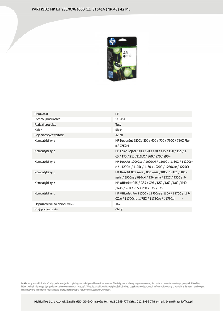 KARTRIDŻ HP DJ 850/870/1600 CZ. 51645A (NR 45) 42 ML Producent HP Symbol producenta 51645A Rodzaj produktu Tusz Kolor Black Pojemność/Zawartość 42 ml Kompatybilny z HP DesignJet 250C / 300 / 400 / 700 / 750C / 750C Plus / 775CM Kompatybilny z HP Color Copier 110 / 120 / 140 / 145 / 150 / 155 / 160 / 170 / 210 /210LX / 260 / 270 / 290 - Kompatybilny z HP DeskJet 1000Cse / 1000Cxi / 1100C / 1120C / 1120Cse / 1120Cxi / 1125c / 1180 / 1220C / 1220Cse / 1220Cx Kompatybilny z HP DeskJet 855 seria / 870 seria / 880c / 882C / 890 seria / 895Cse / 895cxi / 930 seria / 932C / 935C / 9- Kompatybilny z HP OfficeJet G55 / G85 / G95 / K50 / K60 / K80 / R40 / R45 / R60 / R65 / R80 / T45 / T65 Kompatybilny z HP OfficeJet Pro 1150C / 1150Cse / 1160 / 1170C / 1170Cse / 1170Cxi / 1175C / 1175Cse / 1175Cxi Dopuszczenie do obrotu w RP Tak Kraj pochodzenia Chiny - Dokładamy wszelkich starań aby podane zdjęcie i opis były w pełni prawidłowe i kompletne. Niestety, nie możemy zagwarantować, że podane dane nie zawierają pomyłek i błędów, które jednak nie mogą być podstawą do ewentualnych roszczeń. W razie jakichkolwiek wątpliwości lub chęci uzyskania dodatkowych informacji prosimy o kontakt z działem handlowym. Prezentowane informacje nie stanowią oferty handlowej w rozumieniu Kodeksu Cywilnego. Multioffice Sp. z o.o. ul. Zawiła 65D, 30-390 Kraków tel.: 012 2999 777 faks: 012 2999 778 e-mail: [email protected]