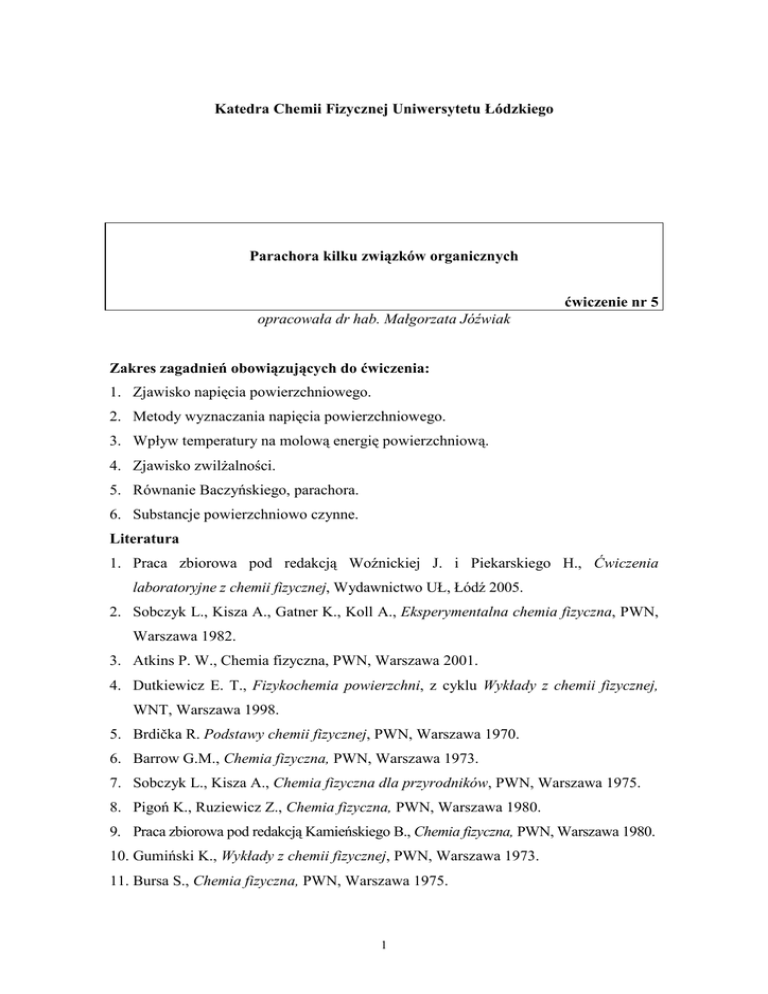 Katedra Chemii Fizycznej Uniwersytetu Łódzkiego Parachora kilku związków organicznych ćwiczenie nr 5 opracowała dr hab. Małgorzata Jóźwiak Zakres zagadnień obowiązujących do ćwiczenia: 1. Zjawisko napięcia powierzchniowego. 2. Metody wyznaczania napięcia powierzchniowego. 3. Wpływ temperatury na molową energię powierzchniową. 4. Zjawisko zwilżalności. 5. Równanie Baczyńskiego, parachora. 6. Substancje powierzchniowo czynne. Literatura 1. Praca zbiorowa pod redakcją Woźnickiej J. i Piekarskiego H., Ćwiczenia laboratoryjne z chemii fizycznej, Wydawnictwo UŁ, Łódź 2005. 2. Sobczyk L., Kisza A., Gatner K., Koll A., Eksperymentalna chemia fizyczna, PWN, Warszawa 1982. 3. Atkins P. W., Chemia fizyczna, PWN, Warszawa 2001. 4. Dutkiewicz E. T., Fizykochemia powierzchni, z cyklu Wykłady z chemii fizycznej, WNT, Warszawa 1998. 5. Brdička R. Podstawy chemii fizycznej, PWN, Warszawa 1970. 6. Barrow G.M., Chemia fizyczna, PWN, Warszawa 1973. 7. Sobczyk L., Kisza A., Chemia fizyczna dla przyrodników, PWN, Warszawa 1975. 8. Pigoń K., Ruziewicz Z., Chemia fizyczna, PWN, Warszawa 1980. 9. Praca zbiorowa pod redakcją Kamieńskiego B., Chemia fizyczna, PWN, Warszawa 1980. 10. Gumiński K., Wykłady z chemii fizycznej, PWN, Warszawa 1973. 11. Bursa S., Chemia fizyczna, PWN, Warszawa 1975. 1 Celem ćwiczenia jest zbadanie parachory kilku substancji organicznych: 1,4-dioksanu, octanu etylu i n-heptanu w różnych temperaturach. Układ pomiarowy Pomiary napięcia powierzchniowego cieczy wykonuje się metodą pęcherzykową przy użyciu aparatury przedstawionej na rys. 1. K 1 E B śruba mikrometryczna 2 A H kapilara 3 1 2 3 4 5 6 7 8 910 manometr F naczynie pomiarowe hr Rys. 1. Schemat układu do pomiaru napięcia powierzchniowego metodą pęcherzykową. Do pomiaru ciśnienia manometrycznego stosuje się manometr przedstawiony na rys. 2. Przy użyciu tego manometru odczytuje się odległość na jaką wychyla się pęcherz powietrza znajdujący się w cieczy manometrycznej. Pozwala to na uzyskanie dokładniejszych wyników pomiarów. maksymalne wychylenie pęcherza powietrza hm hn 0 1 2 3 4 5 6 7 8 9 10 Rys. 2. Schemat manometru w kształcie prostokąta. 2 Odczynniki chemiczne i sprzęt laboratoryjny: woda podwójnie destylowana, 1,4-dioksan (C4H8O2), octan etylu (C4H8O2), n-heptan (C7H16), kapilara, 4 pipety (5 cm3), gruszka gumowa. Wykonanie ćwiczenia i przedstawienie wyników pomiarów Pomiary napięcia powierzchniowego wody oraz substancji badanych przeprowadzić w trzech temperaturach w zakresie 25oC – 50oC. (np. 25, 38, 50 C) 1. Włączyć termostat i nastawić go na pierwszą ze wskazanych temperatur (patrz dalej – Obsługa termostatu). 2. Do czterech naczyń pomiarowych nalać kolejno po ok. 5 cm3 wody, 1,4-dioksanu, octanu etylu i n-heptanu. 3. Po ustaleniu się wskazań temperatury na termometrze, odczekać jeszcze 20 minut w celu dokładnego wytermostatowania roztworów. Odczytać temperaturę na termometrze umieszczonym w termostacie. 4. Przesuwając skalę manometru (linijka) ustawić pęcherz w położenie “0” (rys. 3). 5. Śrubę mikrometryczną B ustawić w położenie maksymalne ≈ 20 mm w taki sposób, aby końcówka śruby oparta była na podstawce A. Następnie suwnicę H przesunąć tak, aby kapilara znalazła się tuż nad powierzchnią cieczy badanej (np. 2 mm). 6. Wyciągnąć korek K. Odkręcić całkowicie kranik E. Zwiększa się ciśnienie wewnątrz układu i z kapilary wypychane są pęcherzyki powietrza. 7. Obracając śrubą mikrometryczną ustawić kapilarę dokładnie na powierzchni styku z cieczą. („Punkt zerowy”). Odczytać wartość liczbową na bębnie śruby mikrometrycznej. 8. Kapilarę zanurzyć do wody na głębokość hrw = 6 mm (jeden pełny obrót śruby powoduje zanurzenie kapilary na głębokość 0,5 mm). 9. Po ustaleniu się maksymalnego wychylenia pęcherza w manometrze odczytać z dokładnością ±1 mm wartość hnw (rys. 3). 10. Po zakończeniu pomiaru kapilarę wyciągnąć nad powierzchnie wody, używając śruby mikrometrycznej. 11. Po zakończeniu pomiarów w wodzie, osuszyć kapilarę i ustawić nad naczyniem zawierającym kolejną ciecz.. 12. Podwyższyć temperaturę w termostacie. Po ustaleniu się temperatury t, odczekać jeszcze minimum 15 minut. 3 13. Wykonać pomiary maksymalnego wychylenia się pęcherza nw. dla wody i cieczy badanych hnx w pozostałych dwóch temperaturach, powtarzając czynności opisane w punktach 3–14. 14. Po zakończeniu pomiarów zakręcić wszystkie kraniki, wkraplacz (1) zamknąć korkiem K, ciecze wylać. Uwaga ! W czasie wykonywania ćwiczenia należy uważać, aby we wkraplaczu (1) zawsze była woda. Jeżeli we wkraplaczu (3) poziom wody będzie sięgał rurki, z której ona wypływa, należy przy zdjętej kapilarze i wężyku z manometru oraz zakręconym kraniku E odkręcić kranik F i zlać wodę do krystalizatora. Wkraplacz (1) uzupełnić świeżą wodą destylowaną. Obsługa termostatu 1. Włączyć termostat do sieci. 2. Odkręcić wodę w kranie, do którego podłączony jest termostat. 3. Przycisnąć przycisk 1. 4. Ustawić temperaturę pomiaru na 20oC (pozostałe pokrętła pozostają bez zmian). 5. W przypadku, gdy termostat wskazuje temperaturę wyższą od zadanej należy odkręcić silniej wodę w kranie. Tabela wyników pomiarów t [oC] Woda 1,4-Dioksan Octan etylu hnw [m] hnx[m] hnx[m] t1= t2= t3= 4 n-Heptan hnx[m] Opracowanie i dyskusja wyników pomiarów 1. Przeliczenie poziomego przesunięcia pęcherza w manometrze (hnw, hnx ) na różnicę poziomów cieczy manometrycznej (hmw, hmx ) wykonać z pomocą zależności: hm = 0,2013 hn. Wartości te podać w układzie jednostek SI. Uzyskane wyniki zapisać w poniższej tabeli. 2. Wykorzystując podaną poniżej zależność napięcia powierzchniowego wody σw od temperatury tw, obliczyć napięcie powierzchniowe wody w temperaturach, w których były wykonywane pomiary. σw = (75,92 - 0,163tw)10-3 [N m-1