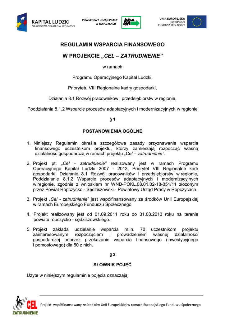 W ROPCZYCACH POWIATOWY URZĄD PRACY W ROPCZYCACH REGULAMIN WSPARCIA FINANSOWEGO W PROJEKCIE „CEL – ZATRUDNIENIE” w ramach Programu Operacyjnego Kapitał Ludzki, Priorytetu VIII Regionalne kadry gospodarki, Działania 8.1 Rozwój pracowników i przedsiębiorstw w regionie, Poddziałania 8.1.2 Wsparcie procesów adaptacyjnych i modernizacyjnych w regionie §1 POSTANOWIENIA OGÓLNE 1. Niniejszy Regulamin określa szczegółowe zasady przyznawania wsparcia finansowego uczestnikom projektu, którzy zamierzają rozpocząć własną działalność gospodarczą w ramach projektu „Cel – zatrudnienie”. 2. Projekt pt. „Cel - zatrudnienie” realizowany jest w ramach Programu Operacyjnego Kapitał Ludzki 2007 - 2013, Priorytet VIII Regionalne kadr gospodarki, Działanie 8.1 Rozwój pracowników i przedsiębiorstw w regionie, Poddziałanie 8.1.2 Wsparcie procesów adaptacyjnych i modernizacyjnych w regionie, zgodnie z wnioskiem nr WND-POKL.08.01.02-18-051/11 złoŜonym przez Powiat Ropczycko - Sędziszowski - Powiatowy Urząd Pracy w Ropczycach. 3. Projekt „Cel - zatrudnienie” jest współfinansowany ze środków Unii Europejskiej w ramach Europejskiego Funduszu Społecznego 4. Projekt realizowany jest od 01.09.2011 roku do 31.08.2013 roku na terenie powiatu ropczycko - sędziszowskiego. 5. Projekt zakłada udzielanie wsparcia m.in. 70 uczestnikom projektu zainteresowanym rozpoczęciem i prowadzeniem własnej działalności gospodarczej poprzez przekazanie wsparcia finansowego (inwestycyjnego i pomostowego) dla 50 z nich. §2 SŁOWNIK POJĘĆ UŜyte w niniejszym regulaminie pojęcia oznaczają: Projekt współfinansowany ze środków Unii Europejskiej w ramach Europejskiego Funduszu Społecznego W ROPCZYCACH POWIATOWY URZĄD PRACY W ROPCZYCACH 1. Beneficjent i Projektodawca - Powiatowy Urząd Pracy w Ropczycach ul. Najświętszej Marii Panny 2, kod pocztowy: 39-100 Ropczyce, 2. Instytucja Pośrednicząca ( w skrócie IP) - Wojewódzki Urząd Pracy w Rzeszowie z siedzibą przy ul. Lisa – Kuli 20, 35-025 Rzeszów. 3. Wytyczne – Wytyczne Instytucji Pośredniczącej w sprawie wsparcia dla osób zamierzających rozpocząć działalność gospodarczą w ramach Programu Operacyjnego Kapitał Ludzki Priorytet VIII Regionalne kadry gospodarki Działanie 8.1 „Rozwój pracowników i przedsiębiorstw w regionie” Poddziałanie 8.1.2 „Wsparcie procesów adaptacyjnych i modernizacyjnych w regionie w Województwie Podkarpackim . 4. Projekt – Projekt pt. „Cel - zatrudnienie” realizowany w ramach Programu Operacyjnego Kapitał Ludzki 2007 -2013, Priorytet VIII Regionalne kadr gospodarki, Działanie 8.1 Rozwój pracowników i przedsiębiorstw w regionie, Poddziałanie 8.1.2 Wsparcie procesów adaptacyjnych i modernizacyjnych w regionie, zgodnie z wnioskiem nr WND-POKL.08.01.02-18-051/11 złoŜonym przez Powiat Ropczycko - Sędziszowski - Powiatowy Urząd Pracy w Ropczycach. 5. Uczestnik (Uczestniczka) projektu - bezpośredni odbiorca wsparcia - osoba fizyczna zamierzająca rozpocząć działalność gospodarczą, która została zakwalifikowana do udziału w projekcie i podpisała deklarację uczestnictwa. 6. Wnioskodawca - uczestnik projektu ubiegający się o wsparcie finansowe na rozwój przedsiębiorczości. 7. Beneficjent pomocy - uczestnik projektu, który rozpoczął i prowadzi działalność gospodarczą w trakcie usługi szkoleniowo - doradczej zgodnie z regułami konkurencji określonymi w przepisach tytułu VII rozdziału 1 Traktatu o Funkcjonowaniu Unii Europejskiej (TFUE) i otrzymał w związku z tym pomoc de minimis. 8. Komisja Oceny Wniosków (KOW) - organ powołany przez Beneficjenta, oceniający składane przez uczestników projektu wnioski wraz z załącznikami o przyznanie wsparcia finansowego oraz wsparcia pomostowego. 9. Lista rankingowa -lista kandydatów zawierająca numer wniosku oraz liczbę punktów zdobytych podczas oceny merytorycznej, przy czym miejsce na liście zaleŜy od liczby punktów od najwyŜszej do najniŜszej. 10. Wsparcie szkoleniowo - doradcze - naleŜy przez to rozumieć przewidziane w projekcie doradztwo indywidualne, poradnictwo psychologiczne indywidualne i grupowe oraz szkolenia pozwalające na zdobycie wiedzy z zakresu zakładania i prowadzenia działalności gospodarczej. 11. Doradztwo (indywidualne) - usługa udzielona uczestnikowi, której celem jest rozwiązanie lub przedstawienie propozycji rozwiązania konkretnego problemu Projekt współfinansowany ze środków Unii Europejskiej w ramach Europejskiego Funduszu Społecznego W ROPCZYCACH POWIATOWY URZĄD PRACY W ROPCZYCACH oraz opracowanie i/lub wdroŜenie rozwiązań zaproponowanych przez osobę udzielającą usługi doradczej. 12. Działalność gospodarcza - naleŜy przez to rozumieć zarobkową działalność wytwórczą, budowlaną, handlową, usługową oraz poszukiwanie, rozpoznawanie kopalin ze złóŜ, a takŜe działalność zawodową, wykonywaną w sposób zorganizowany i ciągły -na podstawie ustawy z dnia 2 lipca 2004 roku o swobodzie działalności gospodarczej (tekst jednolity Dz. U. z 2007 r. Nr 155 poz.1095 ze zm.). 13. Wsparcie finansowe na rozwój przedsiębiorczości - wsparcie do wysokości 40 tys. zł. dla wybranych w drodze oceny złoŜonych wniosków i biznes planów uczestników projektu, którzy na etapie realizacji wsparcia szkoleniowodoradczego zarejestrowali działalność gospodarczą. 14. Dzień rozpoczęcia działalności gospodarczej - w oparciu o Wytyczne IP dzień wskazany jako data rozpoczęcia działalności we wpisie do ewidencji działalności gospodarczej. 15. Podstawowe finansowe wsparcie pomostowe - wsparcie kapitałowe przyznawane w okresie do 6 miesięcy, mające na celu pokrycie bieŜących opłat bezpośrednio związanych z prowadzeniem działalności gospodarczej. 16. Pomoc de minimis -naleŜy przez to rozumieć pomoc udzielaną Przedsiębiorcom w rozumieniu Rozporządzanie Komisji (WE) 1998/2006 z 15 grudnia 2006 r. w sprawie stosowania