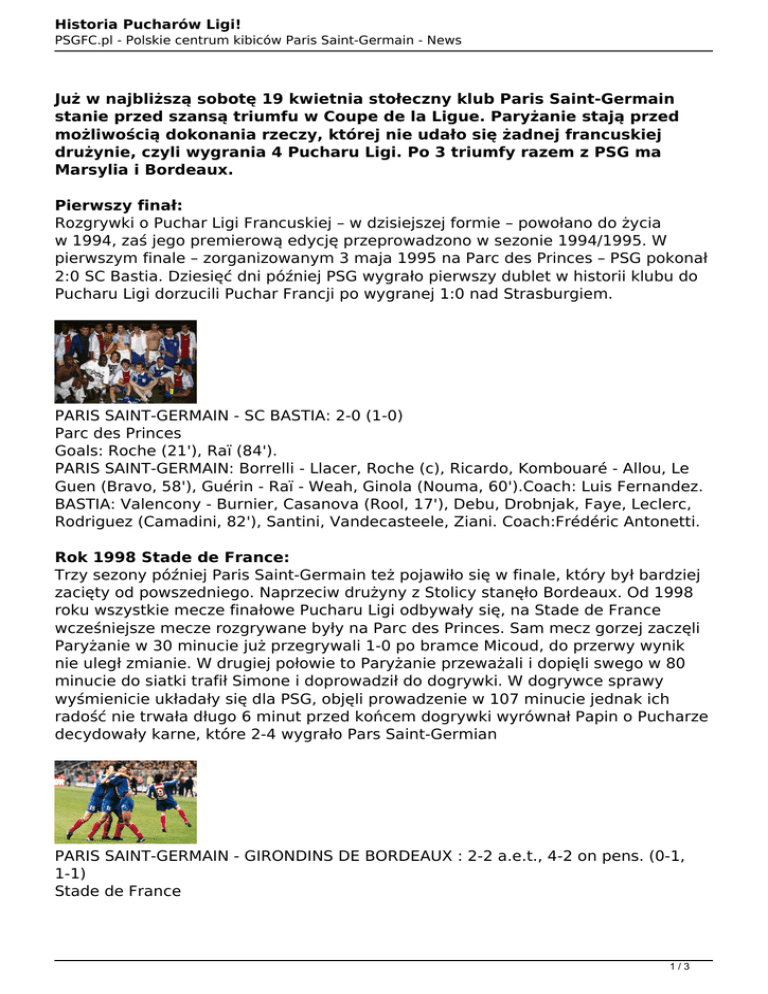 Historia Pucharów Ligi! PSGFC.pl - Polskie centrum kibiców Paris Saint-Germain - News Już w najbliższą sobotę 19 kwietnia stołeczny klub Paris Saint-Germain stanie przed szansą triumfu w Coupe de la Ligue. Paryżanie stają przed możliwością dokonania rzeczy, której nie udało się żadnej francuskiej drużynie, czyli wygrania 4 Pucharu Ligi. Po 3 triumfy razem z PSG ma Marsylia i Bordeaux. Pierwszy finał: Rozgrywki o Puchar Ligi Francuskiej – w dzisiejszej formie – powołano do życia w 1994, zaś jego premierową edycję przeprowadzono w sezonie 1994/1995. W pierwszym finale – zorganizowanym 3 maja 1995 na Parc des Princes – PSG pokonał 2:0 SC Bastia. Dziesięć dni później PSG wygrało pierwszy dublet w historii klubu do Pucharu Ligi dorzucili Puchar Francji po wygranej 1:0 nad Strasburgiem. PARIS SAINT-GERMAIN - SC BASTIA: 2-0 (1-0) Parc des Princes Goals: Roche (21'), Raï (84'). PARIS SAINT-GERMAIN: Borrelli - Llacer, Roche (c), Ricardo, Kombouaré - Allou, Le Guen (Bravo, 58'), Guérin - Raï - Weah, Ginola (Nouma, 60').Coach: Luis Fernandez. BASTIA: Valencony - Burnier, Casanova (Rool, 17'), Debu, Drobnjak, Faye, Leclerc, Rodriguez (Camadini, 82'), Santini, Vandecasteele, Ziani. Coach:Frédéric Antonetti. Rok 1998 Stade de France: Trzy sezony później Paris Saint-Germain też pojawiło się w finale, który był bardziej zacięty od powszedniego. Naprzeciw drużyny z Stolicy stanęło Bordeaux. Od 1998 roku wszystkie mecze finałowe Pucharu Ligi odbywały się, na Stade de France wcześniejsze mecze rozgrywane były na Parc des Princes. Sam mecz gorzej zaczęli Paryżanie w 30 minucie już przegrywali 1-0 po bramce Micoud, do przerwy wynik nie uległ zmianie. W drugiej połowie to Paryżanie przeważali i dopięli swego w 80 minucie do siatki trafił Simone i doprowadził do dogrywki. W dogrywce sprawy wyśmienicie układały się dla PSG, objęli prowadzenie w 107 minucie jednak ich radość nie trwała długo 6 minut przed końcem dogrywki wyrównał Papin o Pucharze decydowały karne, które 2-4 wygrało Pars Saint-Germian PARIS SAINT-GERMAIN - GIRONDINS DE BORDEAUX : 2-2 a.e.t., 4-2 on pens. (0-1, 1-1) Stade de France 1/3 Historia Pucharów Ligi! PSGFC.pl - Polskie centrum kibiców Paris Saint-Germain - News Goals: Micoud (B) 30', Simone (P) 80', Raï (P) 107', Papin (B) 114' PARIS SAINT-GERMAIN: Fernandez - Algerino, Roche (Fournier, 77'), Rabesandratana, Domi (Cissé, 110') - Gava, Le Guen, Ducrocq - Raï (c) - Simone, Maurice (Loko, 74'). Coach: Ricardo. BORDEAUX: Rame - Blondeau (Afanou, 80'), Gralak, Grenet (Papin, 29'), Jemmali, Micoud, Luccin, Saveljic, Laslandes, Pavon, Wiltord. Coach: Guy Stéphan. Rozczarowanie: Wielkim ciosem dla wszystkich kibiców musiał być finał z 2000 roku. Paris SaintGermain w roli wielkiego faworyta podejmowało na Stade de France drugo ligowy zespół Fc Gueugnon. Piłkarze Philippe Bergeroô sprawili wielką niespodziankę i po golach Trapasso (65') i Flauto (90’) minucie przegrali finał 2-0 FC GUEUGNON - PARIS SAINT-GERMAIN: 2-0 (0-0) Stade de France Goals: Trapasso 65', Flauto 90'. GUEUGNON: Trivino - Bouzin, Boniface, Distin, Fanzel, Neumann (Weber 80'), Chabert, Esceth-N’Zi (Flauto, 76'), Traoré, Roda (Collin, 85'), Trapasso.Coach: Alex Dupont. PARIS SAINT-GERMAIN: Casagrande - Cissé, El Karkouri, Rabesandratana, Yanovski Benarbia (c), Okocha, Ducrocq, Robert (Murati, 76') - Leroy (Diawara, 72'), Christian. Coach: Philippe Bergeroô. Powrót na zwycięskie tory! Paris Saint-Germain czekało kolejne osiem lat na finał Pucharu Ligi mecz z Lens był emocjonujący do ostatniego gwizdka arbitra. Strzelanie w 19 minucie rozpoczął Pauleta i to Lens do przerwy schodziło z skromną zaliczką. Tuż po przerwie Paris Saint-Germain odrobiło straty Éric Carrière trafił na 1-1. Już w doliczonym czasie gry kapitan Lens Hilton wykosił w polu karnym zawodnika PSG a sędzia wskazał na 11 metr do jedenastki podszedł Mendy i dał Puchar Paryżowi. 2/3 Historia Pucharów Ligi! PSGFC.pl - Polskie centrum kibiców Paris Saint-Germain - News RC LENS - PARIS SAINT-GERMAIN: 1-2 (0-1) Stade de France Goals: Pauleta (P) 19, Carrière (L) 51', Mendy (P) pen. 90+3' LENS: Le Crom - Hilton (c), Coulibaly, Belhadj, Laurenti, Mangane, Carrière, Kovacevic, Maoulida (Demont, 84'), Remy (Monterrubio, 13'), Monnet-Paquet (Dindane, 68'). Coach: Jean-Pierre Papin. PARIS SAINT-GERMAIN: Landreau - Ceara, Camara, Sakho, Armand - Chantôme (Mendy, 64'), Bourillon, Clément, Rothen - Pauleta (c) (Luyindula, 66'), Diané. Coach: Paul Le Guen. Autor: Cover 3/3 Powered by TCPDF (www.tcpdf.org)