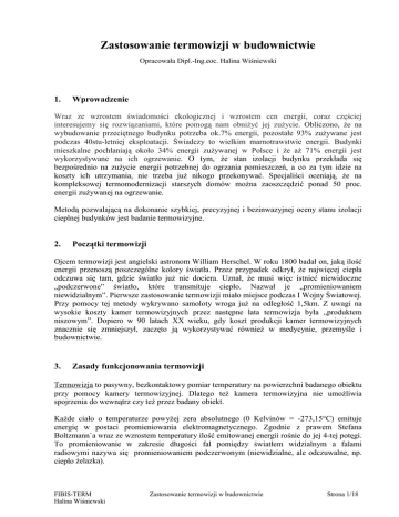 Zastosowanie termowizji w budownictwie Opracowała Dipl.-Ing.eoc. Halina Wiśniewski 1. Wprowadzenie Wraz ze wzrostem świadomości ekologicznej i wzrostem cen energii, coraz częściej interesujemy się rozwiązaniami, które pomogą nam obniżyć jej zużycie. Obliczono, że na wybudowanie przeciętnego budynku potrzeba ok.7% energii, pozostałe 93% zużywane jest podczas 40stu-letniej eksploatacji. Świadczy to wielkim marnotrawstwie energii. Budynki mieszkalne pochłaniają około 34% energii zużywanej w Polsce i że aż 71% energii jest wykorzystywane na ich ogrzewanie. O tym, że stan izolacji budynku przekłada się bezpośrednio na zużycie energii potrzebnej do ogrzania pomieszczeń, a co za tym idzie na koszty ich utrzymania, nie trzeba już nikogo przekonywać. Specjaliści oceniają, że na kompleksowej termomodernizacji starszych domów można zaoszczędzić ponad 50 proc. energii zużywanej na ogrzewanie. Metodą pozwalającą na dokonanie szybkiej, precyzyjnej i bezinwazyjnej oceny stanu izolacji cieplnej budynków jest badanie termowizyjne. 2. Początki termowizji Ojcem termowizji jest angielski astronom William Herschel. W roku 1800 badał on, jaką ilość energii przenoszą poszczególne kolory światła. Przez przypadek odkrył, że najwięcej ciepła odczuwa się tam, gdzie światło już nie dociera. Uznał, że musi więc istnieć niewidoczne „podczerwone” światło, które transmituje ciepło. Nazwał je „promieniowaniem niewidzialnym”. Pierwsze zastosowanie termowizji miało miejsce podczas I Wojny Światowej. Przy pomocy tej metody wykrywano samoloty wroga już na odległość 1,5km. Z uwagi na wysokie koszty kamer termowizyjnych przez następne lata termowizja była „produktem niszowym”. Dopiero w 90 latach XX wieku, gdy koszt produkcji kamer termowizyjnych znacznie się zmniejszył, zaczęto ją wykorzystywać również w medycynie, przemyśle i budownictwie. 3. Zasady funkcjonowania termowizji Termowizja to pasywny, bezkontaktowy pomiar temperatury na powierzchni badanego obiektu przy pomocy kamery termowizyjnej. Dlatego też kamera termowizyjna nie umożliwia spojrzenia do wewnątrz czy też przez badany obiekt. Każde ciało o temperaturze powyżej zera absolutnego (0 Kelvinów = -273,15°C) emituje energię w postaci promieniowania elektromagnetycznego. Zgodnie z prawem Stefana Boltzmann`a wraz ze wzrostem temperatury ilość emitowanej energii rośnie do jej 4-tej potęgi. To promieniowanie w zakresie długości fal pomiędzy światłem widzialnym a falami radiowymi nazywa się promieniowaniem podczerwonym (niewidzialne, ale odczuwalne, np. ciepło żelazka). FIBIS-TERM Halina Wiśniewski Zastosowanie termowizji w budownictwie Strona 1/18 Podział promieniowania elektromagnetycznego Promieniowanie podczerwone jest rejestrowane przez kamerę termowizyjną i przetwarzane na kolorową mapę temperatur. Obraz powstały w wyniku przetworzenia przez kamerę termowizyjną zarejestrowanego promieniowania emitowanego przez badany obiekt na kolorową mapę temperatur to termogram. Termogram odzwierciedla więc rozkład temperatury powierzchniowej badanego obiektu. Moc promieniowania ciała zależy od jego temperatury, dlatego miejsca cieplejsze wydają się jaśniejsze na obrazie cieplnym. Analiza termogramów umożliwia zlokalizowanie miejsc występowania strat ciepła oraz służy do wykrywania nieprawidłowości w funkcjonowaniu urządzeń i instalacji cieplnych. Na ich podstawie można też opracować audyt energetyczny, konieczny przy planowaniu termomodernizacji budynku czy też jego remontu. 4. Współczynnik emisyjności Podstawą rozważań na temat promieniowania podczerwonego jest tzw. ciało doskonale czarne, które pochłania całość promieniowania padającego na nie, niezależnie od kąta padania, długości fali czy mocy źródła promieniowania. Takie ciało nigdy nie pojawia się w rzeczywistości. W przypadku ciał rzeczywistych pomiary promieniowania podczerwonego są dość skomplikowane, ponieważ każde ciało rzeczywiste (budynek, urządzenie, człowiek) oprócz zdolności do emisji promieniowania podczerwonego może je także absorbować, odbijać lub przepuszczać. Emisja, absorpcja, odbijanie i transmisja promieniowania zależą przede wszystkim od faktycznej temperatury ciała oraz właściwości materiału (kolor, stopień obróbki) i warunków fizycznych otaczającego go środowiska. Współczynnik emisyjności odgrywa w badaniach termowizyjnych bardzo ważną rolę, ponieważ musi on być każdorazowo nadany kamerze. Określa on zdolność danego ciała do emitowania promieniowania podczerwonego z pominięciem energii odbitej i przepuszczanej. FIBIS-TERM Halina Wiśniewski Zastosowanie termowizji w budownictwie Strona 2/18 Przyjmuje wartości w przedziale od 0 do 1. Najlepiej, gdy jest on bliski 1. Wtedy pomiar jest prostszy i dokładniejszy. Pracę operatora kamery termowizyjnej ułatwia fakt, że większość materiałów charakteryzuje się stałym współczynnikiem emisyjności. Problem stanowią jedynie powierzchnie błyszczące, chropowate czy też zanieczyszczone. W praktyce przyjmuje się średni współczynnik emisyjności. Wartości tych współczynników podawane są w tabelach. Prawidłowe ustawienie kamerze tej wartości pozwala na ograniczenie błędów pomiarowych oraz na poprawną interpretację termogramów (przykład złotej obrączki na palcu). W poniższej tabeli przedstawiono przykładowe wartości współczynnika emisyjności. Współczynniki emisyjności dla typowych materiałów Materiał Emisyjność* Brąz, polerowany Brąz, porowaty, surowy Cegła, standardowa Cement Cynk, blacha Farba, olejowa, zwykła Guma Lakier, biały Lakier, czarny, błyszczący Lakier, czarny, matowy Lód Miedź, polerowana Miedź, utleniona, sczerniała Papa Papier, biały, czarny, błyszczący Płyta azbestowa Sadza Stal, blacha, niklowana Stal, blacha, walcowana Stal, niepolerowana Szkło Szkło, matowe Śnieg Taśma,