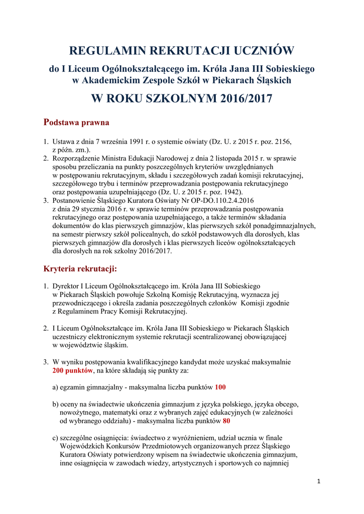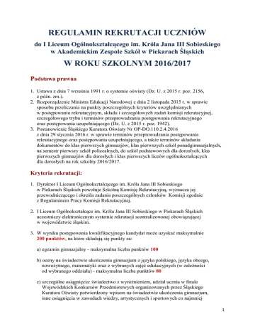 REGULAMIN REKRUTACJI UCZNIÓW do I Liceum Ogólnokształcącego im. Króla Jana III Sobieskiego w Akademickim Zespole Szkół w Piekarach Śląskich W ROKU SZKOLNYM 2016/2017 Podstawa prawna 1. Ustawa z dnia 7 września 1991 r. o systemie oświaty (Dz. U. z 2015 r. poz. 2156, z późn. zm.). 2. Rozporządzenie Ministra Edukacji Narodowej z dnia 2 listopada 2015 r. w sprawie sposobu przeliczania na punkty poszczególnych kryteriów uwzględnianych w postępowaniu rekrutacyjnym, składu i szczegółowych zadań komisji rekrutacyjnej, szczegółowego trybu i terminów przeprowadzania postępowania rekrutacyjnego oraz postępowania uzupełniającego (Dz. U. z 2015 r. poz. 1942). 3. Postanowienie Śląskiego Kuratora Oświaty Nr OP-DO.110.2.4.2016 z dnia 29 stycznia 2016 r. w sprawie terminów przeprowadzania postępowania rekrutacyjnego oraz postępowania uzupełniającego, a także terminów składania dokumentów do klas pierwszych gimnazjów, klas pierwszych szkół ponadgimnazjalnych, na semestr pierwszy szkół policealnych, do szkół podstawowych dla dorosłych, klas pierwszych gimnazjów dla dorosłych i klas pierwszych liceów ogólnokształcących dla dorosłych na rok szkolny 2016/2017. Kryteria rekrutacji: 1. Dyrektor I Liceum Ogólnokształcącego im. Króla Jana III Sobieskiego w Piekarach Śląskich powołuje Szkolną Komisję Rekrutacyjną, wyznacza jej przewodniczącego i określa zadania poszczególnych członków Komisji zgodnie z Regulaminem Pracy Komisji Rekrutacyjnej. 2. I Liceum Ogólnokształcące im. Króla Jana III Sobieskiego w Piekarach Śląskich uczestniczy elektronicznym systemie rekrutacji scentralizowanej obowiązującej w województwie śląskim. 3. W wyniku postępowania kwalifikacyjnego kandydat może uzyskać maksymalnie 200 punktów, na które składają się punkty za: a) egzamin gimnazjalny - maksymalna liczba punktów 100 b) oceny na świadectwie ukończenia gimnazjum z języka polskiego, języka obcego, nowożytnego, matematyki oraz z wybranych zajęć edukacyjnych (w zależności od wybranego oddziału) - maksymalna liczba punktów 80 c) szczególne osiągnięcia: świadectwo z wyróżnieniem, udział ucznia w finale Wojewódzkich Konkursów Przedmiotowych organizowanych przez Śląskiego Kuratora Oświaty potwierdzony wpisem na świadectwie ukończenia gimnazjum, inne osiągnięcia w zawodach wiedzy, artystycznych i sportowych co najmniej 1 na szczeblu powiatowym, potwierdzone wpisem na świadectwie ukończenia gimnazjum, stały udział kandydata w wolontariacie potwierdzony wpisem na świadectwie ukończenia gimnazjum lub odpowiednim dokumentem - maksymalna liczba punktów - 20. 4. Przewiduje się utworzenie 5 ODDZIAŁÓW KLAS PIERWSZYCH. Liczba miejsc w każdym oddziale wynosi 28, w klasie sportowej - 24. 5. Oferta szkoły obejmuje utworzenie klas o następującym ukierunkowaniu przedmiotowym: Przedmioty z rozszerzonym programem nauczania język angielski, język polski, Klasa IA MEDIALNA IB LINGWISTYCZNA do wyboru: historia, WOS lub biologia język angielski, język hiszpański, do wyboru: język polski, geografia lub informatyka język angielski, biologia, chemia IC MEDYCZNA ID POLITECHNICZNA IE SPORTOWA język angielski, matematyka, do wyboru: fizyka, informatyka lub biologia język angielski, biologia, do wyboru: geografia lub informatyka Przedmioty punktowane podczas rekrutacji język polski, matematyka, język obcy nowożytny, historia język polski, matematyka, język obcy nowożytny, geografia język polski, matematyka, język obcy nowożytny, biologia język polski, matematyka, język obcy nowożytny, fizyka język polski, matematyka, język obcy nowożytny, geografia 6. Zasady przyznawania punktów za oceny uzyskane w gimnazjum i za szczególne osiągnięcia ucznia: Zagadnienie język polski język obcy Punktacja szczegółowa dopuszczający - 2 punkty dostateczny - 8 punktów dobry - 12 punktów bardzo dobry - 16 punktów celujący - 20 punktów dopuszczający - 2 punkty dostateczny - 8 punktów Punktacja maksymalna 20 punktów 20 punktów 2 dobry - 12 punktów bardzo dobry - 16 punktów celujący - 20 punktów dopuszczający - 2 punkty dostateczny - 8 punktów matematyka dobry - 12 punktów bardzo dobry - 16 punktów celujący - 20 punktów dopuszczający - 2 punkty czwarte wybrane zajęcia edukacyjne dostateczny - 8 punktów w zależności dobry - 12 punktów od wybranego bardzo dobry - 16 punktów oddziału celujący - 20 punktów Świadectwo ukończenia gimnazjum z wyróżnieniem Uzyskanie tytułu finalisty w zawodach wiedzy będących konkursem przedmiotowym o zasięgu ponadwojewódzkim organizowanym przez kuratorów oświaty na podstawie zawartych porozumień - 10 punktów 20 punktów 20 punktów 5 punktów Uzyskanie tytułu w zawodach wiedzy będących konkursem tematycznym lub interdyscyplinarnym o zasięgu ponadwojewódzkim organizowanym przez kuratorów oświaty na podstawie zawartych porozumień • laureata - 7 punktów • finalisty - 5 punktów Uzyskanie tytułu finalisty w zawodach wiedzy będących konkursem przedmiotowym o zasięgu wojewódzkim organizowanym przez kuratora oświaty - 7 punktów Uzyskanie dwóch lub więcej tytułów finalisty w zawodach wiedzy będących konkursem przedmiotowym o zasięgu wojewódzkim organizowanym przez kuratora oświaty • 10 punktów 13 punktów Uzyskanie tytułu w konkursie tematycznym lub interdyscyplinarnym o zasięgu wojewódzkim organizowanym przez kuratora oświaty • laureata - 5 punktów • finalisty - 3 punkty Uzyskanie dwóch lub więcej tytułów w konkursie tematycznym lub interdyscyplinarnym o zasięgu wojewódzkim organizowanym przez kuratora oświaty • laureata - 7 punktów • finalisty - 5 punktów Uzyskanie wysokiego miejsca w innym konkursie niż wymienione powyżej organizowanym przez kuratora oświaty 3 lub inne podmioty działające na terenie szkoły • o zasięgu międzynarodowym - 4 punkty • o zasięgu krajowym - 3 punkty • o zasięgu wojewódzkim 