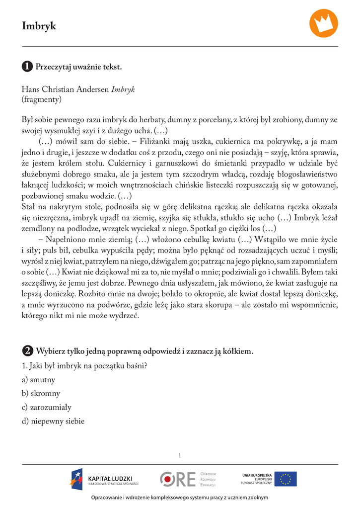 Imbryk 1 Przeczytaj uważnie tekst. Hans Christian Andersen Imbryk (fragmenty) Był sobie pewnego razu imbryk do herbaty, dumny z porcelany, z której był zrobiony, dumny ze swojej wysmukłej szyi i z dużego ucha. (…) (…) mówił sam do siebie. – Filiżanki mają uszka, cukiernica ma pokrywkę, a ja mam jedno i drugie, i jeszcze w dodatku coś z przodu, czego oni nie posiadają – szyję, która sprawia, że jestem królem stołu. Cukiernicy i garnuszkowi do śmietanki przypadło w udziale być służebnymi dobrego smaku, ale ja jestem tym szczodrym władcą, rozdaję błogosławieństwo łaknącej ludzkości; w moich wnętrznościach chińskie listeczki rozpuszczają się w gotowanej, pozbawionej smaku wodzie. (…) Stał na nakrytym stole, podnosiła się w górę delikatna rączka; ale delikatna rączka okazała się niezręczna, imbryk upadł na ziemię, szyjka się stłukła, stłukło się ucho (…) Imbryk leżał zemdlony na podłodze, wrzątek wyciekał z niego. Spotkał go ciężki los (…) – Napełniono mnie ziemią; (…) włożono cebulkę kwiatu (…) Wstąpiło we mnie życie i siły; puls bił, cebulka wypuściła pędy; można było pęknąć od rozsadzających uczuć i myśli; wyrósł z niej kwiat, patrzyłem na niego, dźwigałem go; patrząc na jego piękno, sam zapomniałem o sobie (…) Kwiat nie dziękował mi za to, nie myślał o mnie; podziwiali go i chwalili. Byłem taki szczęśliwy, że jemu jest dobrze. Pewnego dnia usłyszałem, jak mówiono, że kwiat zasługuje na lepszą doniczkę. Rozbito mnie na dwoje; bolało to okropnie, ale kwiat dostał lepszą doniczkę, a mnie wyrzucono na podwórze, gdzie leżę jako stara skorupa – ale zostało mi wspomnienie, którego nikt mi nie może wydrzeć. 2 Wybierz tylko jedną poprawną odpowiedź i zaznacz ją kółkiem. 1. Jaki był imbryk na początku baśni? a) smutny b) skromny c) zarozumiały d) niepewny siebie 1 2. Imbryk stłukł się, ponieważ... a) nalano do niego wrzątku. b) był niezdarny. c) ktoś go upuścił. d) zemdlał. 3. Jaka roślinka wyrosła w stłuczonym imbryku? a) zielony szczypiorek b) piękny kwiat c) listeczek w kształcie serca d) pękata cebulka 4. Za co kwiat podziękował imbrykowi? a) za szlachetne serce b) za wygodną doniczkę c) za dobrą ziemię d) kwiat nie podziękował imbrykowi 5. Imbryk, służąc pięknemu kwiatuszkowi za doniczkę, czuł się... a) zmęczony. b) szczęśliwy. c) zapomniany. d) rozgoryczony. 6. Jaka mądrość wypływa z baśni? a) Należy myśleć tylko o sobie. b) Uroda jest w życiu najważniejsza. c) Nie warto poświęcać się dla innych. d) Gdy żyjemy dla innych, wzbogacamy siebie. 2