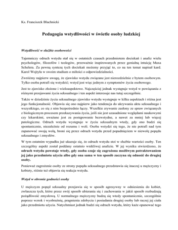 Ks. Franciszek Blachnicki Pedagogia wstydliwości w świetle osoby ludzkiej Wstydliwość w służbie osobowości Tajemniczy odruch wstydu stał się w ostatnich czasach przedmiotem dociekań i analiz wielu psychologów, filozofów i teologów, przeważnie inspirowanych przez genialną intuicję Maxa Schelera. Za pewną syntezę tych dociekań możemy przyjąć to, co na ten temat napisał kard. Karol Wojtyła w swoim studium o miłości o odpowiedzialności. Zwróćmy najpierw uwagę, że zjawisko wstydu związane jest nierozdzielnie z bytem osobowym. Tylko osoba potrafi się wstydzić; wstyd jest więc jednym z symptomów życia osobowego. Jest to zjawisko złożone i wieloaspektowe. Najczęściej jednak występuje wstyd w powiązaniu z różnymi przejawami życia seksualnego i ten aspekt interesuje nas tutaj szczególnie. Także w dziedzinie życia seksualnego zjawisko wstydu występuje w kilku aspektach i różna jest jego funkcjonalność. Objawia się ono najpierw jako tendencja do ukrywania aktu seksualnego i wszystkiego, co się z nim bezpośrednio łączy. Wszelkie zrywanie zasłony ze spraw związanych z biologicznym procesem przekazywania życia, jeśli nie jest uzasadnione względami naukowymi czy lekarskimi, uważane jest za postępowanie bezwstydne, a nawet za mniej lub więcej patologiczne. Odruch wstydu występuje w życiu seksualnym wtedy, gdy ono budzi się spontanicznie, niezależnie od rozumu i woli. Osoba wstydzi się tego, że nie potrafi nad tym zapanować swoją wolą, broni się przez odruch wstydu przed popadnięciem w niewolę popędu seksualnego i zmysłów. W tym ostatnim wypadku już ukazuje się, że odruch wstydu stoi w służbie wartości osoby. Ten szczególny aspekt został poddany ostatnio wnikliwej analizie. W jej wyniku stwierdzono, że odruch wstydu powstaje wtedy, gdy osoba czuje się zagrożona możliwym potraktowaniem jej jako przedmiotu użycia albo gdy ona sama w ten sposób zaczyna się odnosić do drugiej osoby. Ponieważ zagrożenie osoby ze strony popędu seksualnego przedstawia się inaczej u mężczyzny i kobiety, różnie też objawia się reakcja wstydu. Wstyd w obronie godności osoby U mężczyzn popęd seksualny przejawia się w sposób agresywny w odniesieniu do kobiet, zwłaszcza tych, które przez swój sposób ubierania się i zachowania w jakiś sposób rozbudzają pożądliwość zmysłową. U normalnego mężczyzny budzą się wtedy spontanicznie, szczególnie poprzez wzrok i wyobraźnię, pragnienia zdobycia i posiadania drugiej osoby lub raczej jej ciała jako przedmiotu użycia. Natychmiast jednak budzi się odruch wstydu, który każe opanować tego Blachnicki Pedagogia wstydliwosci.rtf 2 rodzaju pożądania. W szczególności odruch wstydu prowadzi do opanowania wzroku i wyobraźni. W ten sposób wstyd ratuje godność osoby, która dystansuje się od spontanicznych pożądań zmysłowej natury. Mężczyzna więc wstydzi się tego, że odnosi się w sposób czynny do drugiej osoby jako możliwego przedmiotu użycia. Kobieta natomiast na ogół nie przeżywa swej seksualności w formie agresywnej w stosunku do mężczyzny, nie budzą się w niej pragnienia posiadania w stosunku do ciała mężczyzny. Natomiast fakt, że ona jest przedmiotem zainteresowania i pożądania ze strony mężczyzny, pobudza z kolei jej własny popęd seksualny. Tym tłumaczy się chęć zwrócenia na siebie uwagi, przyciągania wzroku mężczyzny przez odpowiedni sposób ubierania się i zachowania. Wobec tych tendencji, instynktownych i spontanicznych, znów budzi się reakcja wstydu, stając w obronie godności osoby. Reakcja wstydu wskazuje na to, że sam fakt znalezienia się w świadomości drugiego w charakterze możliwego przedmiotu użycia poniża osobę w swej godności. Stąd reakcja samoobrony, wyrażająca się w przysłanianiu wszystkiego, co może rozbudzić u mężczyzn seksualną pożądliwość. Powyższa funkcjonalność wstydu tłumaczy, dlaczego u kobiet problem wstydu i wstydliwości występuje przede wszystkim w związku z problemem ubierania się i mody. Moda kobieca bowiem, poprzez obnażanie czy uwydatnianie w inny sposób wartości ciała kobiety, staje na usługach seksualnych upodobań męskich i stąd potrzebna jest miarkująca funkcja wstydu, nie pozwalająca na to, by ciało kobiety stało się dla mężczyzny przedmiotem użycia, chociażby tylko dla wzroku czy wyobraźni. Absorbcja wstydu przez miłość Jak głęboko odruch wstydu związany jest z wartością i godnością osoby, o tym świadczy inny, zaobserwowany fakt, określony jako absorbcja wstydu przez miłość. Tam bowiem, gdzie pomiędzy mężczyzną a niewiastą zawiązuje się prawdziwa miłość, miłość osobowa, polegająca na wzajemnym pragnieniu oddania siebie, zanika odruch wstydu. Jego funkcja obronna staje się niepotrzebna tam, gdzie osoba aktualizuje się zgodnie ze swoją naturą i swoim powołaniem. Wstyd jednakże wtedy nie zanika zupełnie, ale objawia się w innej postaci, jakby przyjmuje nowe zadania w służbie godności osoby. Funkcja jego wyraża się w ukrywaniu wobec innych i niepowołanych świadków tego wszystkiego, co należy do intymnego zakresu prawdziwej miłości i przyjaźni. Należy to bowiem do istotnych rysów osoby, że jest ona zamknięta w swojej świadomości dla wszelkiego zewnętrznego poznania. Osoba objawia tajemnicę swego wnętrza (a tą tajemnicą jest przede wszystkim miłość) tylko wtedy, gdy sama zechce i komu zechce. A tylko ten jest godny przyjąć tajemnicę osoby, kto sam gotów jest otworzyć się wobec niej ze swoją tajemnicą. Spotkanie się dwóch osób w miłości jest przeżywane przez nie jako coś świętego, co musi być ukryte wobec ciekawości postronnych osób. I tutaj właśnie znów występuje wstyd na straży tajemnicy i godności osoby. Z powyższych rozważań wynika, jak ściśle związana jest wstydliwość z wartością osoby, z tym zwłaszcza jej istotnym rysem, że nie może 
