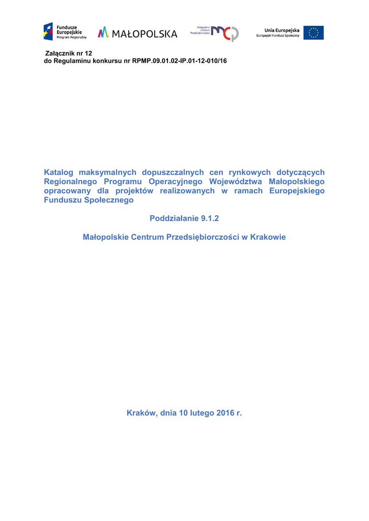 Załącznik nr 12 do Regulaminu konkursu nr RPMP.09.01.02-IP.01-12-010/16 Katalog maksymalnych dopuszczalnych cen rynkowych dotyczących Regionalnego Programu Operacyjnego Województwa Małopolskiego opracowany dla projektów realizowanych w ramach Europejskiego Funduszu Społecznego Poddziałanie 9.1.2 Małopolskie Centrum Przedsiębiorczości w Krakowie Kraków, dnia 10 lutego 2016 r. Wprowadzenie Katalog maksymalnych dopuszczalnych cen rynkowych przykładowych towarów i usług w projektach konkursowych dla Zgodnie z podrozdziałem 8.2 pkt 10 Podręcznika kwalifikowania wydatków objętych dofinansowaniem w ramach Regionalnego Programu Operacyjnego Województwa Małopolskiego na lata 2014-2020, właściwa instytucja będąca stroną umowy jest zobowiązana do określenia cen rynkowych w zakresie najczęściej finansowanych wydatków w odniesieniu do danej grupy projektów w ramach RPO WM oraz - o ile dotyczy – innych wymagań, w tym oczekiwanego standardu realizacji tego typu usług. 1. W katalogu określono maksymalne ceny dla najczęściej występujących kosztów w projektach finansowanych z EFS. 2. Określenia maksymalnych cen rynkowych dokonano w oparciu o rozeznanie rynku polegające, co do zasady, na przeanalizowaniu co najmniej trzech ofert dla każdej kategorii kosztu, analizie cenników na stronach internetowych, jak również dotychczasowego doświadczenia we wdrażaniu projektów współfinansowanych w ramach EFS oraz zaleceń IZ. 3. Ceny ujęte w katalogu służą do oceny kwalifikowalności planowanych wydatków. 4. Ocena kwalifikowalności wydatków w zakresie ich efektywności, racjonalności z zachowaniem zasad uzyskiwania najlepszych efektów z danych nakładów będzie również dokonywana podczas weryfikacji wniosków o płatność oraz kontroli na miejscu realizacji projektu. 5. Proces weryfikacji i oceny budżetu projektu jest dokonywany przez pryzmat realizowanych w projekcie zadań, określonych celów, rezultatów oraz wielu innych czynników, w związku z powyższym przyjęcie maksymalnej dopuszczalnej ceny nie oznacza automatycznego akceptowania pozycji budżetowych oraz ich wysokości przez oceniających i rozliczających projekt. 2|Strona Szkolenia/Kursy - minimalny standard usług Każde szkolenie/kurs musi prowadzić do uzyskania kwalifikacji1 lub nabycia kompetencji2 potwierdzonych odpowiednim dokumentem. Po zakończeniu realizacji szkolenia/kursu należy dokonać walidacji3 przyswojonej wiedzy lub uzyskanych kwalifikacji czy kompetencji. Definicję kompetencji określono w Wytycznych w zakresie monitorowania postępu rzeczowego realizacji programów operacyjnych na lata 2014-2020. Zgodnie z nią fakt nabycia kompetencji będzie weryfikowany w ramach następujących etapów: a) ETAP I – Zakres – zdefiniowanie w ramach wniosku o dofinansowanie lub w regulaminie konkursu grupy docelowej do objęcia wsparciem oraz wybranie obszaru interwencji EFS, który będzie poddany ocenie, b) ETAP II – Wzorzec – zdefiniowanie we wniosku o dofinansowanie lub w regulaminie konkursu standardu wymagań, tj. efektów uczenia się, które osiągną uczestnicy w wyniku przeprowadzonych działań projektowych, c) ETAP III – Ocena – przeprowadzenie weryfikacji na podstawie opracowanych kryteriów oceny po zakończeniu wsparcia udzielanego danej osobie, d) ETAP IV – Porównanie – porównanie uzyskanych wyników etapu III (ocena) z przyjętymi wymaganiami (określonymi na etapie II efektami uczenia się) po zakończeniu wsparcia udzielanego danej osobie. Szkolenia/kursy muszą być zgodne ze zdiagnozowanymi potrzebami i potencjałem uczestnika projektu. Powinny uwzględniać specyfikę wewnątrzregionalną i posiadać związek z rzeczywistymi potrzebami na określone kwalifikacje i umiejętności na regionalnym lub lokalnym rynku pracy (szczególnie na podstawie badań i analizie rynku pracy, w tym inteligentnych specjalizacji regionu, zawodów nadwyżkowych i deficytowych). Szkolenia/kursy powinny być realizowane w sposób zapewniający odpowiednią jakość wsparcia. W Małopolsce stworzono system zapewnienia jakości kształcenia, w ramach którego instytucje szkoleniowe mogą uzyskać znak jakości Małopolskie Standardy Usług Edukacyjno – Szkoleniowych (MSUES). W przypadku gdy realizator szkolenia/kursu nie posiada znaku jakości MSUES zaleca się aby szkolenia uwzględniały poniższe wymogi jakościowe: 1. szkolenie/kurs powinno być dopasowane do poziomu uczestników – obowiązkowe jest zbadanie wyjściowego poziomu kompetencji rozwijanych w trakcie szkolenia/kursu i dostosowanie do nich programu szkoleniowego oraz wykorzystanych metod nauczania, 2. program szkoleniowy/kursu powinien zostać opisany w języku efektów uczenia się, 3. oferowane przez realizatora materiały wspomagające kształcenie (np. skrypty, prezentacje, filmy) są wykorzystywane w sposób respektujący prawo autorskie, Kwalifikacje należy rozumieć jako formalny wynik oceny i walidacji, który uzyskuje się w sytuacji, kiedy właściwy organ uznaje, że dana osoba osiągnęła efekty uczenia się spełniające określone standardy. 2 Kompetencje należy rozumieć jako udowodnioną zdolność wykorzystywania wiedzy, kwalifikacji oraz umiejętności indywidualnych, społecznych i/lub metodologicznych w pracy lub nauce oraz rozwoju zawodowym i osobistym. 3 Walidacja to proces sprawdzania, czy – niezależnie od sposobu uczenia się – kompetencje wymagane dla danej kwalifikacji zostały osiągnięte. Walidacja obejmuje identyfikację i dokumentację posiadanych kompetencji oraz ich weryfikację w odniesieniu do wymagań określonych dla kwalifikacji. 1 3|Strona 4. dokumentacja szkolenia/kursu musi obejmować: raporty podsumowujące ocenę efektów uczenia się, program szkolenia/kursu (tematy zajęć, harmonogram zajęć - w tym wymiar godzinowy, metody szkolenia), materiały szkoleniowe, listy obecności, dzienniki zajęć, protokół z egzaminów, testów, ankiet, kopii za