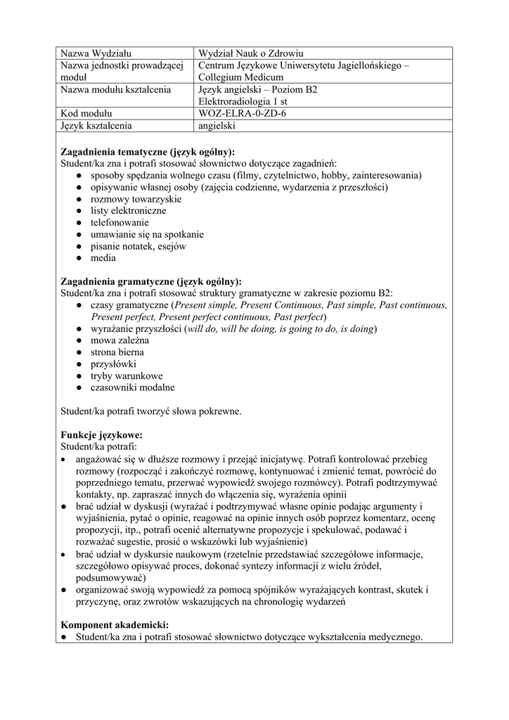 Nazwa Wydziału Nazwa jednostki prowadzącej moduł Nazwa modułu kształcenia Kod modułu Język kształcenia Wydział Nauk o Zdrowiu Centrum Językowe Uniwersytetu Jagiellońskiego – Collegium Medicum Język angielski – Poziom B2 Elektroradiologia 1 st WOZ-ELRA-0-ZD-6 angielski Zagadnienia tematyczne (język ogólny): Student/ka zna i potrafi stosować słownictwo dotyczące zagadnień: ● sposoby spędzania wolnego czasu (filmy, czytelnictwo, hobby, zainteresowania) ● opisywanie własnej osoby (zajęcia codzienne, wydarzenia z przeszłości) ● rozmowy towarzyskie ● listy elektroniczne ● telefonowanie ● umawianie się na spotkanie ● pisanie notatek, esejów ● media Zagadnienia gramatyczne (język ogólny): Student/ka zna i potrafi stosować struktury gramatyczne w zakresie poziomu B2: ● czasy gramatyczne (Present simple, Present Continuous, Past simple, Past continuous, Present perfect, Present perfect continuous, Past perfect) ● wyrażanie przyszłości (will do, will be doing, is going to do, is doing) ● mowa zależna ● strona bierna ● przysłówki ● tryby warunkowe ● czasowniki modalne Student/ka potrafi tworzyć słowa pokrewne. Funkcje językowe: Student/ka potrafi: angażować się w dłuższe rozmowy i przejąć inicjatywę. Potrafi kontrolować przebieg rozmowy (rozpocząć i zakończyć rozmowę, kontynuować i zmienić temat, powrócić do poprzedniego tematu, przerwać wypowiedź swojego rozmówcy). Potrafi podtrzymywać kontakty, np. zapraszać innych do włączenia się, wyrażenia opinii ● brać udział w dyskusji (wyrażać i podtrzymywać własne opinie podając argumenty i wyjaśnienia, pytać o opinie, reagować na opinie innych osób poprzez komentarz, ocenę propozycji, itp., potrafi ocenić alternatywne propozycje i spekulować, podawać i rozważać sugestie, prosić o wskazówki lub wyjaśnienie) brać udział w dyskursie naukowym (rzetelnie przedstawiać szczegółowe informacje, szczegółowo opisywać proces, dokonać syntezy informacji z wielu źródeł, podsumowywać) ● organizować swoją wypowiedź za pomocą spójników wyrażających kontrast, skutek i przyczynę, oraz zwrotów wskazujących na chronologię wydarzeń Komponent akademicki: ● Student/ka zna i potrafi stosować słownictwo dotyczące wykształcenia medycznego. ● Zna i potrafi wykorzystać źródła wiedzy ogólnej i medycznej (np. strony internetowe, słowniki, podręczniki). Komponent specjalistyczny: Student/ka zna i potrafi stosować słownictwo w zakresie następujących zagadnień: terminologia specjalistyczna z zakresu języka medycznego z dziedziny specjalizacji (m.in. specjalizacje w dziedzinie radiologii, skróty medyczne, rodzaje badań i zabiegów, stosowane typy leków, aparatura specjalistyczna, opis przypadku) środowisko szpitalne (m.in. części szpitala, wyposażenie, stanowiska pracy, specjalizacje medyczne) anatomia i fizjologia ciała ludzkiego (m.in. części ciała, pozycje anatomiczne, budowa i funkcje najważniejszych układów anatomicznych, czynności fizjologiczne) obowiązki elektroradiologa w diagnostyce (m.in. sporządzanie raportów, opisów badań, notatek, instrukcji; rozmowa z pacjentem i personelem medycznym) metody diagnostyczne w medycynie i elektroradiologii jednostki chorobowe i symptomy specjalistyczny warsztat pracy (narzędzia i urządzenia, aparatura medyczna i elektromedyczna, części garderoby) udzielanie pierwszej pomocy edukacja medyczna, promocja i ochrona zdrowia w Polsce i innych krajach współczesne doniesienia naukowe z dziedziny medycyny i elektroradiologii szukanie pracy w sektorze medycznym w Polsce i innych krajach Mówienie Student/ka potrafi: w zakresie życia codziennego: ● zrelacjonować treść książki lub filmu i wyrazić swoją opinię ● opowiedzieć na temat ważnych wydarzeń swojego życia ● opowiedzieć o swoich codziennych zajęciach i zadać pytania dotyczące codziennego życia innej osoby ● brać udział w dyskusji (wyrażać i podtrzymywać własne opinie podając argumenty i wyjaśnienia, pytać o opinie, reagować na opinie innych osób poprzez komentarz, ocenę propozycji, itp., potrafi ocenić alternatywne propozycje i spekulować, podawać i rozważać sugestie, prosić o wskazówki lub wyjaśnienie) w zakresie języka specjalistycznego: ● wymienić płynnie i z prawidłową wymową w języku angielskim medycznym i potocznym nazwy części ciała, nazwy organów wewnętrznych oraz nazwy układów anatomicznych oraz opisać ich lokalizację ● płynnie opisać budowę i funkcjonowanie najważniejszych układów anatomicznych oraz wybrane procesy fizjologiczne ● opisywać sposoby leczenia ● opisywać jednostkę chorobową i jej symptomy ● prezentować opis przypadku ● komunikować się z personelem medycznym (pielęgniarka, lekarz pierwszego kontaktu, lekarz specjalista, technik), m.in.: dość płynnie i ze szczegółami przedstawiać historię choroby, przedstawiać studium przypadku, wyrażać swój punkt widzenia i stosować klarowną argumentację w dyskusji na tematy medyczne podkreślając istotne treści i podając przykłady, płynnie odpowiadać na szczegółowe pytania personelu medycznego, udzielać instrukcji i wyjaśnień, wydawać polecenia, informować o zmianach, komplikacjach, itp. ● w sposób zwięzły i przejrzysty opisać badanie/procedurę ● przedstawić spójny opis podstawowych zmian chorobowych obserwowanych w badaniu ● opisać szczegółowo swoje plany na przyszłość w zakresie kariery zawodowej, wyboru specjalizacji oraz przedstawić dotychczasowe osiągnięcia w dziedzinie specjalizacji (tok studiów, ukończone dodatkowe kursy, staże zagraniczne, udział w konferencjach, projektach, itp.) ● komunikować się z pacjentem i/lub jego rodziną, m.in.: przeprowadzać wywiad, informować na temat badania lub procedury, prowadzić rozmowę przy udzielaniu pierwszej pomocy, podawaniu leków, ułożeniu pacjenta do badań, 